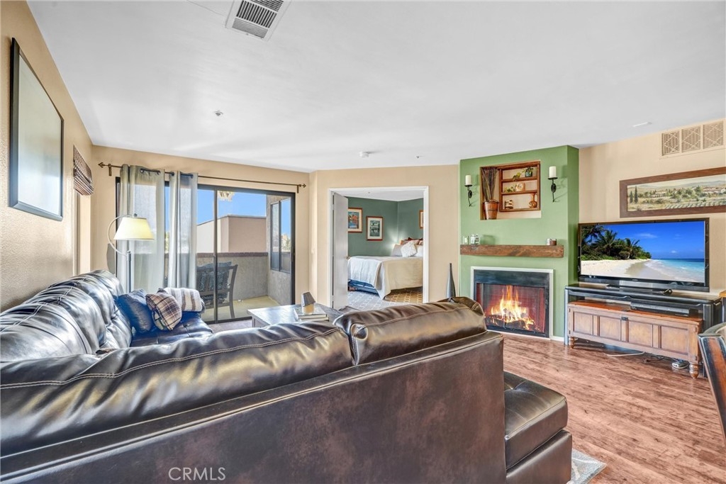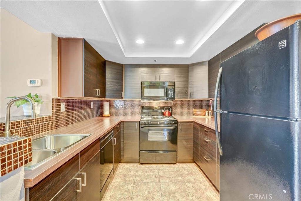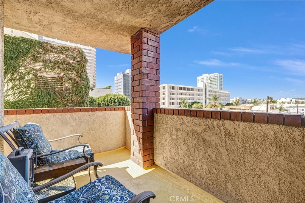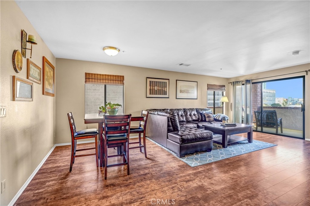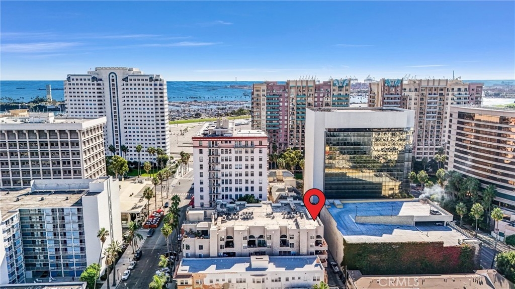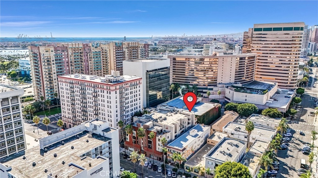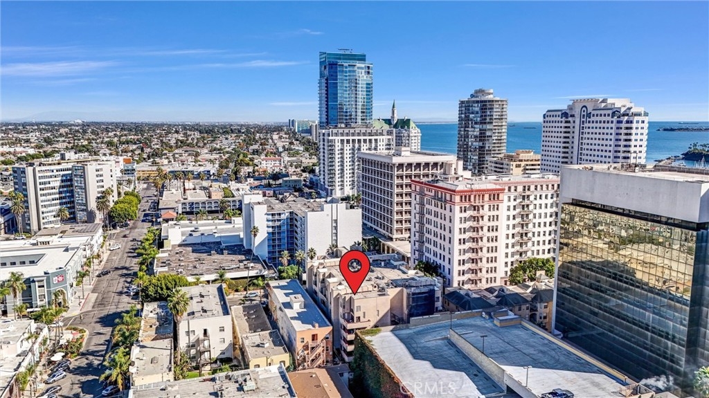 Located in the vibrant East Village Arts District, this bright and spacious one-bedroom, one-bathroom corner condominium offers 747 square feet of contemporary elegance infused with the dynamic energy of Downtown Long Beach. With only one shared wall, the layout provides added privacy, while expansive windows bathe the open-concept living space in natural light, creating a warm and inviting atmosphere. Recently updated with new heating and air conditioning, this home ensures year-round comfort. The kitchen is both functional and stylish, featuring black appliances, soft-close cabinets, faux wood countertops, and a striking amber glass tile backsplash, all illuminated by sleek recessed lighting. A breakfast bar connects the kitchen to the dining and living areas, perfect for entertaining. Custom window coverings, laminate wood flooring, and a cozy fireplace enhance the ambiance, while an L-shaped, covered balcony provides ample space for outdoor relaxation. The primary bedroom serves as a tranquil retreat with mirrored closet doors and an updated en suite bathroom. This unit also offers a convenient laundry room with extra storage space—rare for urban living. Two dedicated parking spaces add further value and convenience. Just minutes from the waterfront and pedestrian bike path, this home places you within walking distance of Shoreline Village, Pine Avenue, independent boutiques, restaurants, galleries, and the Long Beach Performing Arts Center, along with easy access to public transit. The building features a secured lobby, elevator, bike storage, and five guest parking spaces. HOA dues cover water, basic cable and internet, trash, and recycling, ensuring a low-maintenance lifestyle. For those seeking a private, turnkey sanctuary amid a thriving arts and culture scene, this sundrenched corner condo is the perfect place to call home.