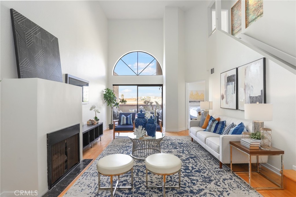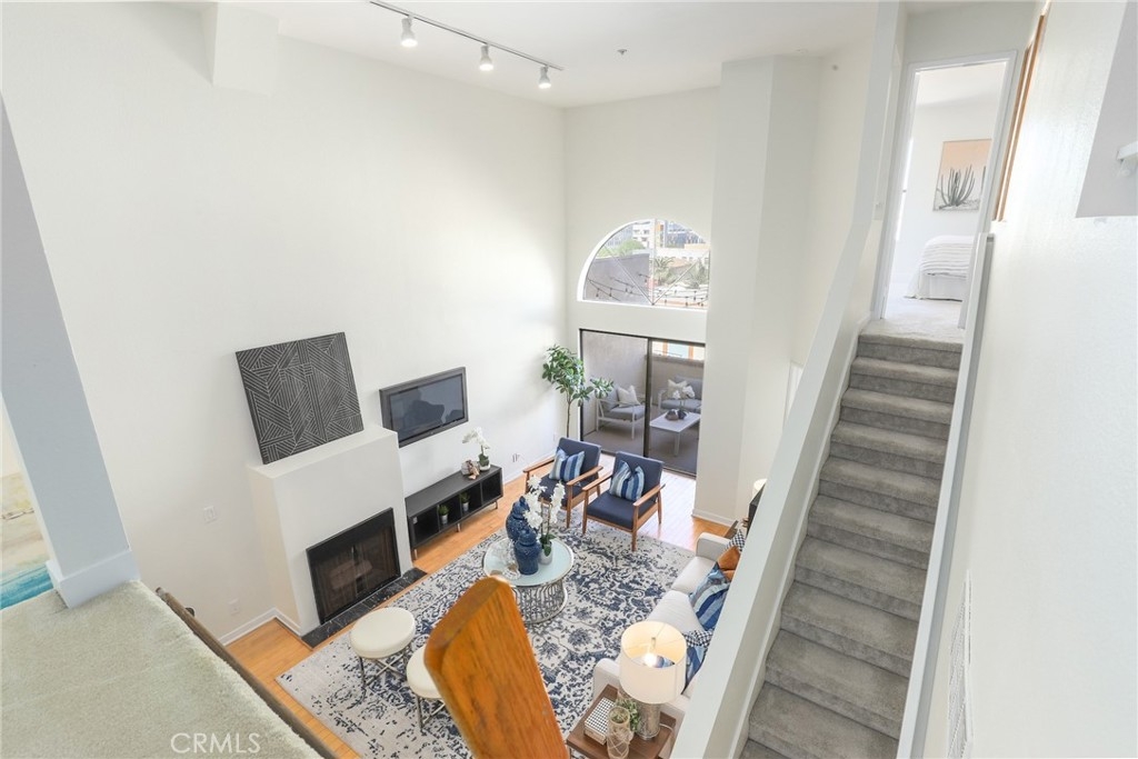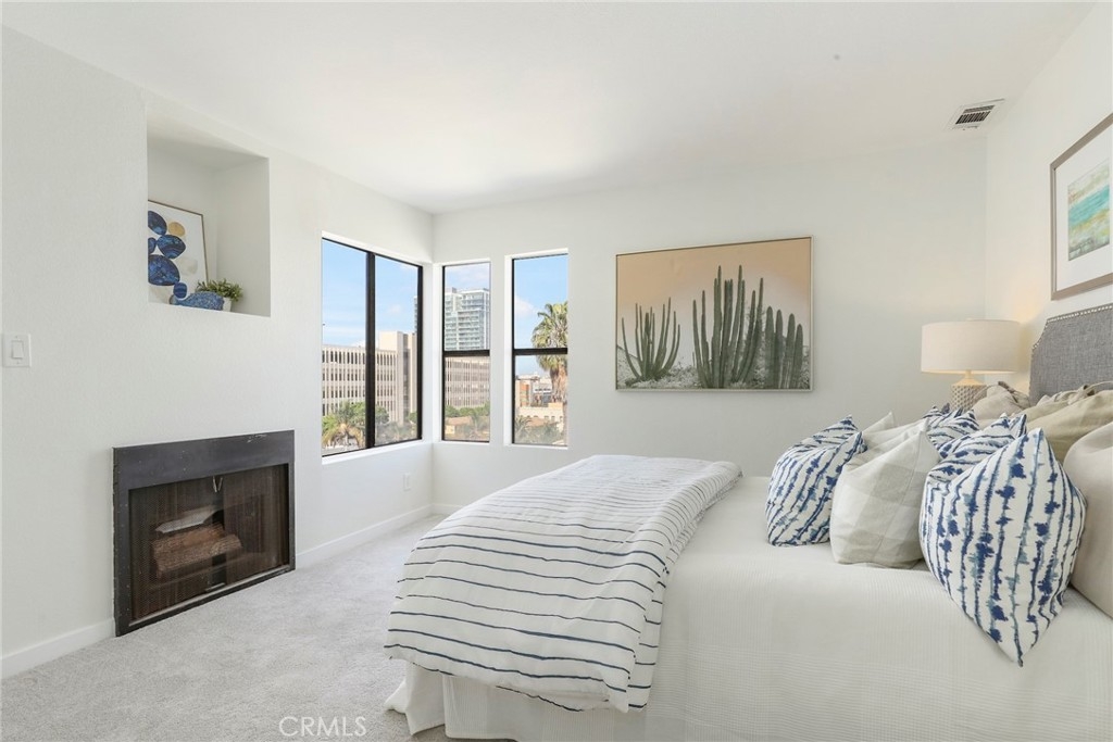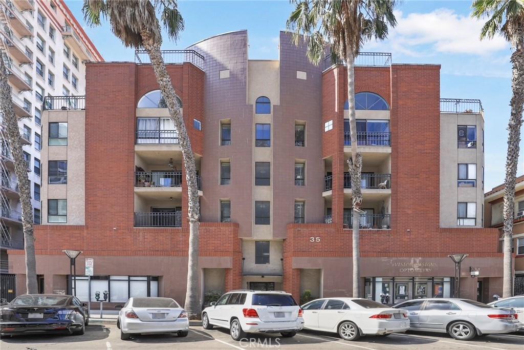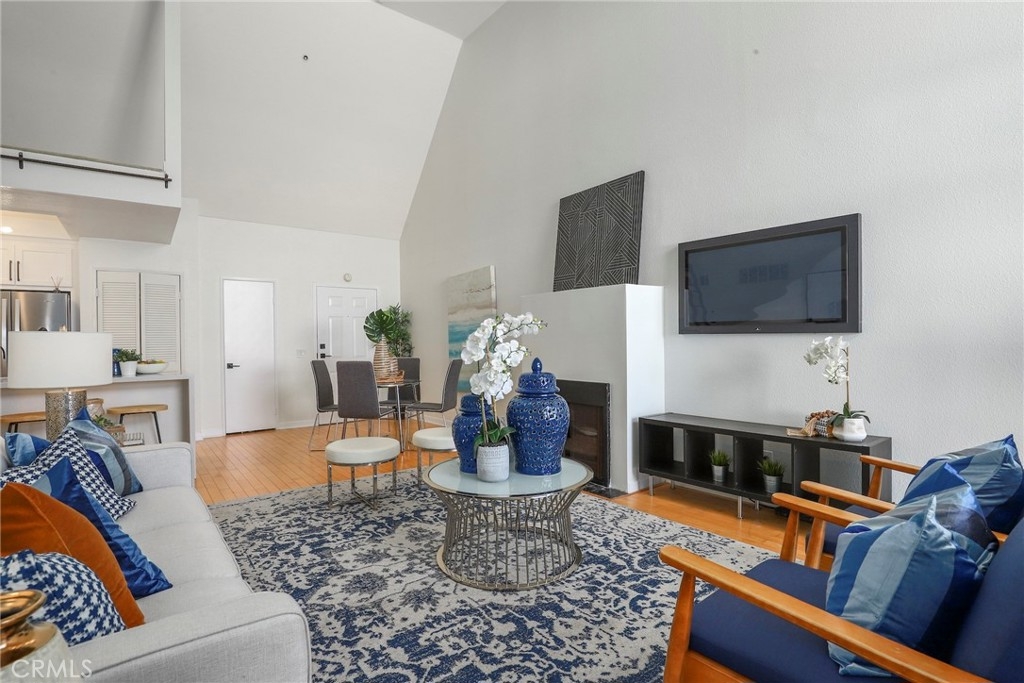 Step into urban sophistication with this chic two-bedroom, two-bath condo featuring a versatile loft space, perfect for downtown living. Upon entering, you’ll be greeted by stunning hardwood floors that lead you to an updated kitchen, complete with sleek countertops, stainless steel appliances, and stylish cabinetry. Adjacent to the kitchen, the dining area flows seamlessly into the spacious living room with the 18 foot high ceiling, where a cozy fireplace invites relaxation. Open the sliding glass door to step onto your private patio, where you’ll enjoy sweeping views of the downtown skyline. The main level includes a generous bedroom with ample closet space and an attached bathroom, while upstairs, the carpeted second bedroom offers privacy and comfort. The loft area provides a perfect spot for a home office, creative space, or lounge area. This condo comes with two convenient tandem parking spaces in the building’s secure underground garage, with additional guest parking and bicycle storage available. Located just moments from shopping, restaurants, the beach, and public transportation, this property puts the best of downtown living right at your doorstep. Don’t miss your chance to call this home!