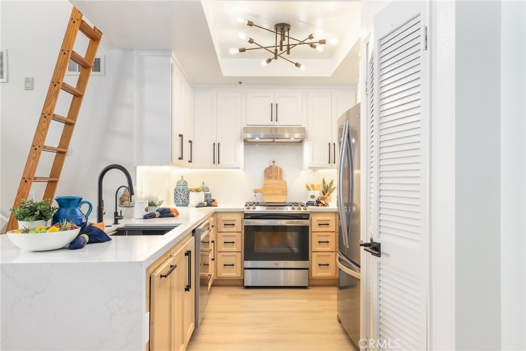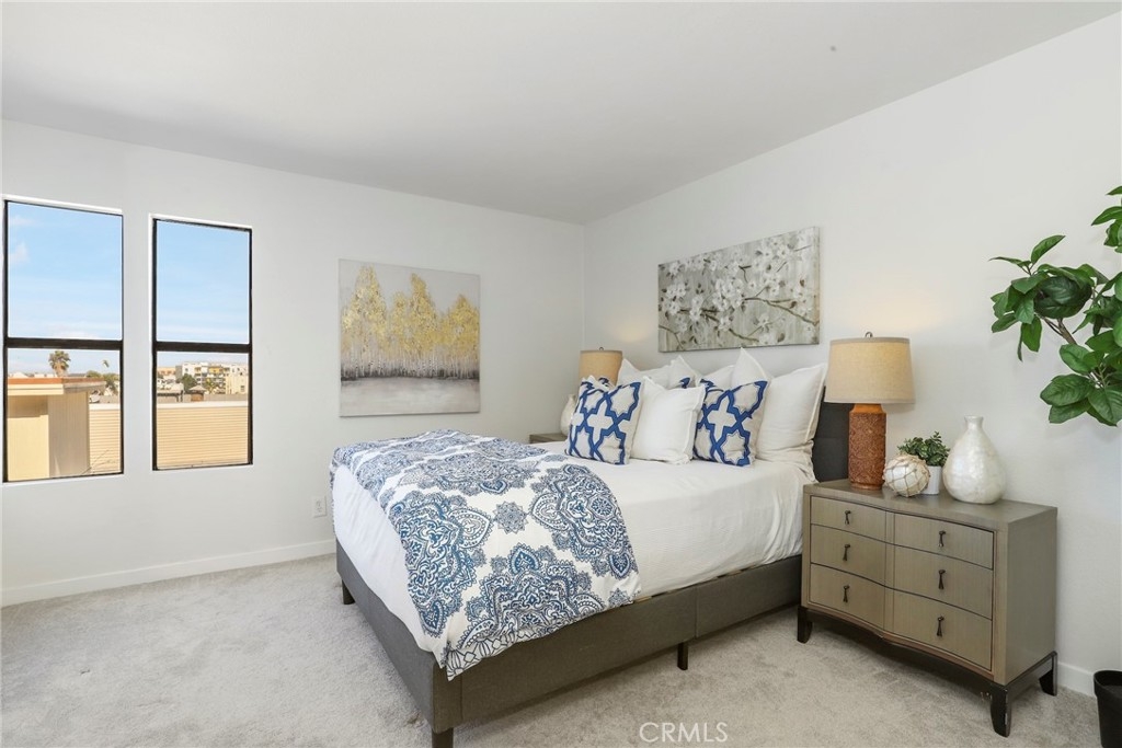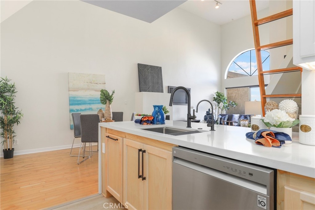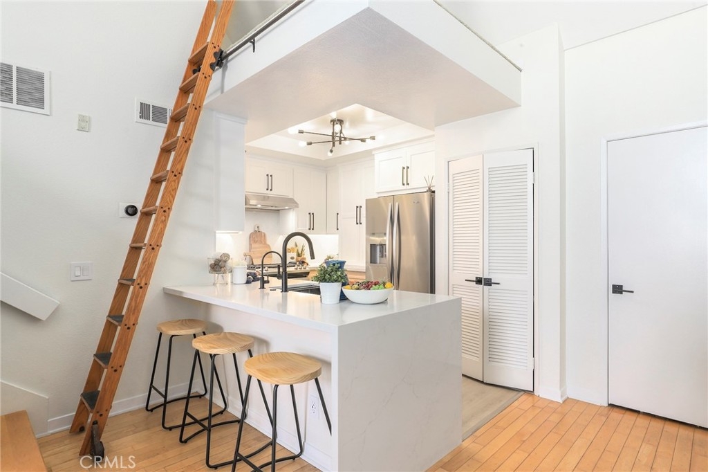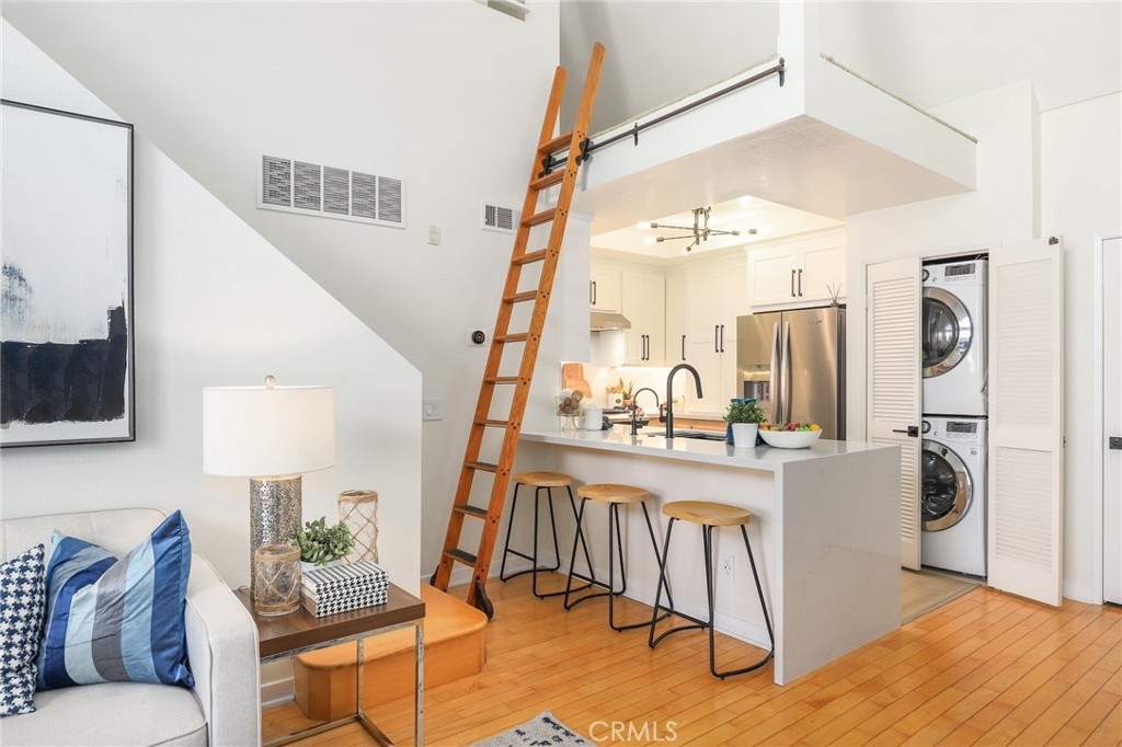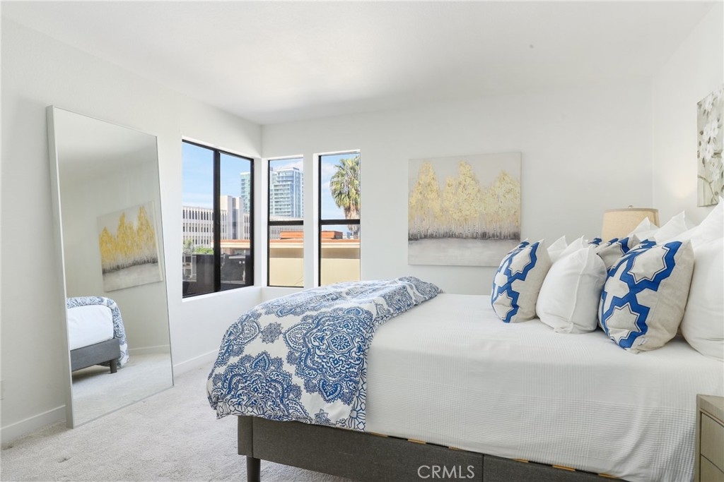 Step into urban sophistication with this chic two-bedroom, two-bath condo featuring a versatile loft space, perfect for downtown living. Upon entering, you’ll be greeted by stunning hardwood floors that lead you to an updated kitchen, complete with sleek countertops, stainless steel appliances, and stylish cabinetry. Adjacent to the kitchen, the dining area flows seamlessly into the spacious living room with the 18 foot high ceiling, where a cozy fireplace invites relaxation. Open the sliding glass door to step onto your private patio, where you’ll enjoy sweeping views of the downtown skyline. The main level includes a generous bedroom with ample closet space and an attached bathroom, while upstairs, the carpeted second bedroom offers privacy and comfort. The loft area provides a perfect spot for a home office, creative space, or lounge area. This condo comes with two convenient tandem parking spaces in the building’s secure underground garage, with additional guest parking and bicycle storage available. Located just moments from shopping, restaurants, the beach, and public transportation, this property puts the best of downtown living right at your doorstep. Don’t miss your chance to call this home!