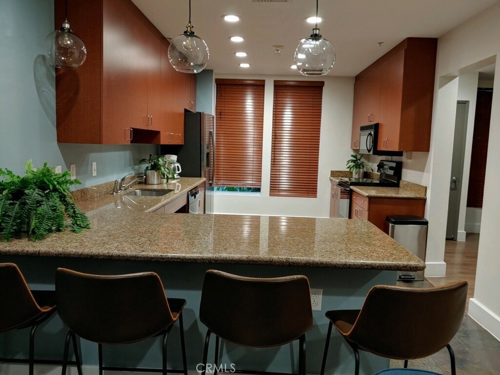 Beautiful 1 bedroom - 1 bathroom condo located on the 4th floor with amazing views of Ocean Blvd and Downtown. This condo is located in The Aqua Towers on Ocean Boulevard, known for their Art Deco designs.This unit features newer and durable wood-look tile flooring in the living room and bedroom, slate flooring in the kitchen, and porcelain tile in the bathroom. The kitchen also has black granite counter tops with a center island, free standing electric range, NEW built-in microwave oven, dishwasher and W/D. HOA fee includes water and free high-speed internet! You pay electric only. The kitchen opens to the living room which opens to one of the largest balconies in the complex. The balcony offers stunning city views both day and night and ample room to relax and take in the endless views of the downtown area. The large master bedroom has a walk-in closet and wonderful city views from its own large balcony. The amenities include 24 hour concierge, Swimming Pool, Sauna, Fitness Center, Business center along with a Banquet Room, Secured Building and underground Parking with 1 assigned parking spot and additional guest parking. Walk to the East Village, Pine Ave, Shoreline Village, and the Pike to enjoy restaurants, cafes, galleries, and nightlife. Stroll to the Rainbow lagoon and the beach for some great outdoor activities, biking, walking, jogging, and jet ski at the Marina. Come home to the mini city by the sea and live The Aqua life of Long Beach. Parking spot #34 P2.