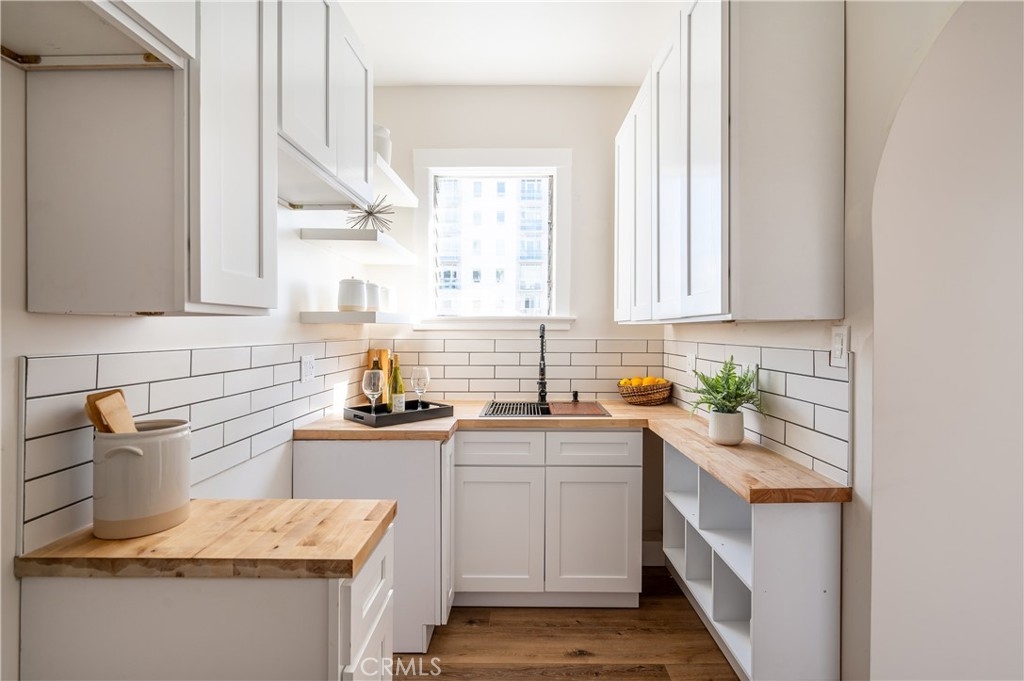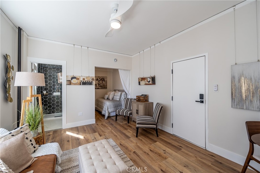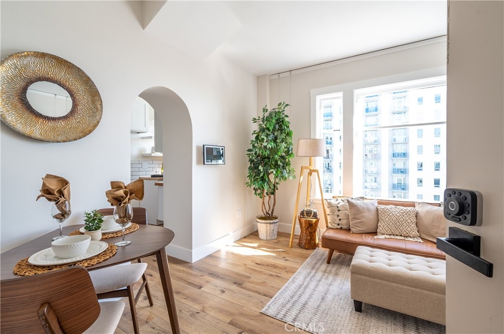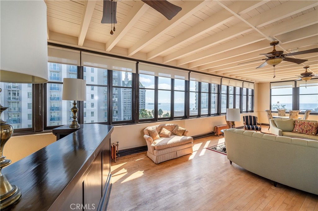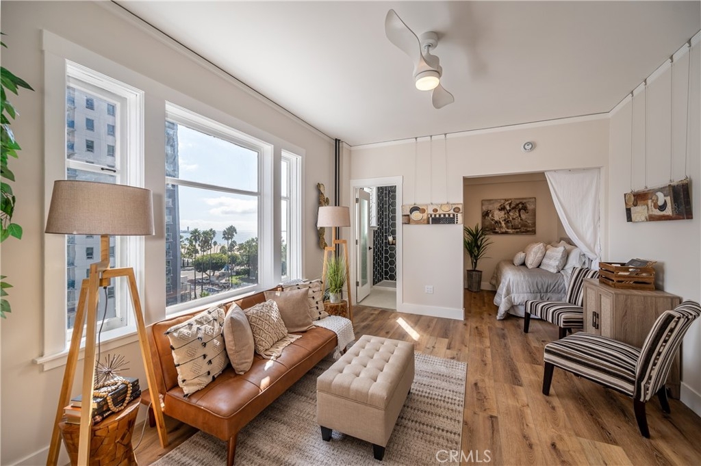 SMART HOME WITH OCEAN VIEWS! Nested in the historic Artaban building in Downtown Long Beach, this junior one-bedroom has been tastefully remodeled and future-proofed with smart features while preserving the charm of this 1920s urban gem. The space has been fully upgraded with new electrical, new plumbing, new vinyl flooring in the living room and kitchen, new cabinets and butcher's block countertops, new walk-in shower, new ceiling fans, new double outlets with USB and USB-C ports, and an additional den that can be used as a bedroom separate from the living area. What truly brings this home to the 21st century and makes it different from others is the addition of smart features throughout. The front door is equipped with a smart doorbell and smart lock that lets you unlock the door with your fingerprint! The smart light switches allow you to turn the lights on and off remotely and dim the lights to create the mood that is right for you. All your smart devices can be controlled from one place using your phone or the wall-mounted Amazon Echo Show 15! With a 15.6'' screen, this smart display has many features including a built-in camera so you can make sure your furry ones are doing well while you are away! The Artaban building is carefully maintained and is part of the historic fabric of Long Beach. It features a lobby with an ornate fireplace and fresco ceilings, a solarium where you can entertain family and guests, a bike room, a well-manicured private garden, and common laundry facilities. With an impressive 94 walking score, this home is steps away from the beach, tons of restaurants and shops, as well as the cultural and financial heart of the city including the Long Beach Convention Center, Pine Street, the Promenade, The Pike Outlets, Shoreline Village, the East Village Arts District, the Performing Arts Center, and Retro Row just to name a few! Come check out the home soon as it won't last long!