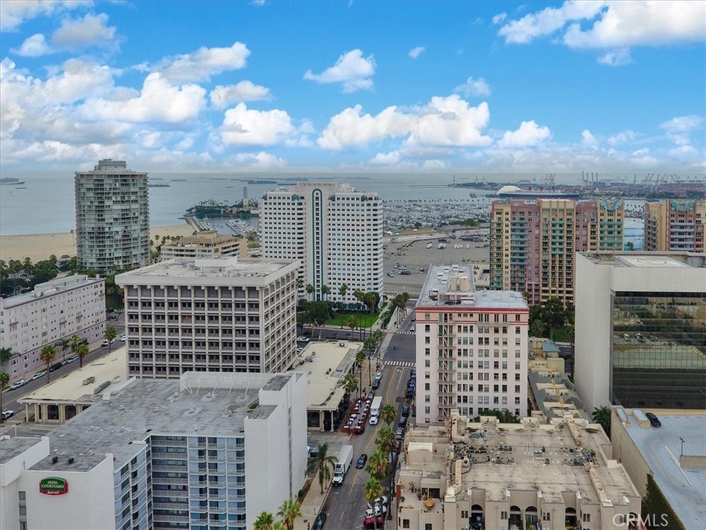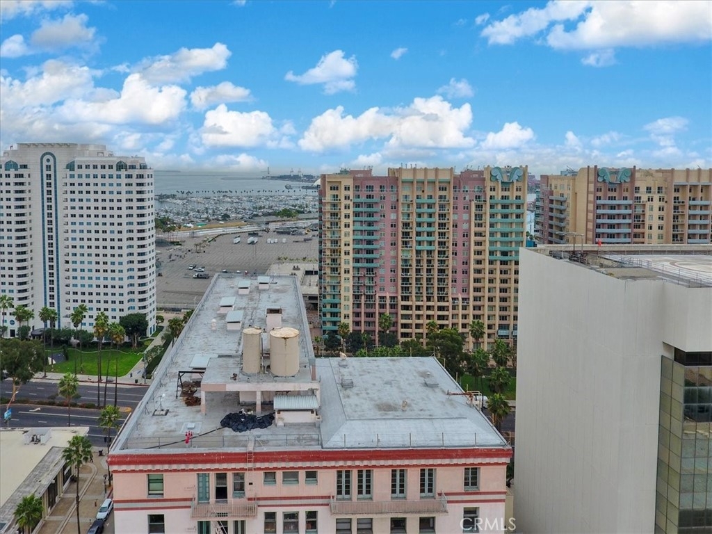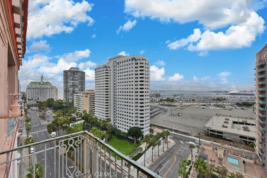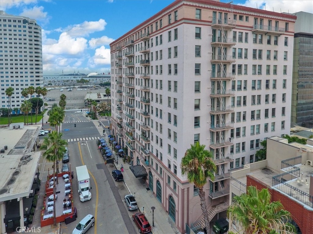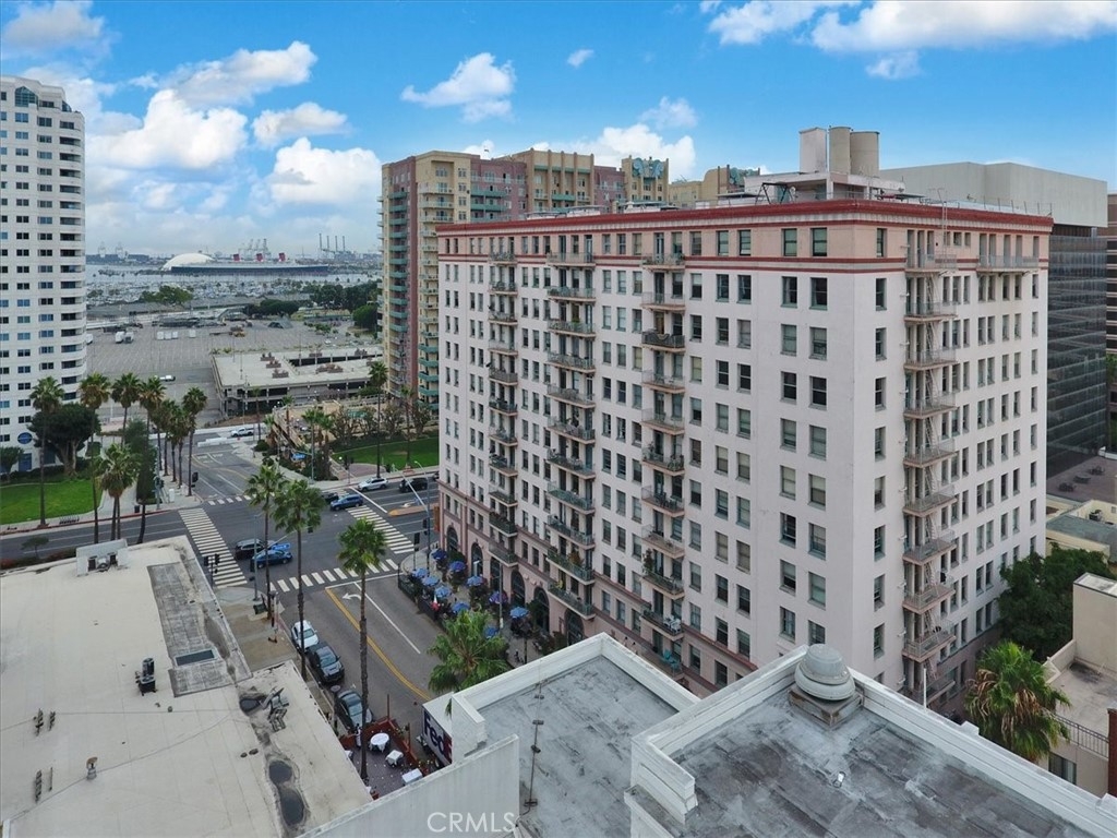 Major Price Reduction! Remodeled corner unit in the historical Cooper Arms Building.Desirable 9th floor location with large windows with views toDowntown LA, mountains and surrounding Downtown Long Beach. Sharing only one wall, this updated unit features an inviting entryway, expanded kitchen with ample storage and stone counters, breakfast/dining bar, beverage refrigerator, wine cubby, French Doors to bedroom with dressing area and attached bathroom. New flooring, baseboards, paint and access to one secured parking space right across the street. Impressive entrance to building which offers a large community living room, onsite property management, outdoor space, community laundry and convenient access to East Village, the Downtown Promenade, and the beach path.