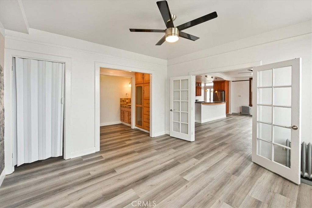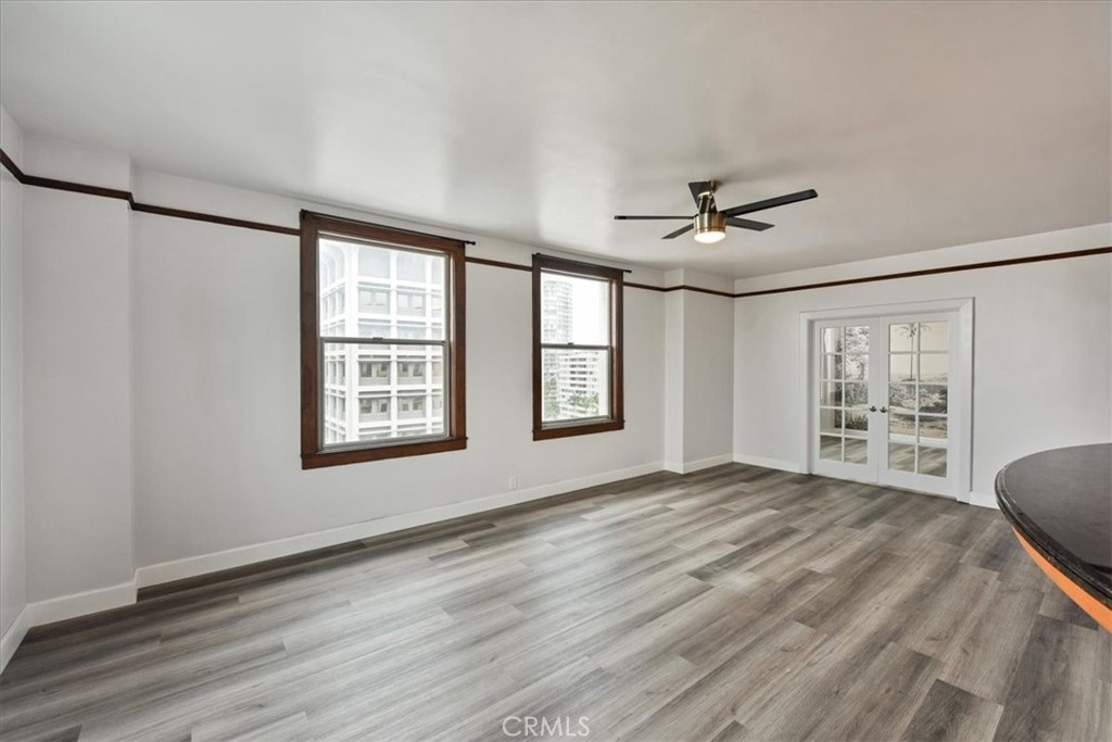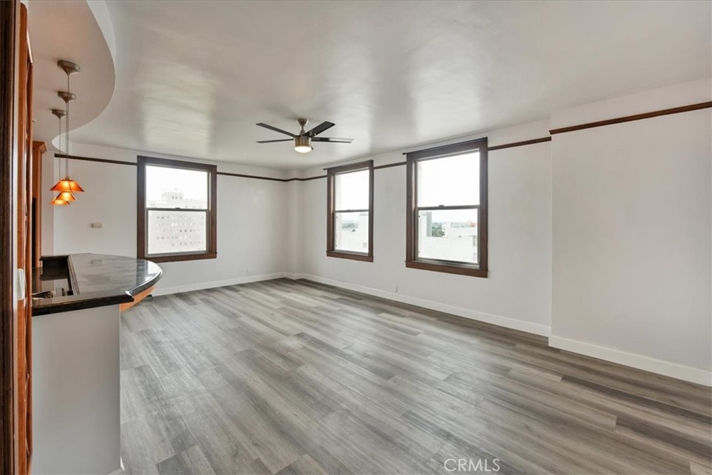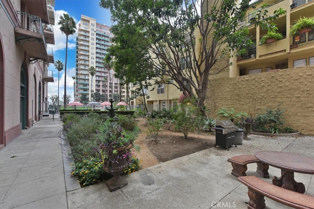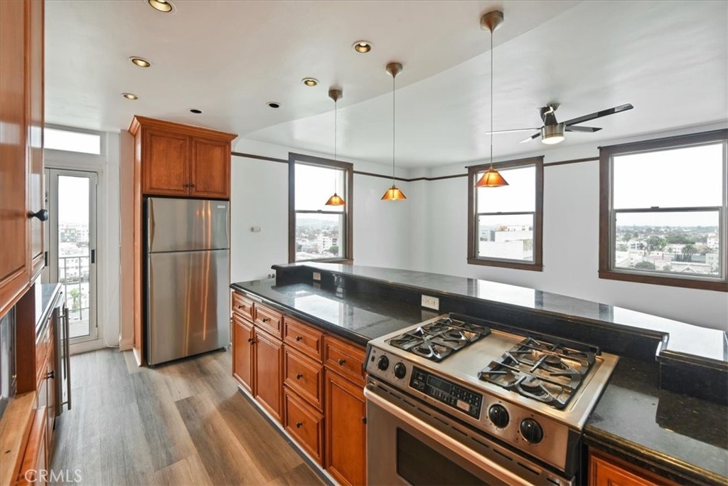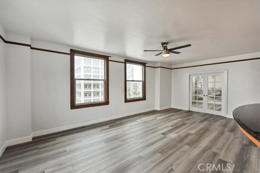 Major Price Reduction! Remodeled corner unit in the historical Cooper Arms Building.Desirable 9th floor location with large windows with views toDowntown LA, mountains and surrounding Downtown Long Beach. Sharing only one wall, this updated unit features an inviting entryway, expanded kitchen with ample storage and stone counters, breakfast/dining bar, beverage refrigerator, wine cubby, French Doors to bedroom with dressing area and attached bathroom. New flooring, baseboards, paint and access to one secured parking space right across the street. Impressive entrance to building which offers a large community living room, onsite property management, outdoor space, community laundry and convenient access to East Village, the Downtown Promenade, and the beach path.