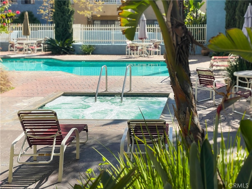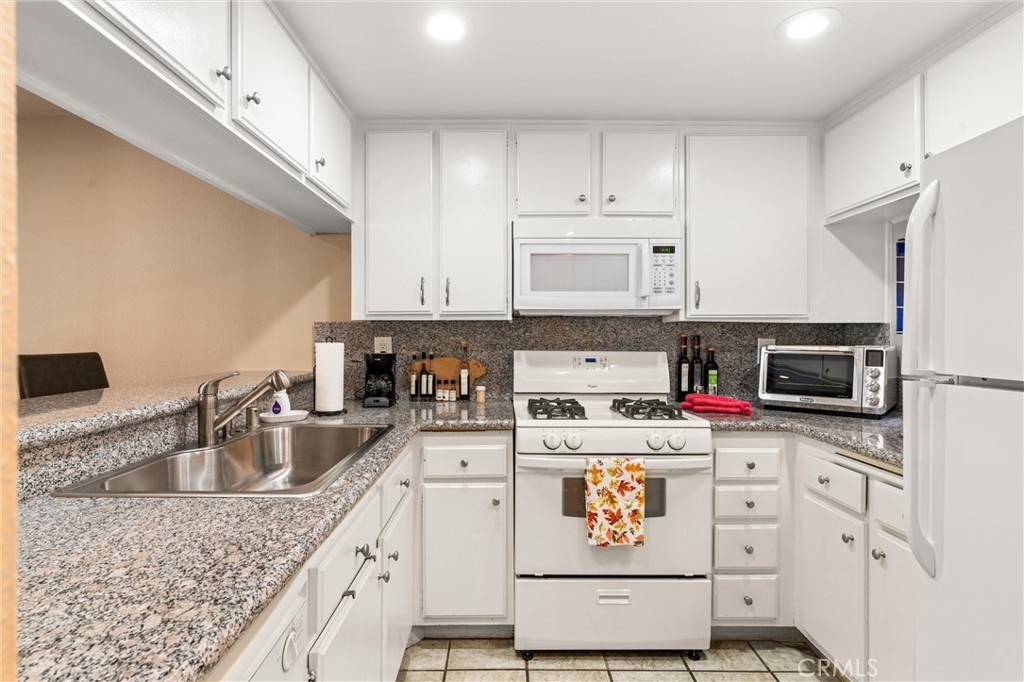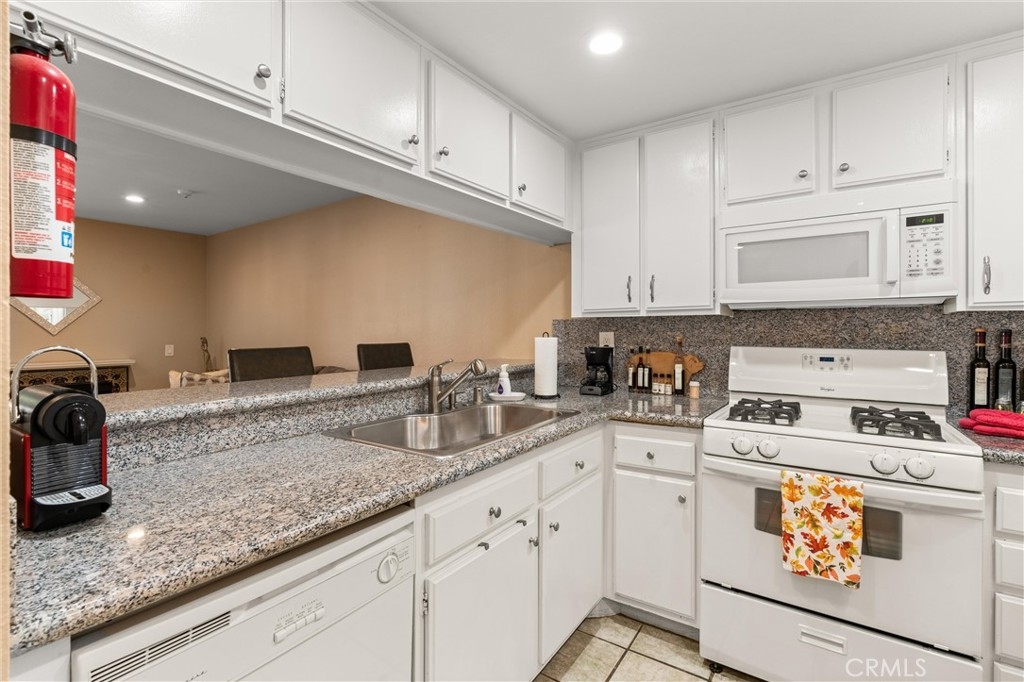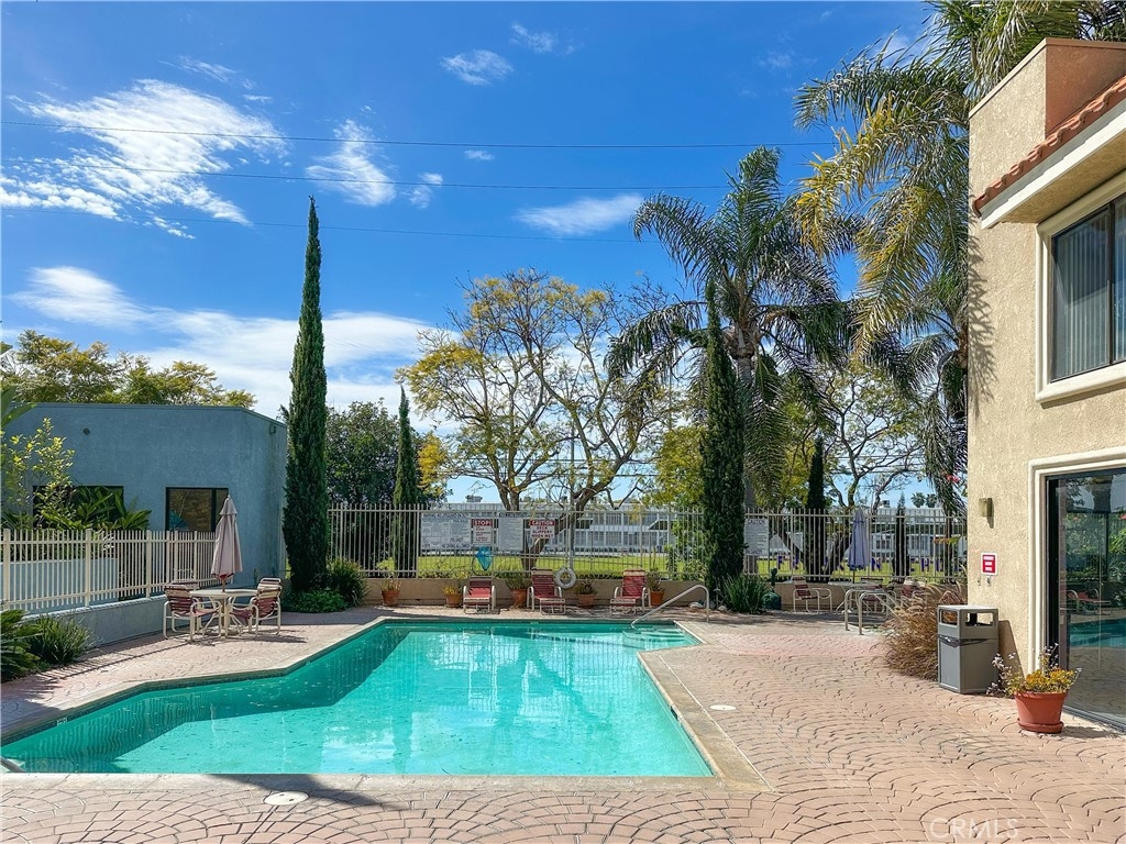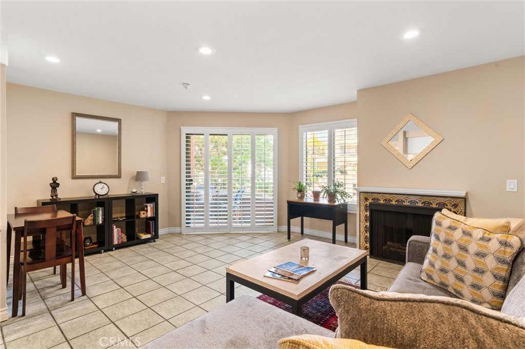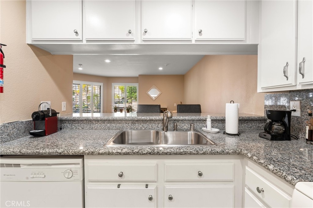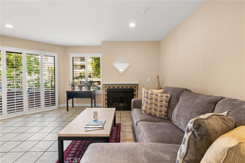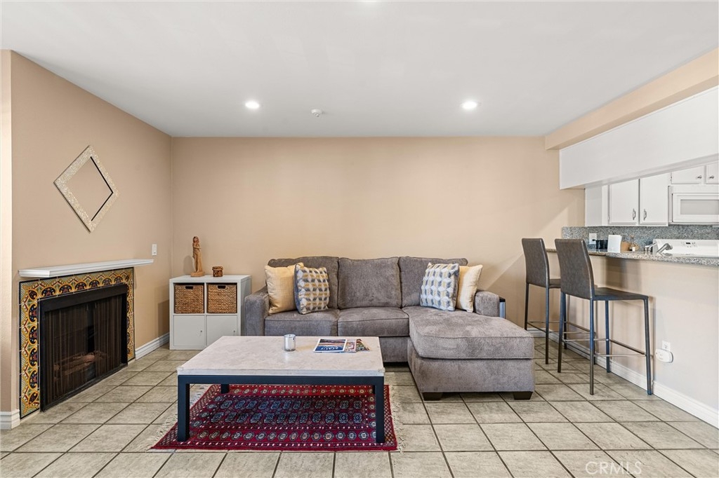 This lovely home welcomes you with lots of natural light and open living! It is bright, clean and move-in ready! Upgrades include: custom plantation shutters on the windows and patio doors, smooth ceilings with recessed lighting and a warm fireplace with custom tile and mantel in the living room. The kitchen has a large sink, granite counters, and a bar that opens to the living room. The large bathroom features a new sink, and custom tile work in the tub/shower enclosure. The bedroom has two roomy walk-in closets for tons of storage and there is convenient access to the wrap around balcony. Other benefits include: fresh paint, new plumbing, in home washer and dryer. One secured parking spot is included with storage. The complex includes onsite security, large pool and spa, and community room. Water and trash are included in the HOA. All conveniently located to shops, restaurants and the beach!