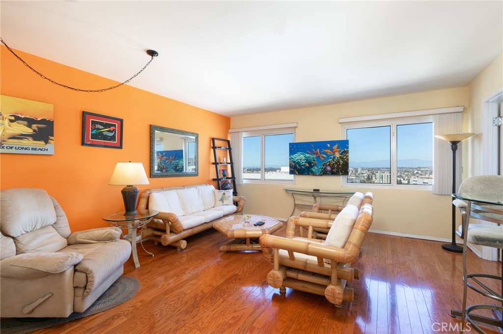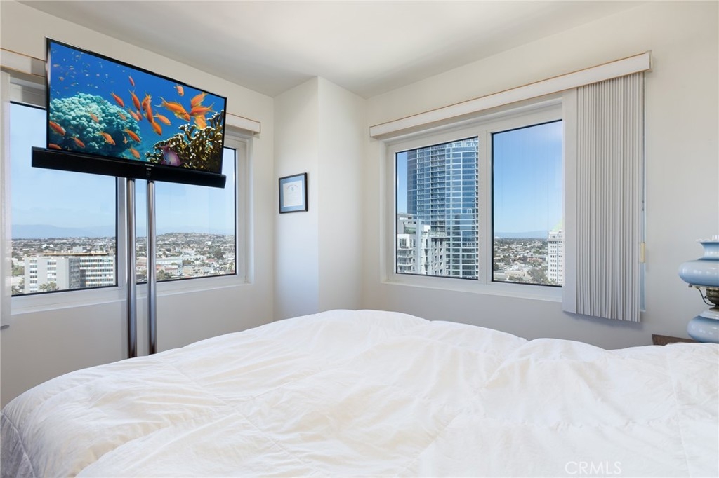Beautifully maintained luxury condo at HARBORPLACE TOWER in the heart of downtown Long Beach. Not only do you have a wonderful view of the beach and the sand from the bedroom, you get 2 parking spaces. This beautifully decorated condo has oak hardwood flooring in the living, dining and bedroom. Designer paint throughout. This condo offers everything you need and the building has great amenities including an ocean view fitness center, a lap pool, jacuzzi, sauna, 24 hour security guard, surveillance system, Package Concierge and 80 guest parking spaces. With a wall of windows in the living room, bathroom and bedroom, you have a ton of natural light coming in. Located on a semi-corner you have views from many angles. There is custom lighting in the dining room, and an in-unit laundry room with washer, dryer and storage. NO balcony. Some of the most famous landmarks of Long Beach include the Queen Mary, the Aquarium of the Pacific, and the Long Beach Terrace Theater all within a short distance. This location offers the best of what DTLB has to offer (the beach, Pine Ave, The Pike, Shoreline Village, the Convention Center, large selection of restaurants, bars, coffee shops. This condo has 10 feet high ceiling offers excellent views of downtown Long Beach, The annual GRAND PRIX can be seen from the private HarborPlace Tower promenade. It is one of the most coveted residences in Long Beach city. Walk to beach and Pine Ave restaurants and much more! Welcome to the City by the Sea!