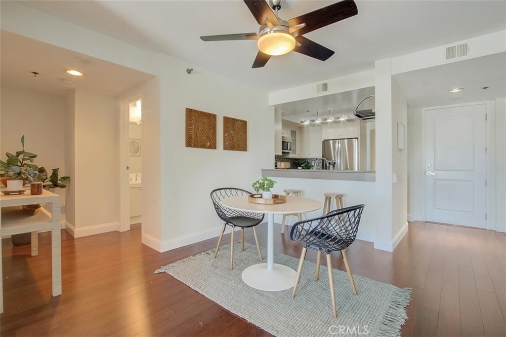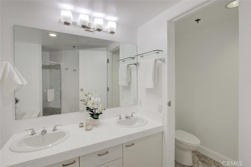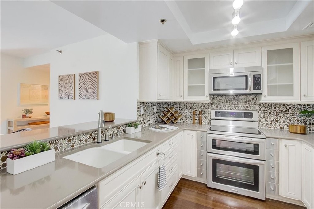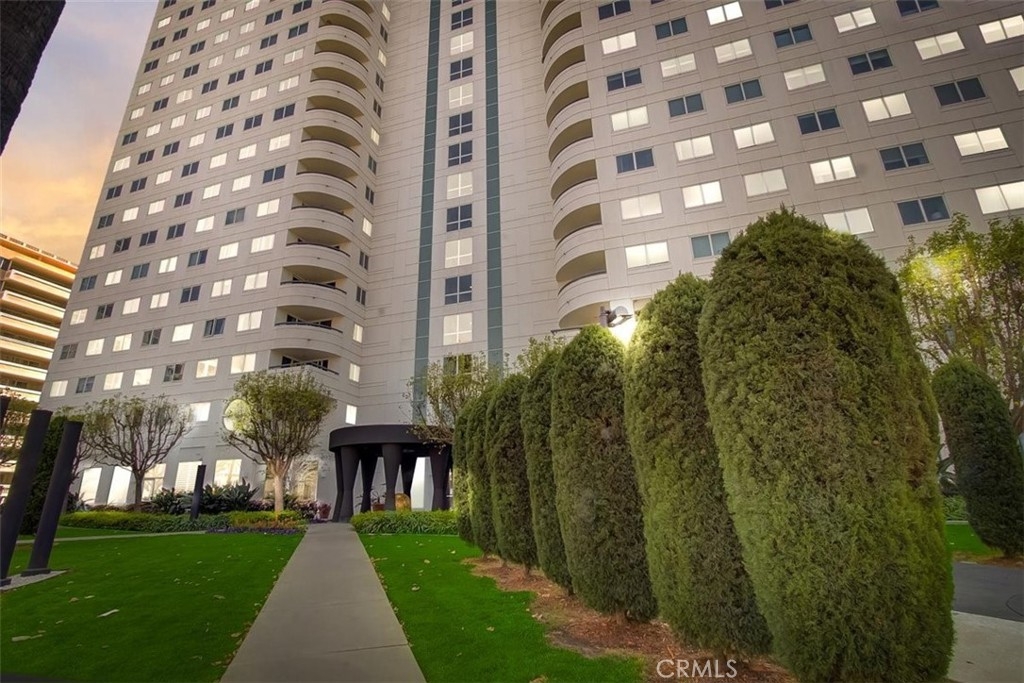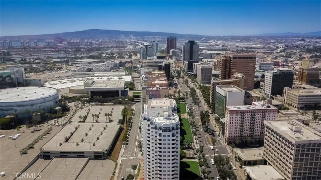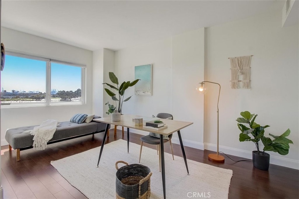 This is a gorgeous unit you MUST see. Originally built as a two-bedroom but then converted to a spacious, bright, and modern one-bedroom home with an expanded living space and featuring breathtaking views! Beautiful wood floors, updated kitchen with trendy backsplash, white cabinets and stainless appliances and quartz counters. The living space is bright and open and enjoys the stunning view from the private balcony. Plenty of room for a living and dining room, a home office that doubles as a guest room. The Primary bedroom enjoys the Queen Mary views and an updated and stylish en suite bathroom. There is a second lovely bathroom, inside laundry, AC and 2 secure parking spaces. The HOA is updating the elevators and halls this spring. This is the perfect unit for resort living. Hurry!