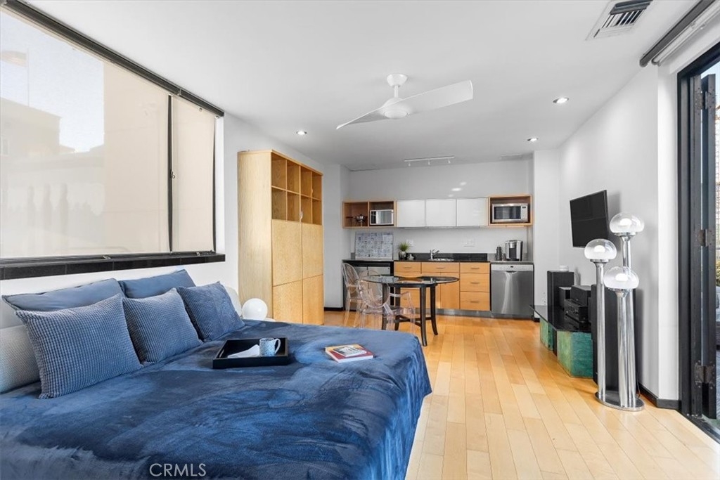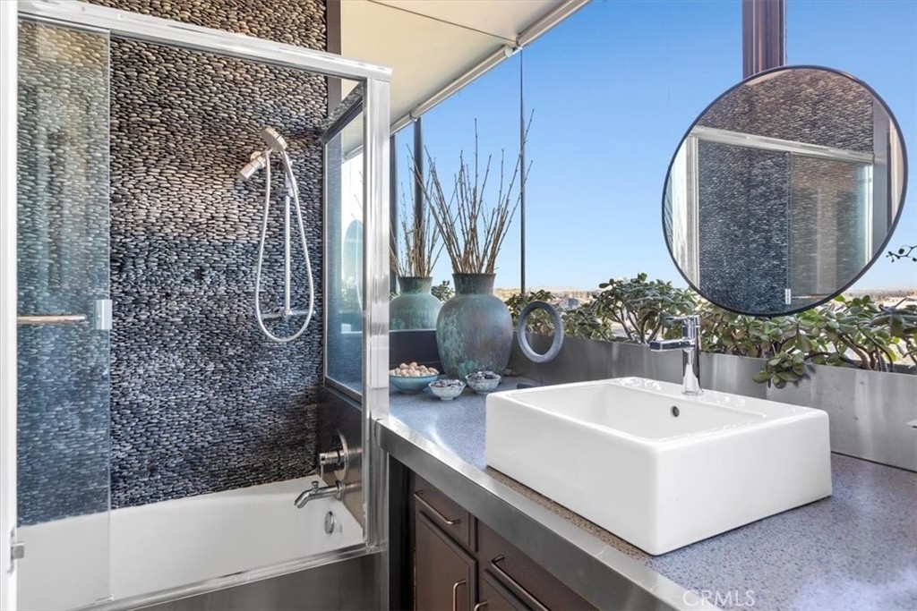 Spectacular views that stretch across 180 degrees and beyond in this two bedroom, two bath corner Penthouse condominium with over 700 square feet of expansive private outdoor spaces! Enter via keyed elevator access to the private lobby, tiled in polished black granite and contemporary French doors. As you walk in the front door you are greeted by wall-to-wall bay windows adorned with custom steel planter boxes. The living space sits conveniently off the open concept galley kitchen which has been remodeled with stainless countertops, stainless steel appliances, mosaic tile backsplash, and perfectly sized island/bar. From the kitchen, you walk down the extra-wide gallery hall with custom shelving and continued black concrete floors. The spacious main bedroom features American maple engineered hardwood flooring, a bay window tiled in polished black granite, a custom sized stainless steel planter box, and custom-fit dual white/charcoal blackout shades. Triple-glazed windows provide extra sound isolation. Three-panel extra tall French doors open to a spacious private terrace. Complete with a walk-in closet and stacked washer/dryer. The main bathroom features a 180 degree panoramic view to the north, with ceiling to countertop windows bringing in tons of natural light, a custom pebble shower wall, and planter boxes. The American maple engineered hardwood flooring extends into the second bedroom along with multi-function recessed LED lighting, custom dimmers, mirrored/frosted glass closet doors, built-in kitchenette or multi-function storage, custom French doors open to terrace, and en suite bathroom. Both bedroom doors open onto an unparalleled spacious private terrace providing ample space for both outdoor dining and lounging retreat. Custom stainless steel planter skirting, hose bib and drip watering system, a grid patio tile system edged with synthetic turf completes the space. A bonus patio area behind the second bedroom provides extra space for a range of uses from fitness to utility. Amenities include hot and cold water faucets, drain pipe, electrical outlets and Ring smart security light/cam with mobile app access. Two parking spaces are available with the unit! Located in the fabulous East Village Arts District surrounded by shops, restaurants, bars, hotels, and blocks from the ocean!