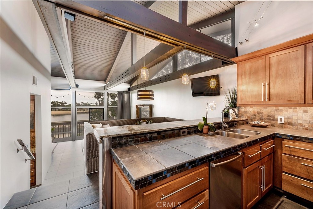 Location,Location,Location! This beautiful, totally remodeled 3 bedroom, 3 bathroom home has direct unobstructed view of Alamitos Bay with breathtaking Sunsets!! An interior designer made this one of kind design marvel. Featuring 2 fireplaces, 2 balcony's overlooking the bay, pool, koi ponds and lagoons. Large walk-in closet in Master Bedroom. Custom tile flooring with stone inlay, metal, brick accents make this a unique showcase home. 2 assigned parking spaces with storage and Car Charging Station....Marina Pacifica Complex amenities include 6 pool, 6 jacuzzi's, koi ponds, fountains and lagoons on approximately 18 acres. 24 hour guard gated security. Gym and clubhouse. Walking Bridge to shops, theater, restaurants and more. New 2nd & PCH shopping center across the street. Great walking, biking to nearby Seal Beach, Naples Island and Belmont Shore.