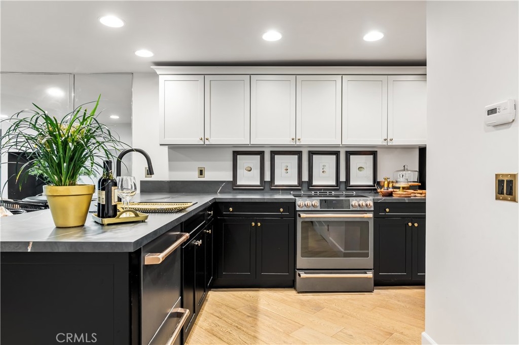 Discover the ultimate in sophisticated coastal living with this stunning, recently remodeled designer's home in Marina Pacifica. This unit is sold completely and beautifully furnished (turnkey), offering an immediate, effortless transition into a luxurious lifestyle. Every detail has been thoughtfully curated for style and comfort. The first-floor unit features a garden, private balcony, and assigned convenient underground parking. Step inside to find all-new, high-end Garrison Newport Beach engineered wood flooring throughout, artfully installed on the diagonal. The walls have been refinished with a smooth, updated texture, creating a pristine canvas for the stylish decor. The chef's ideal workspace awaits in the kitchen, boasting high-end Cafe' Appliances in matte black stainless and gold, including a counter-depth refrigerator, two-drawer dishwasher, and electric convection slide-in oven. The new kitchen features stunning unpolished porcelain countertops and a new black granite single-bowl sink complete this elegant space. Comfort extends to the living areas, with a sofa sleeper and chair sleeper allowing for three comfortable sleeping accommodations. The expanded fireplace, with its new unpolished porcelain hearth, is perfect for accommodating a large TV and mount. Enjoy peace of mind with a new 3-phase electrical panel, all new recessed lighting, and updated plumbing in both the bathroom and kitchen. The updated bath features a new shower, fixtures, vanity, and toilet. Just beyond, a spacious walk-in closet offers excellent storage and conveniently houses a high-end matte black LG washer and dryer. Experience year-round comfort in this northside unit, which stays at a perpetual 73 degrees all summer, leading to uncommonly low electric bills of just $125.00 a month all year. The outdoor spaces have also been meticulously maintained, with the balcony and French drains redone in 2024, a lush front garden redesigned with all new plants in 2024, and gorgeous new tile on the front porch. This home is truly a rare find, blending high-end finishes with practical luxury. Marina Pacifica offers an exceptional resort-style lifestyle, featuring six pools and spas, a clubhouse, and a fully equipped gym, all set within lush, waterfront grounds.The nearby waterways are set to be the 2028 Olympic venue for rowing events, adding a unique and timely appeal to this perfect boater's pied-a-terre or rental unit.