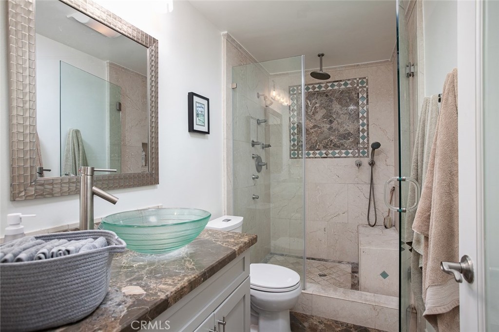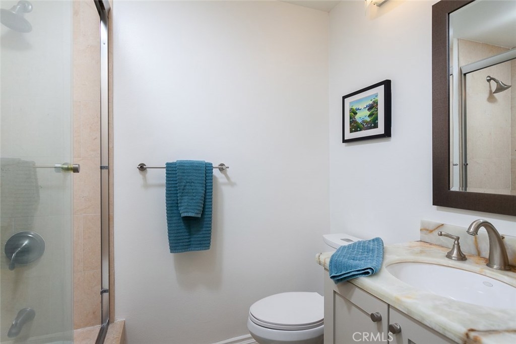 PLEASE STOP!!! and give me 30 seconds to tell you why this unit is the best Marina Pacifica home to come up in the last year. First off, it's true "dual master" 2 bedroom unit. That's right -- 2 ensuite bathrooms. Secondly, it has a half bath on the main living level. So whether you use your second bedroom with ensuite bathroom for guests or a messy teenage son, your dinner party guests will never know the difference when asking to use the powder room. And speaking of guests and dinner parties -- this model has a big, remodeled kitchen with newer appliances and dining room to match. And when you're done with dinner you can lounge on the upper deck with panoramic marina and bay views. Since we're located towards the end of the building, you don't just have a view of the boats (nice) but also a view of the bay. It's one of the nicer views in Marina Pacifica. Of course, if you're an astute reader (and I know you are!) you caught that I said "upper deck." If you want more privacy there is a similar-view lower deck off the master bedroom. And because this model is two levels, you have high ceilings AND fireplaces in both the living room and master bedrooms. Masterful. I know you've been sitting on the sidelines waiting for the right model, the right upgrades, and the right view in Marina Pacifica. Now's your chance. Well-sorted larger view units under $700k will soon be a thing of the past.