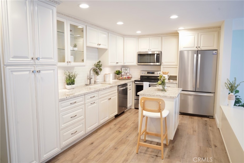 If you are looking for a Resort-lifestyle community, then welcome to Marina Pacifica!!! This rare corner unit is situated on the main level for easy access. It has an airy, open floor plan that brings in plenty of natural light. The unit has been newly painted and fully renovated with beautiful laminate flooring throughout and a remolded bathroom. An open upgraded kitchen that includes stainless steel appliances, granite countertops, a center island, newly installed pristine cabinets and a display cabinet with glass doors. The primary bedroom has wall to wall mirrored closet doors. Other upgrades include double-pane floor to ceiling, “Energy Star qualified” windows with UV light and noise reduction and newly installed automatic custom shades for privacy. This highly desirable “C” model has an extra wide floor plan and a private balcony along with “TWO” underground parking spaces. At Marina Pacifica you will enjoy wonderful amenities which include, a 24hr Security Guard, 6 Pools, Spas and a Clubhouse. In addition, it is walking distance to the Marina Pacifica shops, a movie theater, restaurants and Marina. As well as, the beautiful newly built PCH & 2Nd which offers an amazing outdoor shopping experience along with restaurants overlooking the water. This community also provides easy access to Naples Island, Belmont Shore and Seal Beach.
