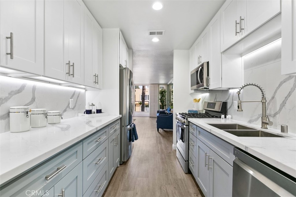 A RARE find - a Townhouse on the beach side of Ocean Blvd, just steps from the sand and sea! This beach front condominium complex is highly sought after. Residents have private, direct access onto the sand. The townhome has just finished a gorgeous renovation offering a completely new, designer kitchen, with new cabinets, countertops, and stainless steel appliances. New luxury wood -like vinyl plank flooring installed throughout the unit - no carpet. New interior paint throughout and Central AC. This home comes with TWO PARKING SPACES that are deeded and inside the secure access garage. With no units above or below this property, it feels like a luxury vacation home. 2 spacious bedrooms are upstairs - both with en-suite, full bathrooms. The primary bedroom has ocean views. Downstairs is a dining room which opens to the front, private patio, a gorgeous kitchen, downstairs bathroom and a huge living room with gas fireplace and a wet bar. The living room opens to a large, private patio with Ocean Views. If you'd like to live at the beach, but still want to have your own outdoor space to entertain, garden, have coffee or cocktails with while watching the sun set over the ocean...this is your place! Alamitos Beach offers the ideal combination of beach living with close access to entertainment, the Acura Grand Prix, boating &water sports, theatre, 100s of restaurants, night life, concert venues, culture, museums, etc.