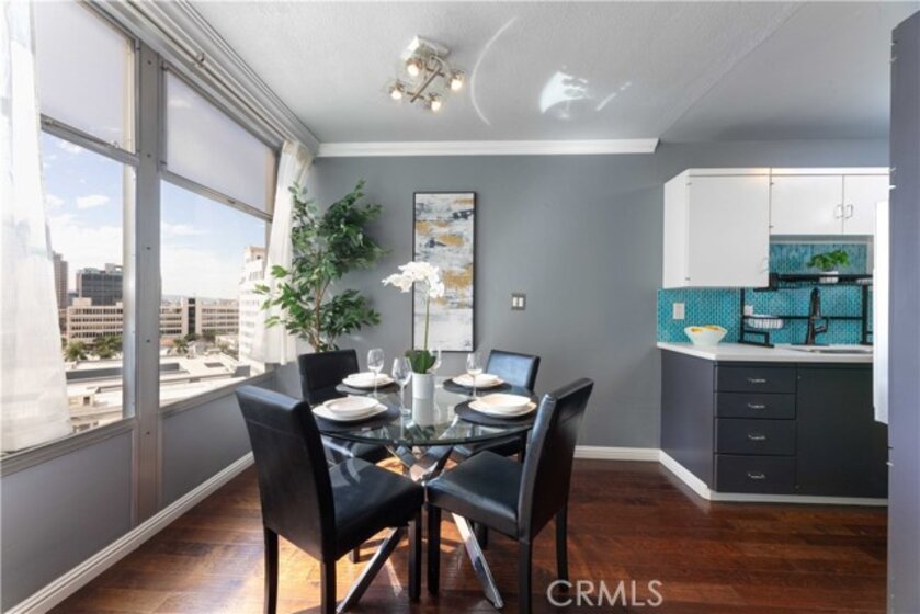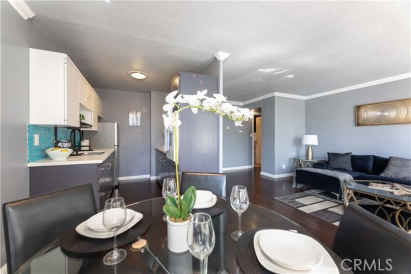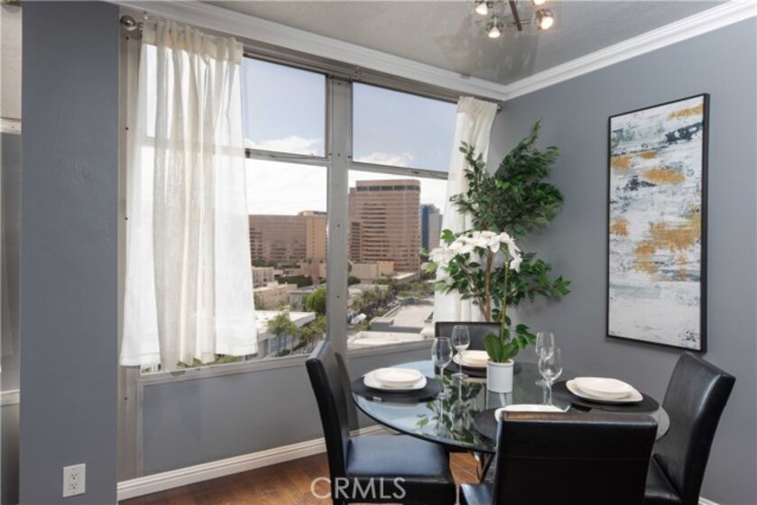 Located in the iconic Royal Palms building in the heart of Downtown Long Beach, this stylish 1-bedroom, 1-bathroom condo offers 600 sq. ft. of modern living with sweeping Cityscape and skyline views that dazzle both day and night. The bright, open living and dining areas feature wall-to-wall windows and laminate flooring throughout, while the updated kitchen showcases stone countertops, glass tile backsplash, and included appliances. This all-electric unit (no gas) provides comfortable and efficient living, complemented by the convenience of a secure building with professional management, staffed lobby office, 24-hour camera surveillance, swimming pool, and onsite community laundry. The monthly HOA covers water, trash, sewer, and more, making this a worry-free lifestyle. Enjoy being just steps away from a grocery store, top-rated restaurants, coffee shops, bakeries, and breweries, plus only minutes from the beach, The Pike, Shoreline Village, the Aquarium of the Pacific, the Queen Mary, and the Convention Center. Whether as your full-time residence or an investment, this condo combines mid-century charm, modern amenities, and an unbeatable location.