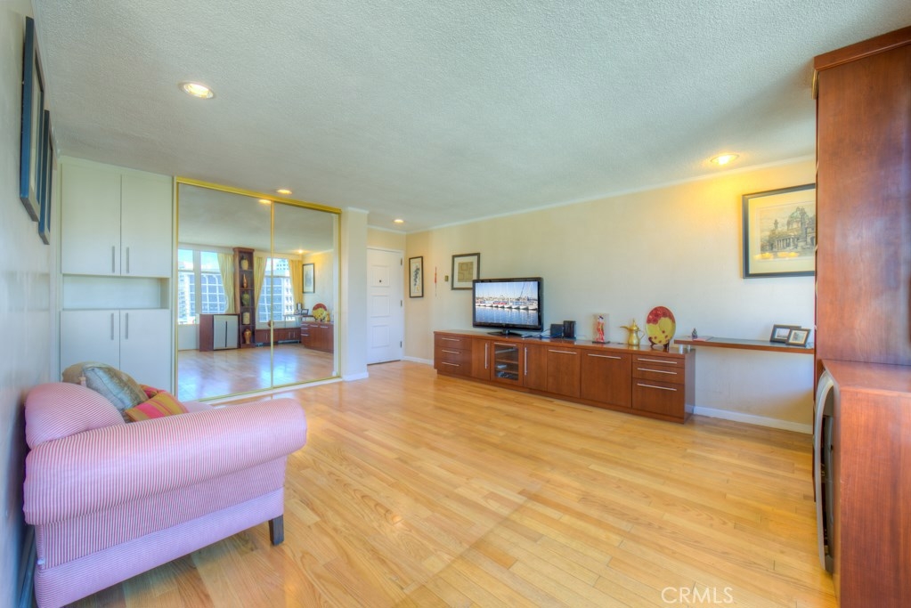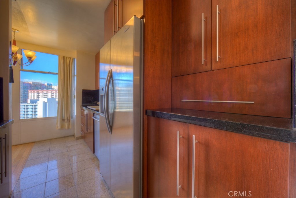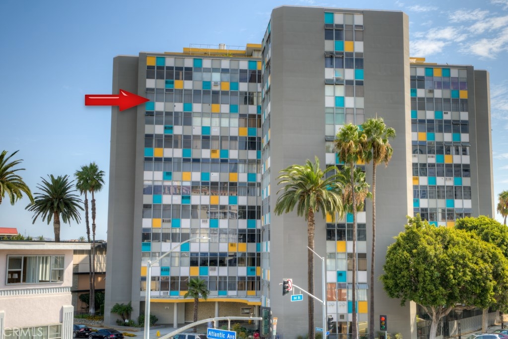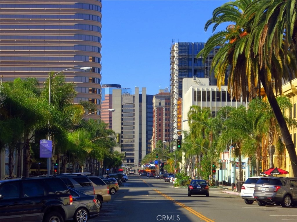 This beautiful upper level 1 bedroom home boasts panoramic views all over downtown Long Beach, to Los Angeles & the Hollywood sign. The floor-to-ceiling windows flood the rooms with natural light all day and stunning city lights all night. Recent remodel included gorgeous rosewood kitchen cabinetry with granite countertops and a washer/dryer combo right inside your new home. You'll enjoy the real wood flooring and custom tile work thorughout. This was originally a 2 bedroom that's now converted to a 1 bedroom with loads of storage and closet space. Low monthly HOA dues of $427 pay your water, trash, hot water, onsite management, building maintenance, community laundry, building insurance and landscaping. Monthly parking permits in surrounding lots are available from $55 to $140 per month and are just outside the door. The walk score rating is 97 (walkers paradise) & you'll be just steps to the bike paths, grocery, beach, coffee shops, art galleries, restaurants, theater, nightlife, metro blue line and so much more. Walk to everything! The Royal Palms is pet friendly and has a swimming pool for an evening dip. Welcome home to 100 Atlantic #1004, you'll love it here! All information is deemed reliable but is not guaranteed. Buyer agrees to verify all details.