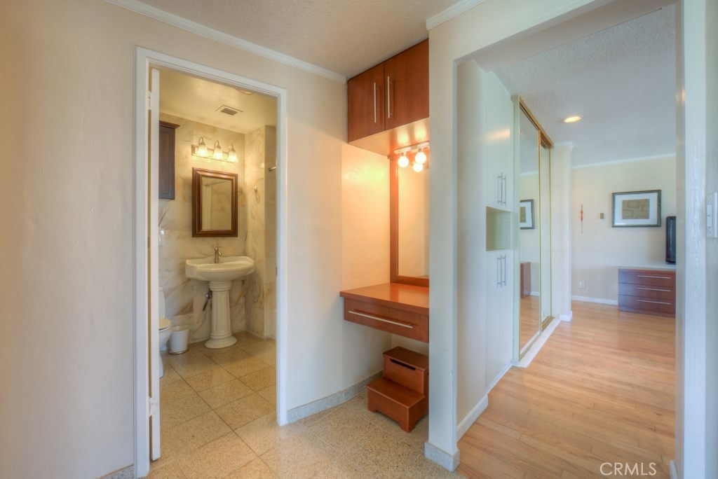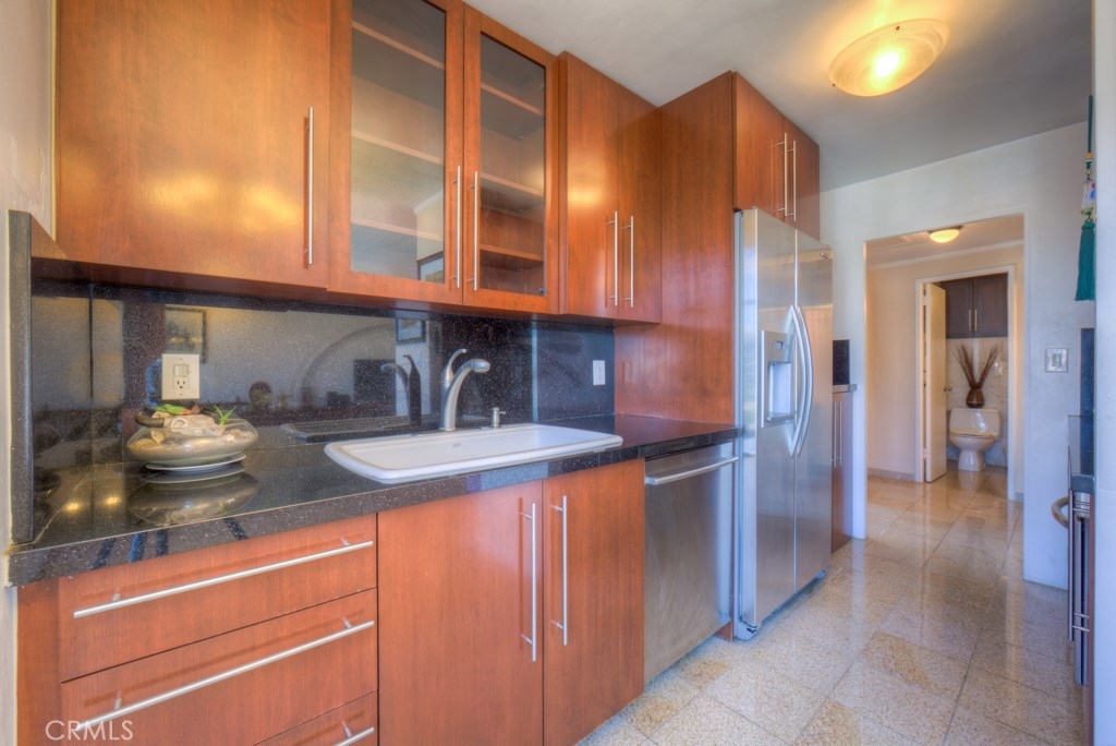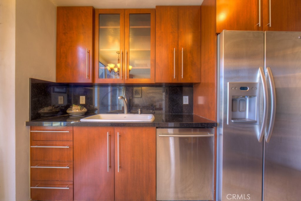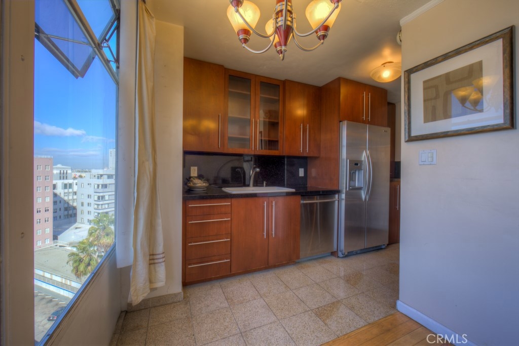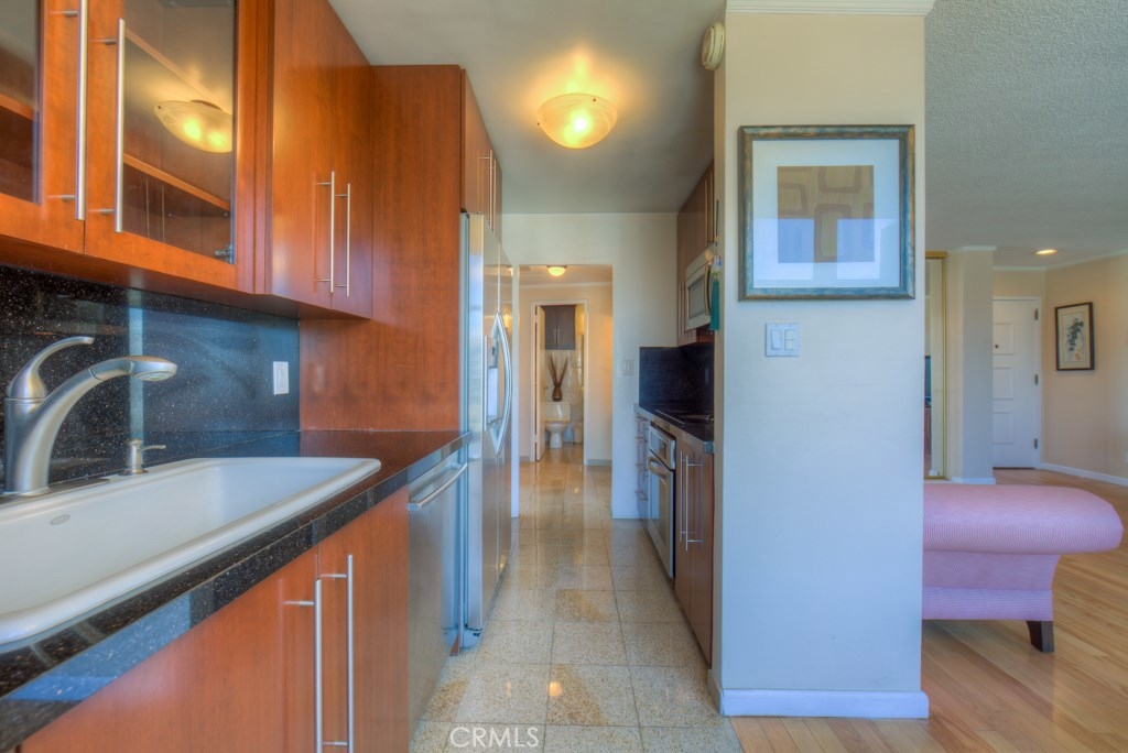This beautiful upper level 1 bedroom home boasts panoramic views all over downtown Long Beach, to Los Angeles & the Hollywood sign. The floor-to-ceiling windows flood the rooms with natural light all day and stunning city lights all night. Recent remodel included gorgeous rosewood kitchen cabinetry with granite countertops and a washer/dryer combo right inside your new home. You'll enjoy the real wood flooring and custom tile work thorughout. This was originally a 2 bedroom that's now converted to a 1 bedroom with loads of storage and closet space. Low monthly HOA dues of $427 pay your water, trash, hot water, onsite management, building maintenance, community laundry, building insurance and landscaping. Monthly parking permits in surrounding lots are available from $55 to $140 per month and are just outside the door. The walk score rating is 97 (walkers paradise) & you'll be just steps to the bike paths, grocery, beach, coffee shops, art galleries, restaurants, theater, nightlife, metro blue line and so much more. Walk to everything! The Royal Palms is pet friendly and has a swimming pool for an evening dip. Welcome home to 100 Atlantic #1004, you'll love it here! All information is deemed reliable but is not guaranteed. Buyer agrees to verify all details.