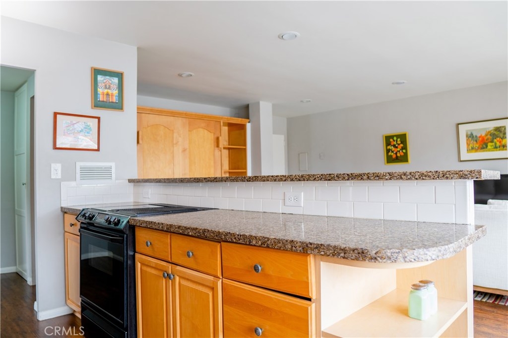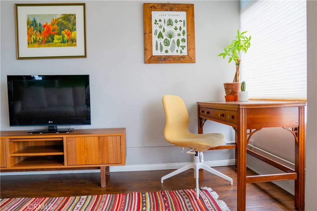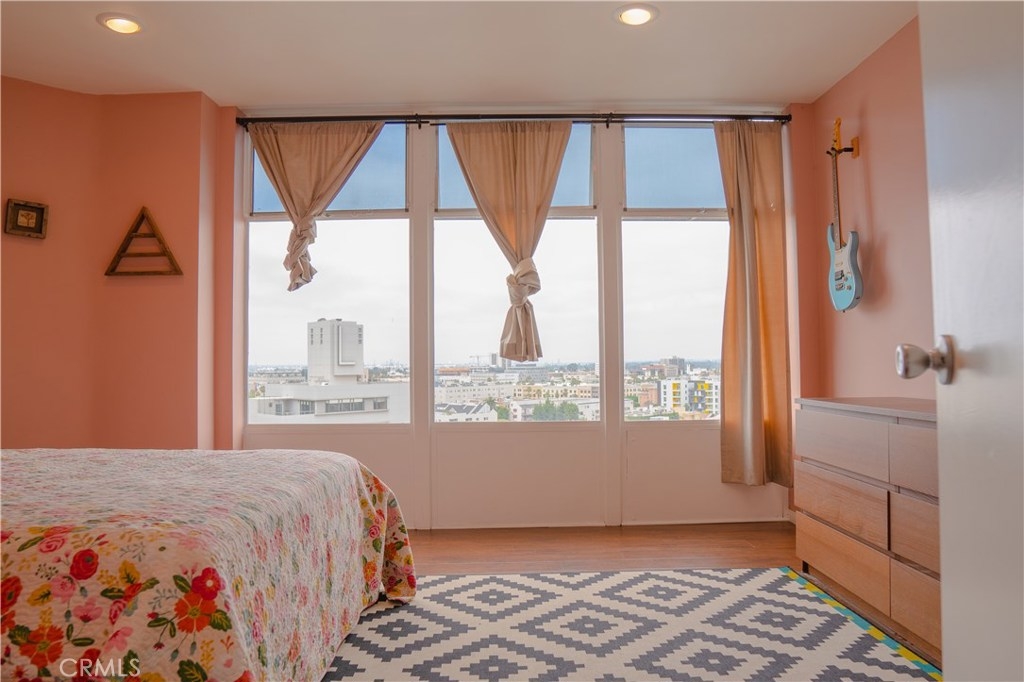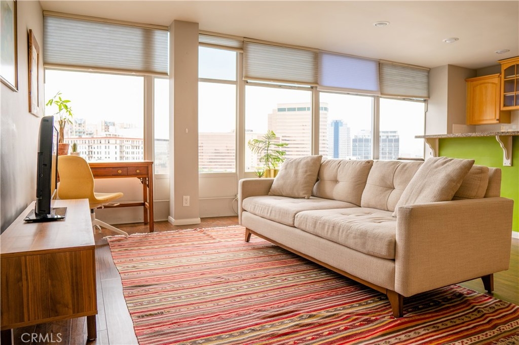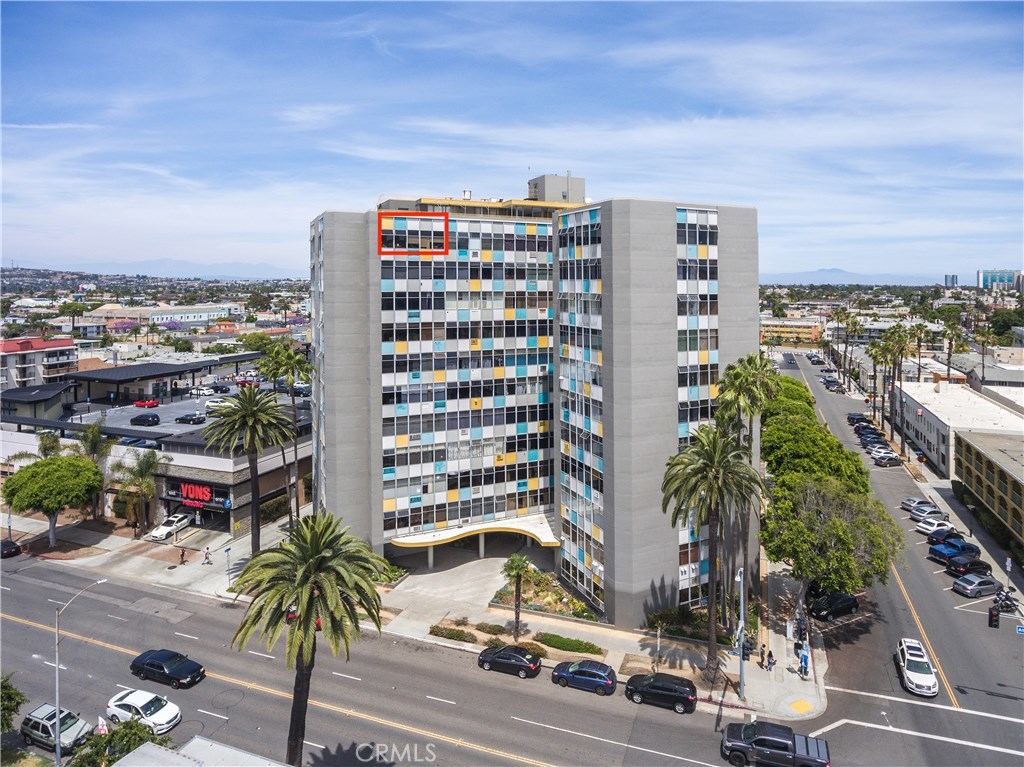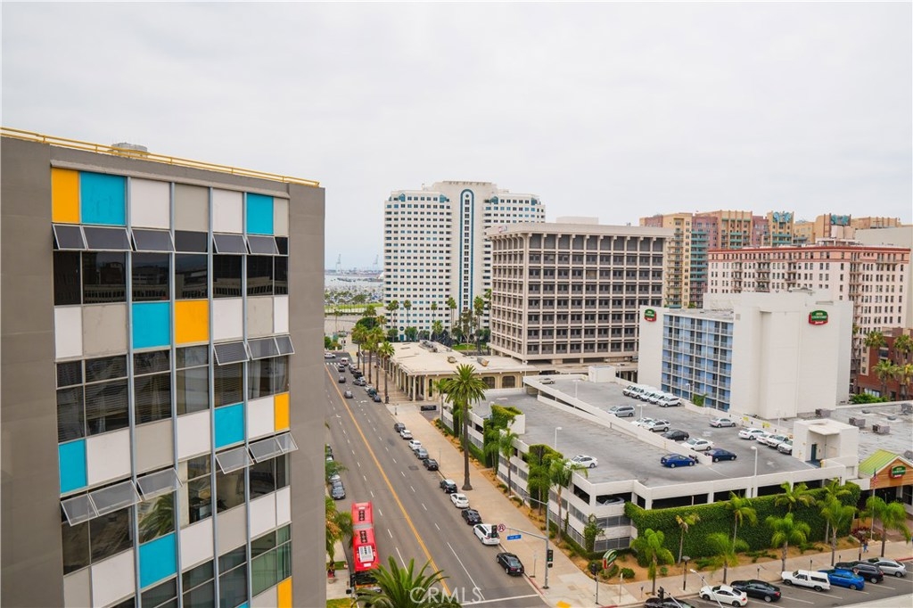 Blocks from the beach, this rare top-floor corner unit boasts panoramic views stretching from downtown Long Beach to Los Angeles. Large windows flood the condo with natural light and admit cool ocean breezes. Take in peek-a-boo ocean views from the open-concept kitchen, equipped with a long breakfast bar. The airy living room is outfitted with an AC unit and a drop-down Murphy bed flanked by built-in shelving. The spacious master bedroom boasts a huge walk-in closet and north-facing views stretching all the way to the Hollywood Sign. The unit also features a large bathroom with a tub and an adjacent linen closet; an additional storage unit is located in the garage. Just outside your door you'll enjoy magical evenings from the rooftop observation deck, where you can watch 4th of July fireworks or just admire the skyline. Built by Long Beach architect Francis O. Merchant, the Royal Palms complex is in the heart of the East Village Arts district—thriving with local businesses, restaurants, coffee shops, and art galleries. HOA covers on-site management, water (hot/cold), trash, insurance, heating, nightly security patrol, and this building is FHA approved! Parking space is available by adding your name to the waitlist, OWNER IS WILLING TO PAY for permit parking for up to 12 months. Walking distance to grocery stores, music venues, the waters edge, downtown Pine Ave, the Performing Arts Center, Shoreline Village, and public transportation, this is your new home!