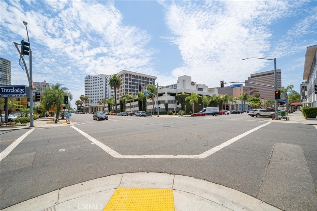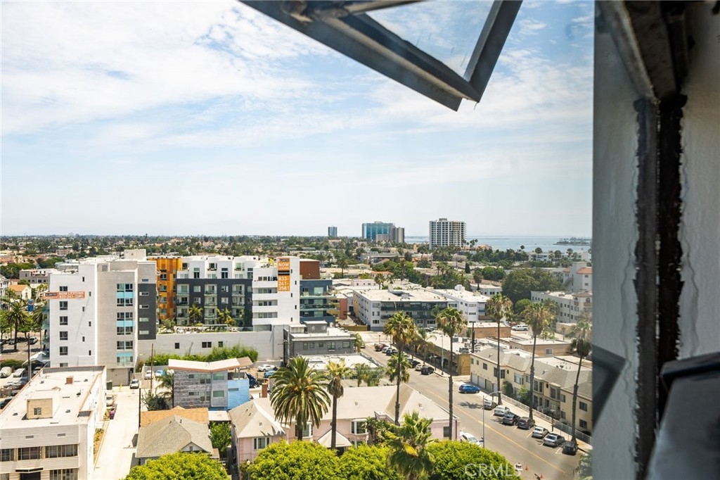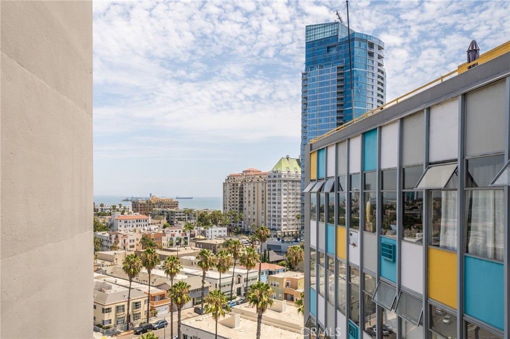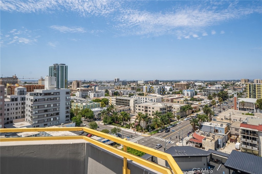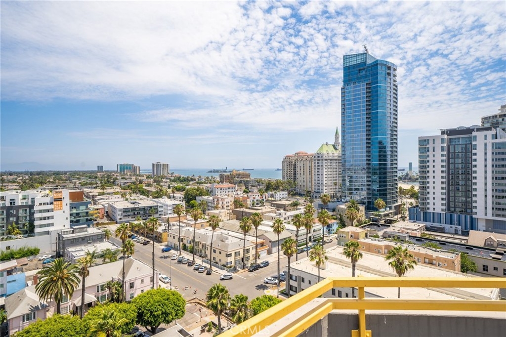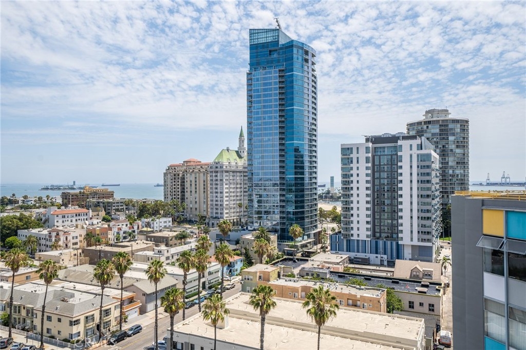 Top Floor of this iconic art deco building at 1st & Atlantic in the International City of Long Beach. This amazing 2 bedroom condo with VIEWS is 1 block from the beach! The entire living room wall has 5 ceiling to floor windows that show magnificent unobstructed VIEWS of the city, sunsets, fireworks and the Hollywood sign. Kitchen is equipped with all stainless appliances, including a French door refrigerator a bottom freezer, electric glass-top oven and above range microwave. Nice charcoal color granite counters and counter high breakfast area. Primary bedroom with a standard King has ample room, custom frosted-glass Anderson sliding closet doors and picturesque view of the city's sunsets. Hunter Douglas remote ceiling fans in both bedrooms. Guest bedroom accommodates a queen bed comfortably and boasts a peak-a-boo view of the OCEAN. Full bath features all new fixtures including a large Delta shower head with a hand-held faucet and soft water filter. Luxury toilet has a large, oval basin with a dual flush system. Flooring throughout is expresso Vinyl Laminate Wood. Living room and hall closet have Anderson 3 lite Euro frosted-glass expresso doors. All bedroom doors are equipped with Schlage lever satin nickel door handles. Enjoy breakfast on the rooftop deck while taking in views of the OCEAN, Queen Mary and even the Hollywood sign. Iconic neighborhood attractions: Crab Shack, Roscoe Chicken and Waffles, PF Chang, Bubba Gump Shrimp Factory, Thai Food, Breakfast Cafe, Night Clubs, The Pike, Movie Theaters, Aquarium of the Pacific, Shoreline Village, the Marina and BEST OF ALL - the OCEAN!!