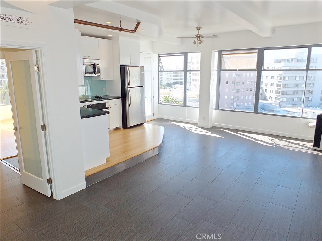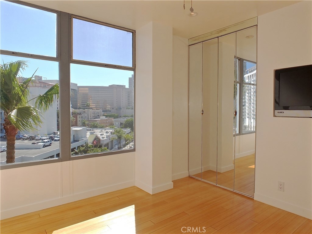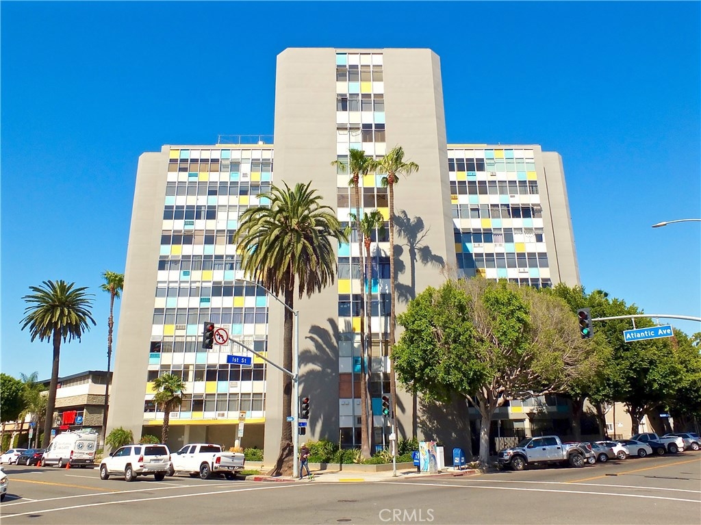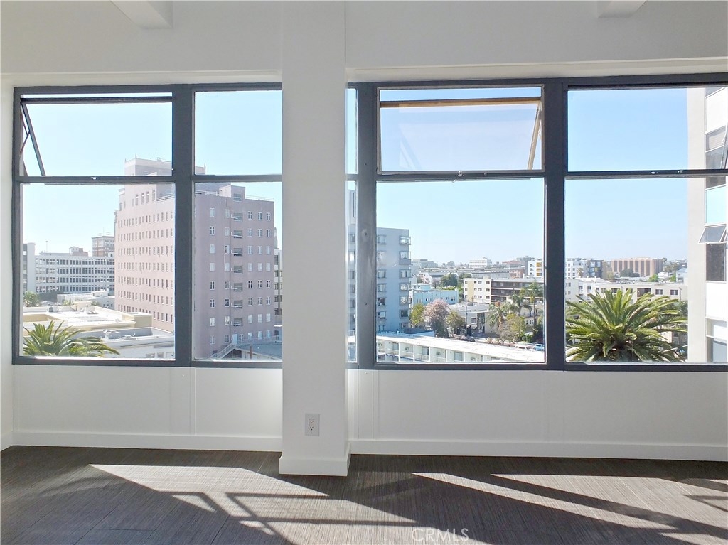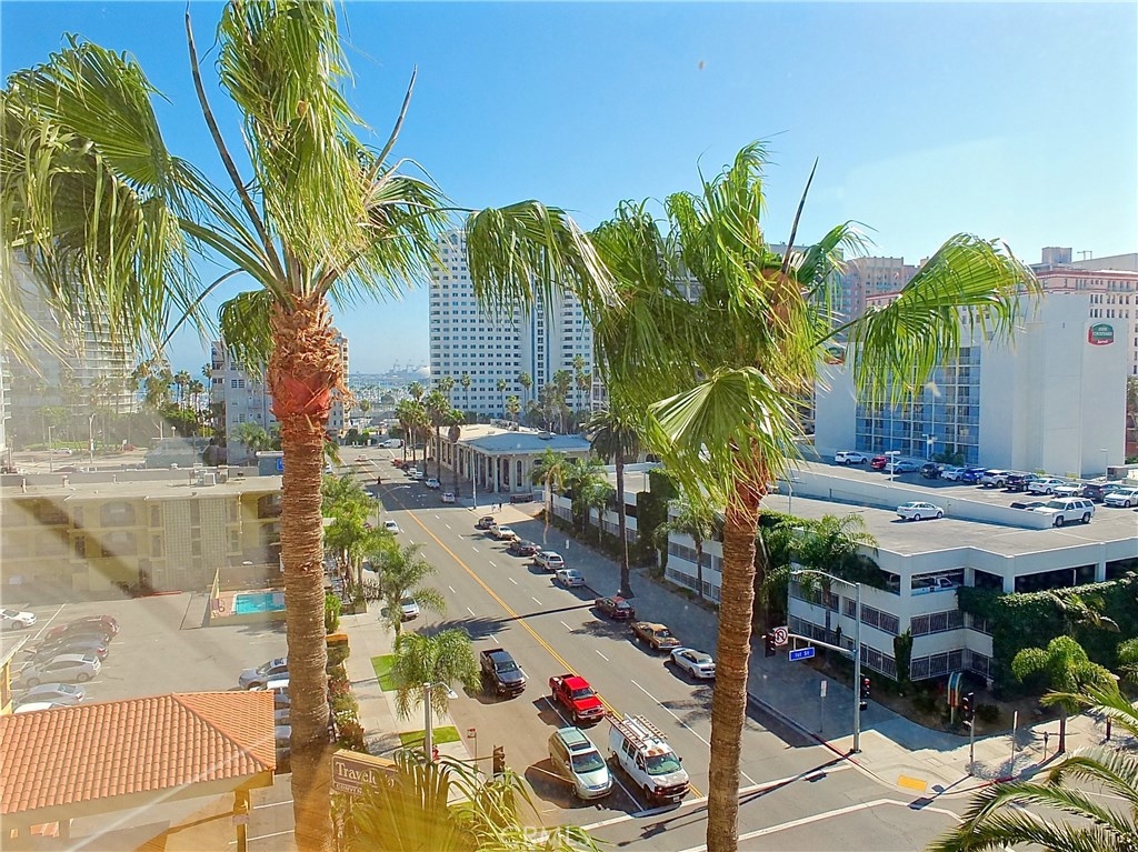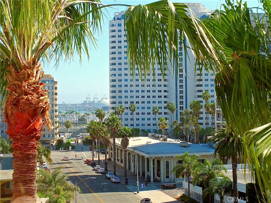 Located in the heart of the East Village Arts District of Long Beach, The Royal Palms is an 11-story building that lends a healthy mid-century look to the downtown skyline. Renovated and upgraded to reflect a modern lifestyle with an urban and European design aesthetic, this 7th floor unit, has great city views and light, with lots of huge windows and high ceilings. A corner unit with only one shared wall, high above the city streets, like an oasis in the heart of the city. Tile flooring through the living and bathroom areas and bamboo in the bedrooms. The raised kitchen platform with open walls, creates a large and inviting great room. Stainless appliances, custom cabinetry, glass backsplash and Galaxy Black granite add to the modern and sleek style of the unit. Custom cabinet in bathroom with grout-free panels of Galaxy Black granite in shower enclosure and on counter top. Walking distance to the beach, metro rail, shops, restaurants, and waterfront attractions.
