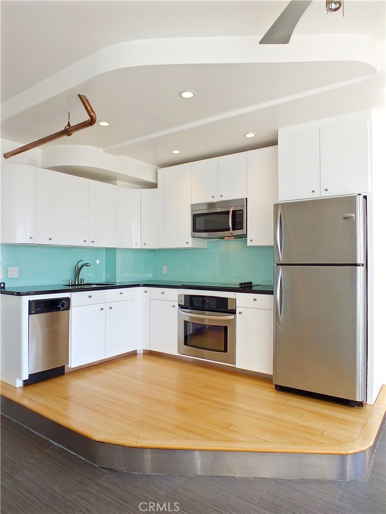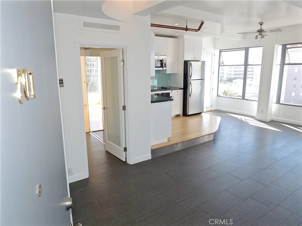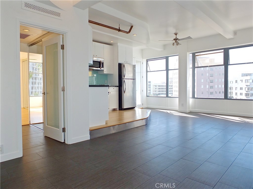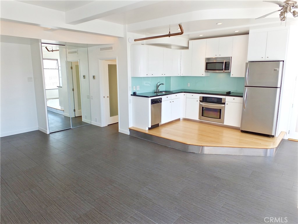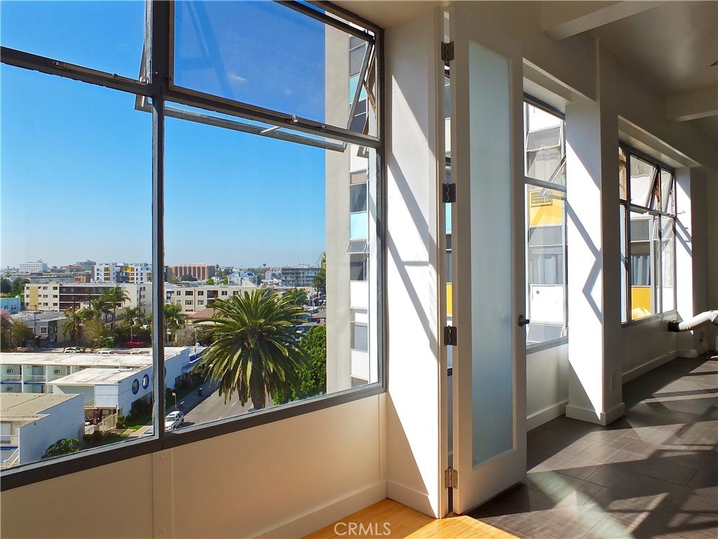 Located in the heart of the East Village Arts District of Long Beach, The Royal Palms is an 11-story building that lends a healthy mid-century look to the downtown skyline. Renovated and upgraded to reflect a modern lifestyle with an urban and European design aesthetic, this 7th floor unit, has great city views and light, with lots of huge windows and high ceilings. A corner unit with only one shared wall, high above the city streets, like an oasis in the heart of the city. Tile flooring through the living and bathroom areas and bamboo in the bedrooms. The raised kitchen platform with open walls, creates a large and inviting great room. Stainless appliances, custom cabinetry, glass backsplash and Galaxy Black granite add to the modern and sleek style of the unit. Custom cabinet in bathroom with grout-free panels of Galaxy Black granite in shower enclosure and on counter top. Walking distance to the beach, metro rail, shops, restaurants, and waterfront attractions.