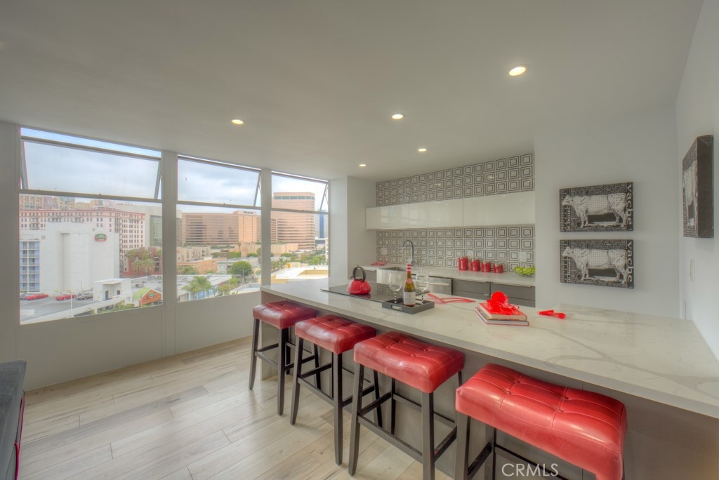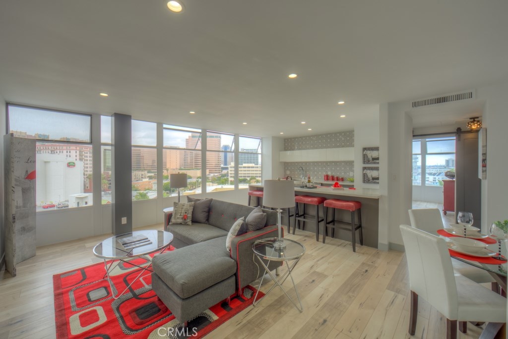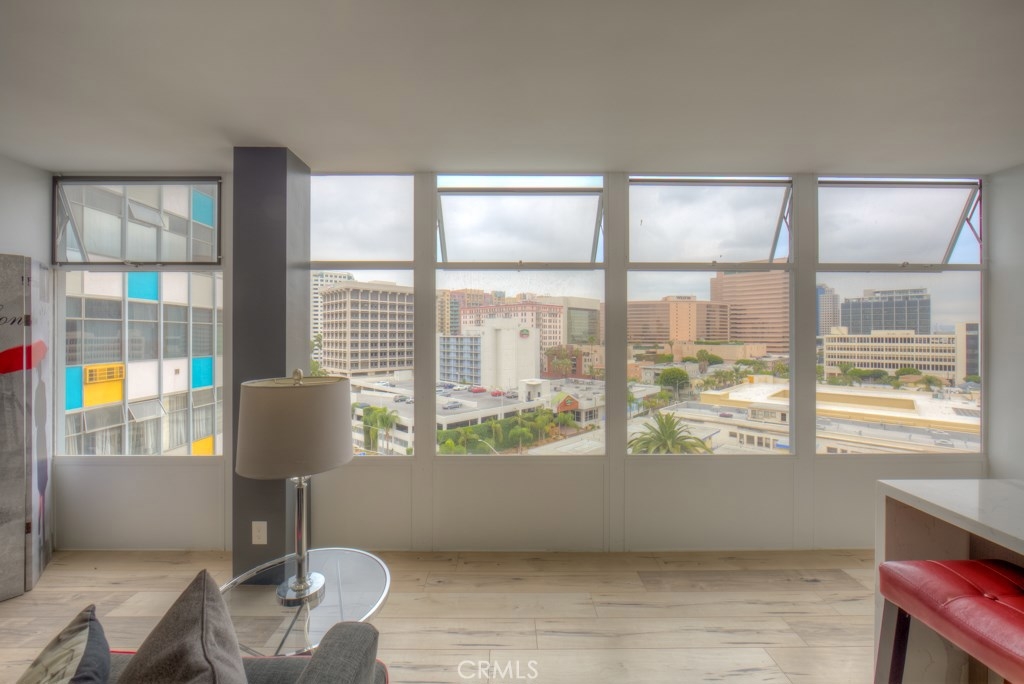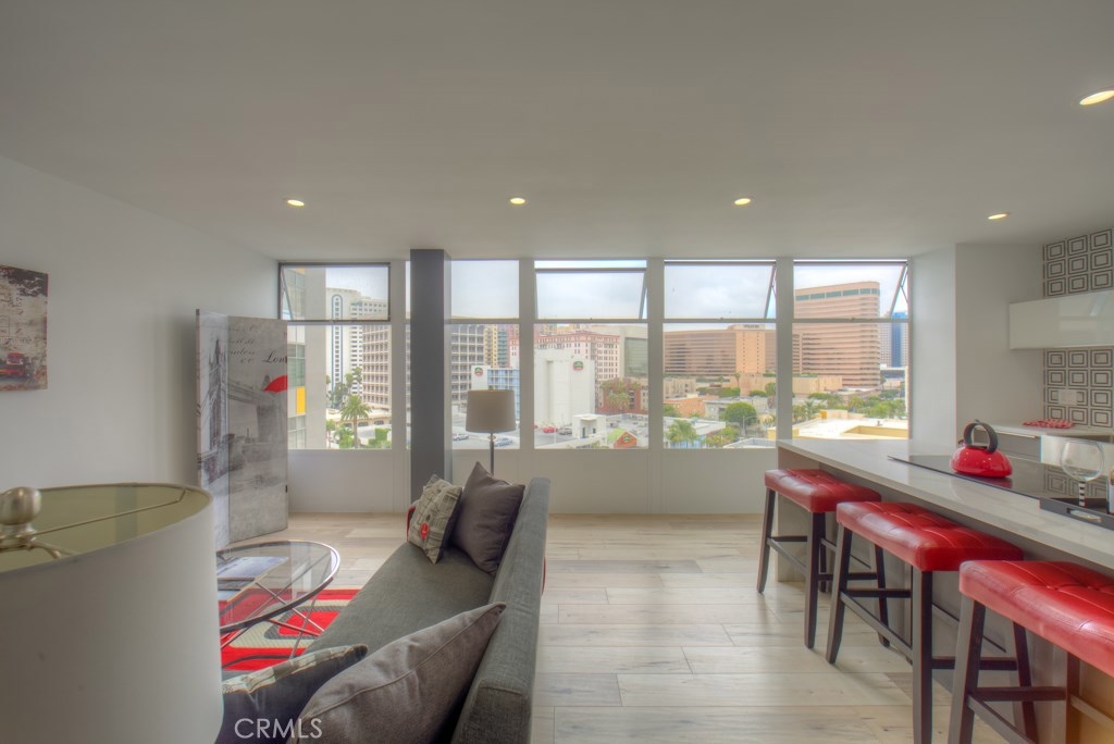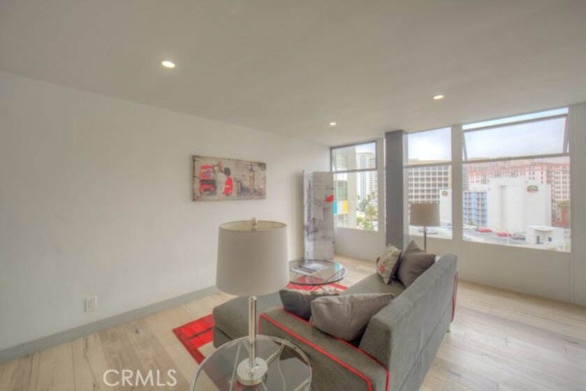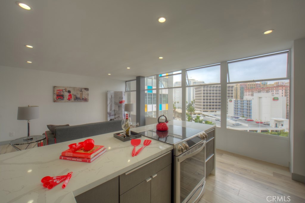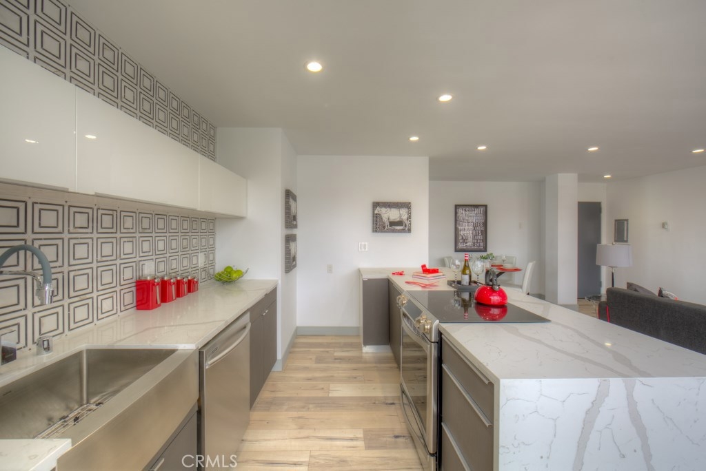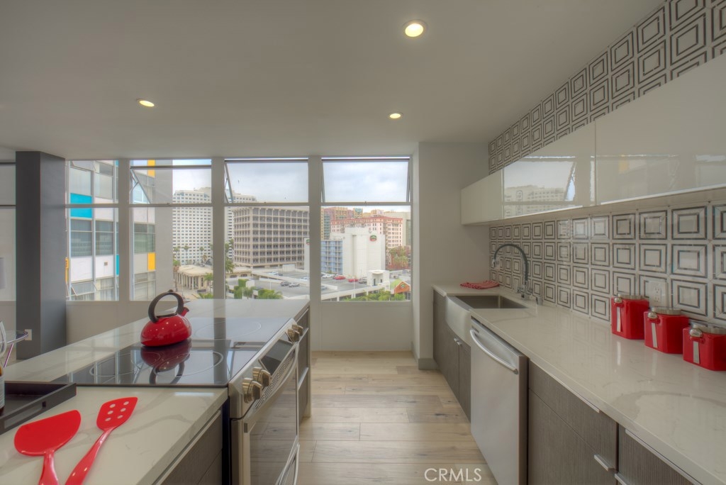 Your opportunity to own a piece of paradise! Super modern and completely remodeled 8th floor corner unit 2 bed 1 bath urban living space in the Royal Palms in the heart of East Village. Every room offers breathtaking city views and tons of natural light, view of downtown Marina and cruise ships from kitchen. Main living space is open concept with gorgeous new chef's kitchen perfect for entertaining! Kitchen features new Euro flat panel cabinets, new calacatta quartz countertops with dramatic waterfall edge at end of 9 foot long peninsula, counter height breakfast bar for relaxing with your morning coffee and enjoying the views. New stainless steel state-of-the-art Samsung induction range (energy efficient and you can even control with your smartphone!) and matching Samsung dishwasher. Beautiful patterned stone backsplash and stainless steel apron sink. All new designer remodeled bathroom with custom tiled shower, luxurious ceiling mounted rain shower head, frameless shower splash panel, new vanity and fixtures, new tile floor. New wide plank wood laminate flooring in all living spaces, LED recessed lights, new interior doors. Freshly painted throughout with contrasting gray tones for doors and baseboards. Pet friendly, HOA dues pay your water, trash, sewage, hot water, bike storage room, heat, on-site management, building maintenance, insurance and pest control. Fantastic location just one block from the beach so you can walk to all that downtown Long Beach has to offer!
