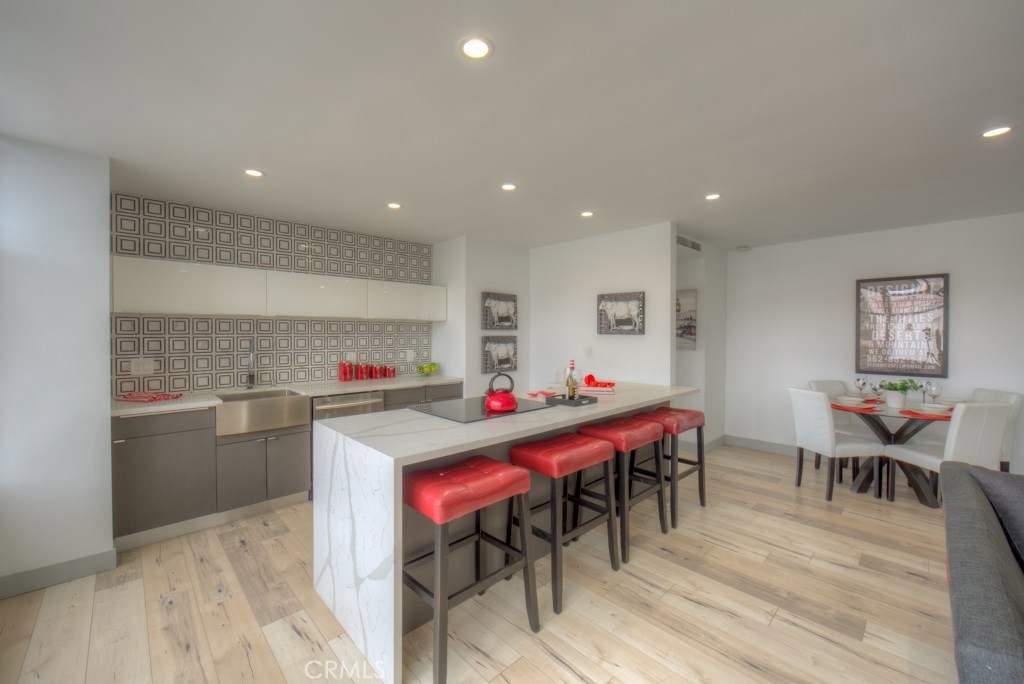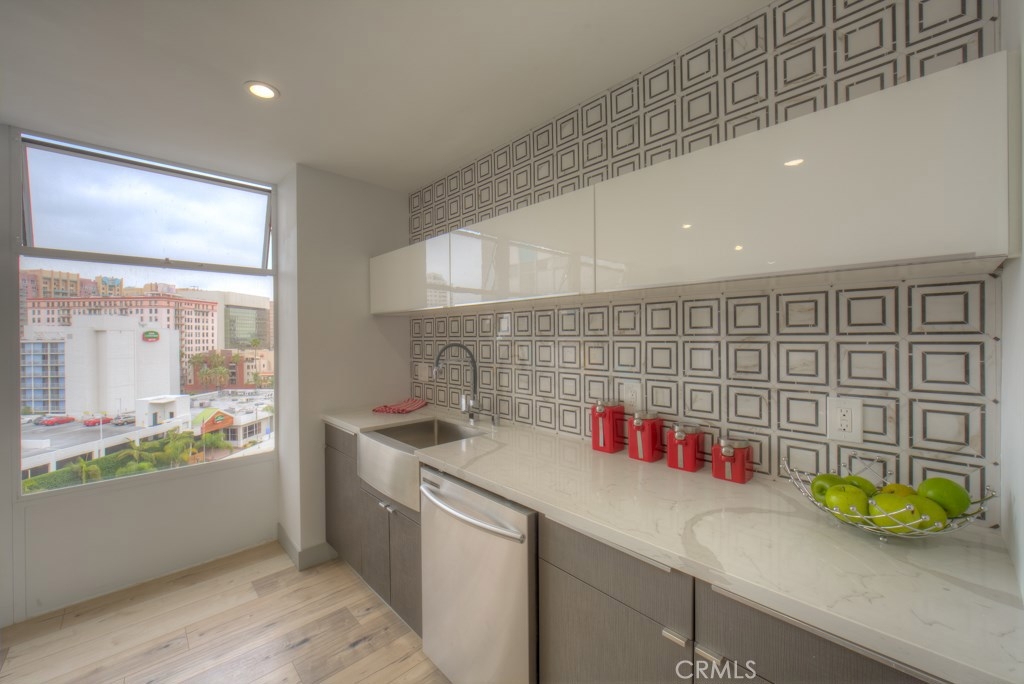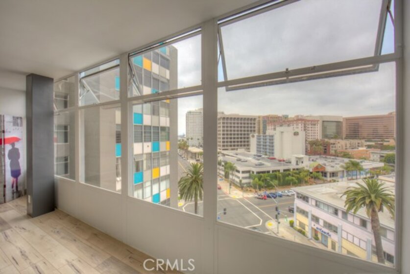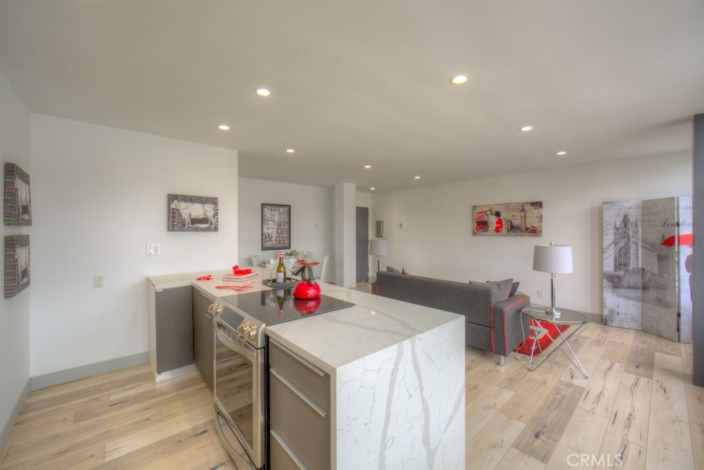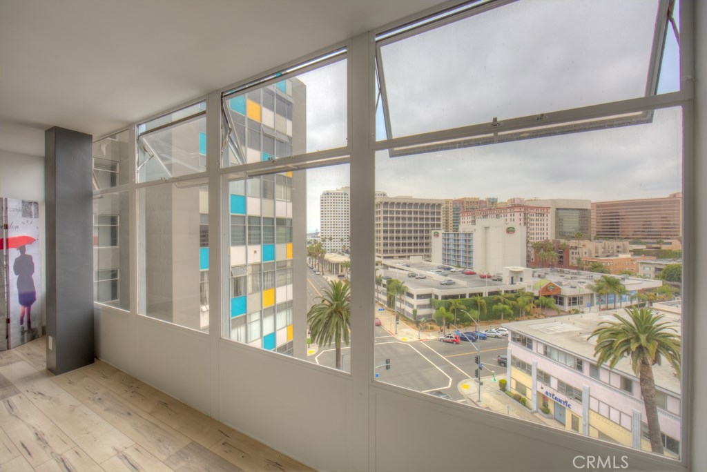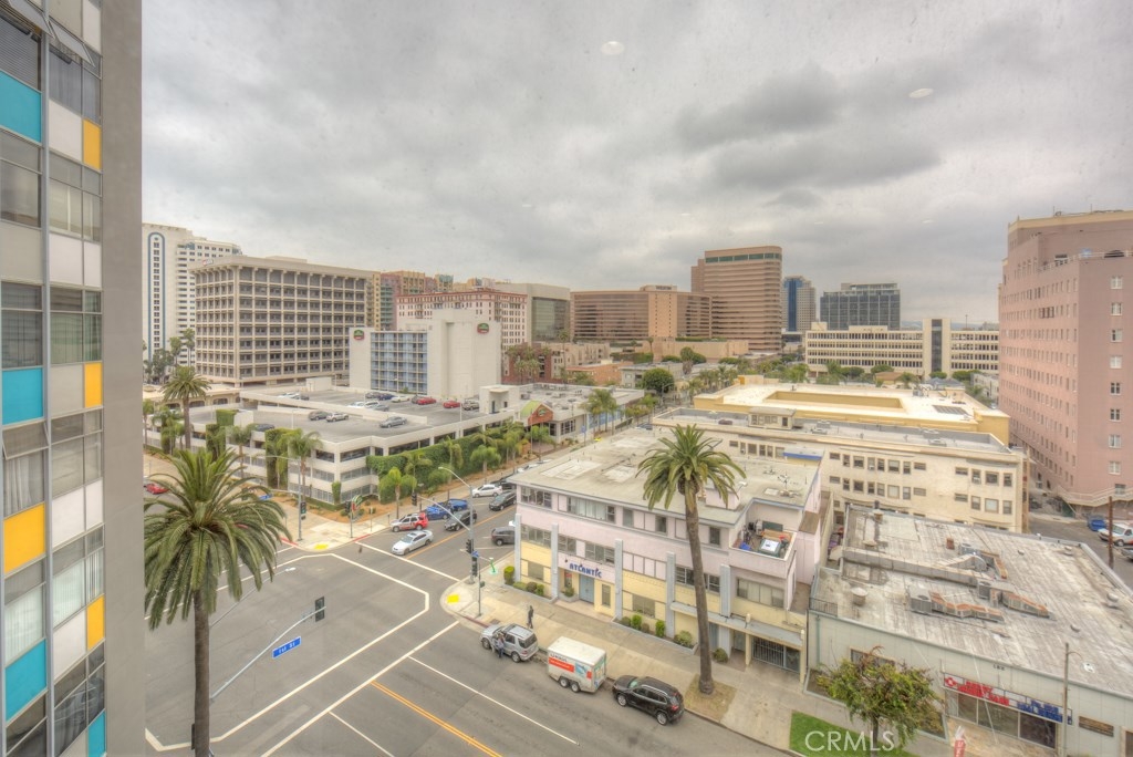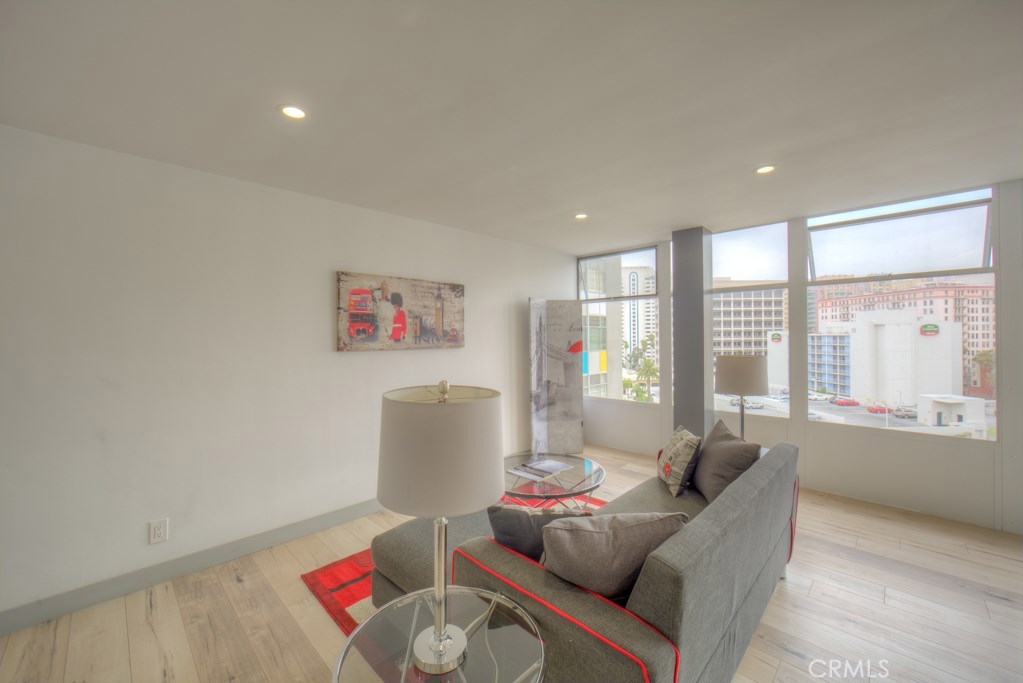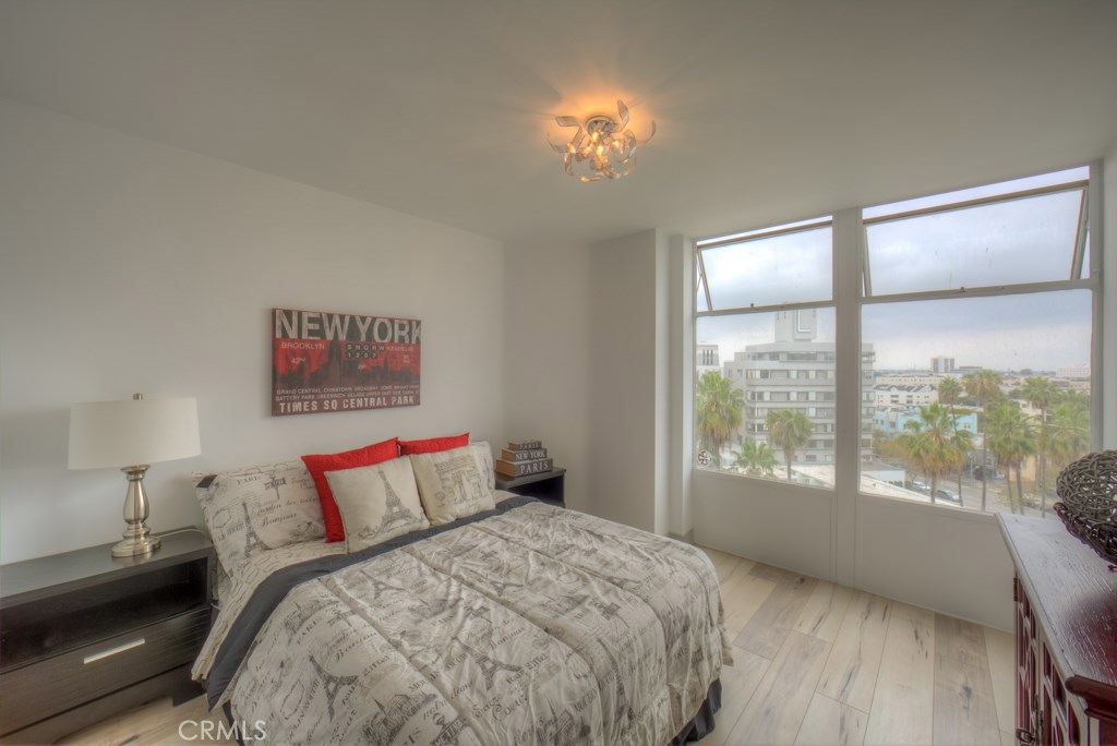 Your opportunity to own a piece of paradise! Super modern and completely remodeled 8th floor corner unit 2 bed 1 bath urban living space in the Royal Palms in the heart of East Village. Every room offers breathtaking city views and tons of natural light, view of downtown Marina and cruise ships from kitchen. Main living space is open concept with gorgeous new chef's kitchen perfect for entertaining! Kitchen features new Euro flat panel cabinets, new calacatta quartz countertops with dramatic waterfall edge at end of 9 foot long peninsula, counter height breakfast bar for relaxing with your morning coffee and enjoying the views. New stainless steel state-of-the-art Samsung induction range (energy efficient and you can even control with your smartphone!) and matching Samsung dishwasher. Beautiful patterned stone backsplash and stainless steel apron sink. All new designer remodeled bathroom with custom tiled shower, luxurious ceiling mounted rain shower head, frameless shower splash panel, new vanity and fixtures, new tile floor. New wide plank wood laminate flooring in all living spaces, LED recessed lights, new interior doors. Freshly painted throughout with contrasting gray tones for doors and baseboards. Pet friendly, HOA dues pay your water, trash, sewage, hot water, bike storage room, heat, on-site management, building maintenance, insurance and pest control. Fantastic location just one block from the beach so you can walk to all that downtown Long Beach has to offer!