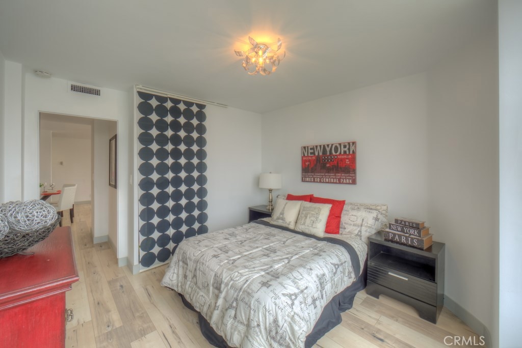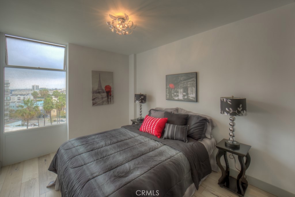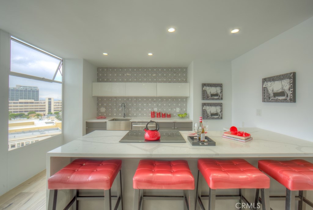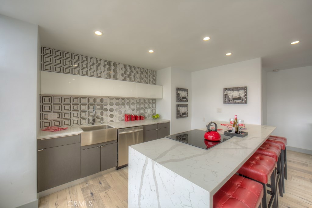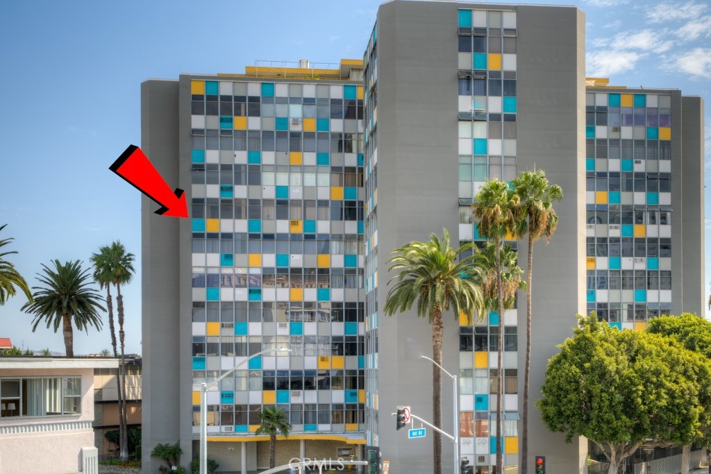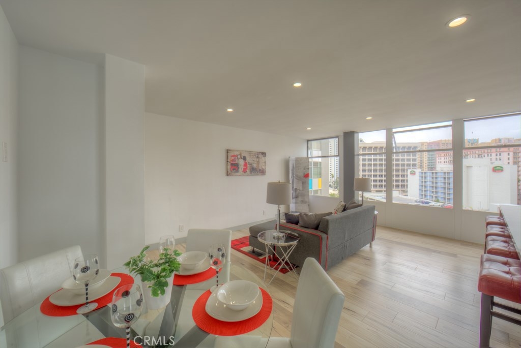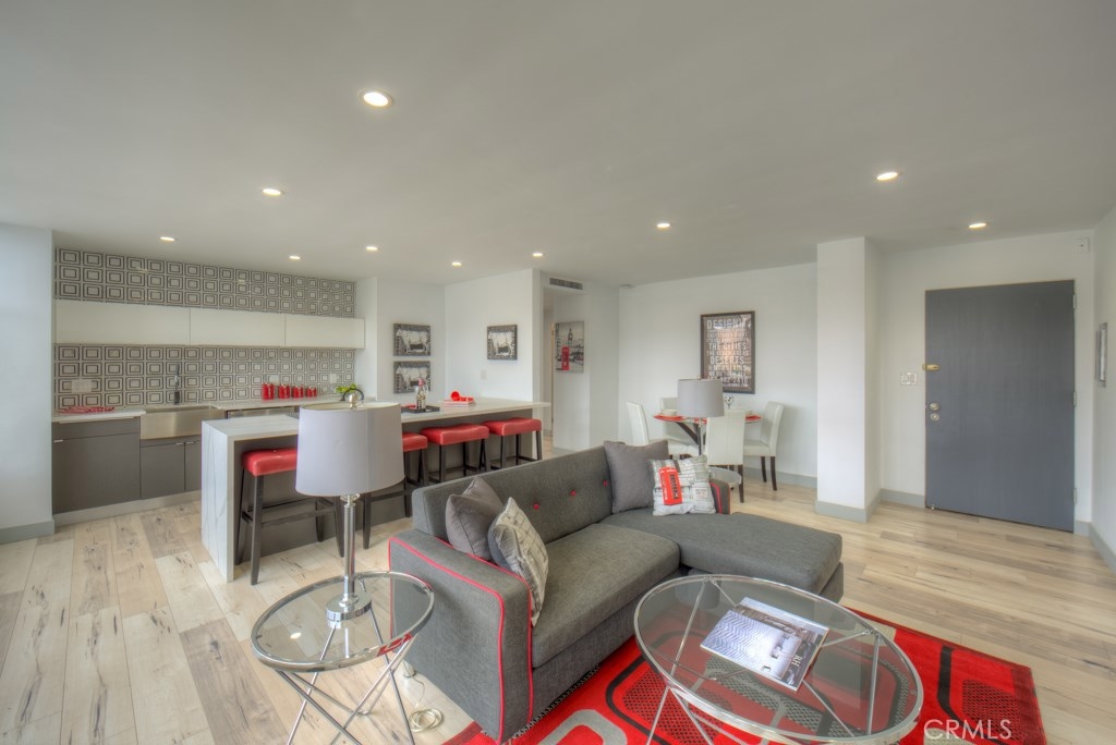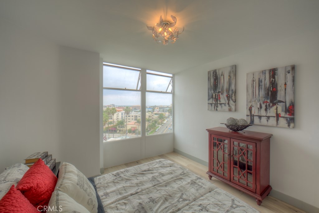 Your opportunity to own a piece of paradise! Super modern and completely remodeled 8th floor corner unit 2 bed 1 bath urban living space in the Royal Palms in the heart of East Village. Every room offers breathtaking city views and tons of natural light, view of downtown Marina and cruise ships from kitchen. Main living space is open concept with gorgeous new chef's kitchen perfect for entertaining! Kitchen features new Euro flat panel cabinets, new calacatta quartz countertops with dramatic waterfall edge at end of 9 foot long peninsula, counter height breakfast bar for relaxing with your morning coffee and enjoying the views. New stainless steel state-of-the-art Samsung induction range (energy efficient and you can even control with your smartphone!) and matching Samsung dishwasher. Beautiful patterned stone backsplash and stainless steel apron sink. All new designer remodeled bathroom with custom tiled shower, luxurious ceiling mounted rain shower head, frameless shower splash panel, new vanity and fixtures, new tile floor. New wide plank wood laminate flooring in all living spaces, LED recessed lights, new interior doors. Freshly painted throughout with contrasting gray tones for doors and baseboards. Pet friendly, HOA dues pay your water, trash, sewage, hot water, bike storage room, heat, on-site management, building maintenance, insurance and pest control. Fantastic location just one block from the beach so you can walk to all that downtown Long Beach has to offer!