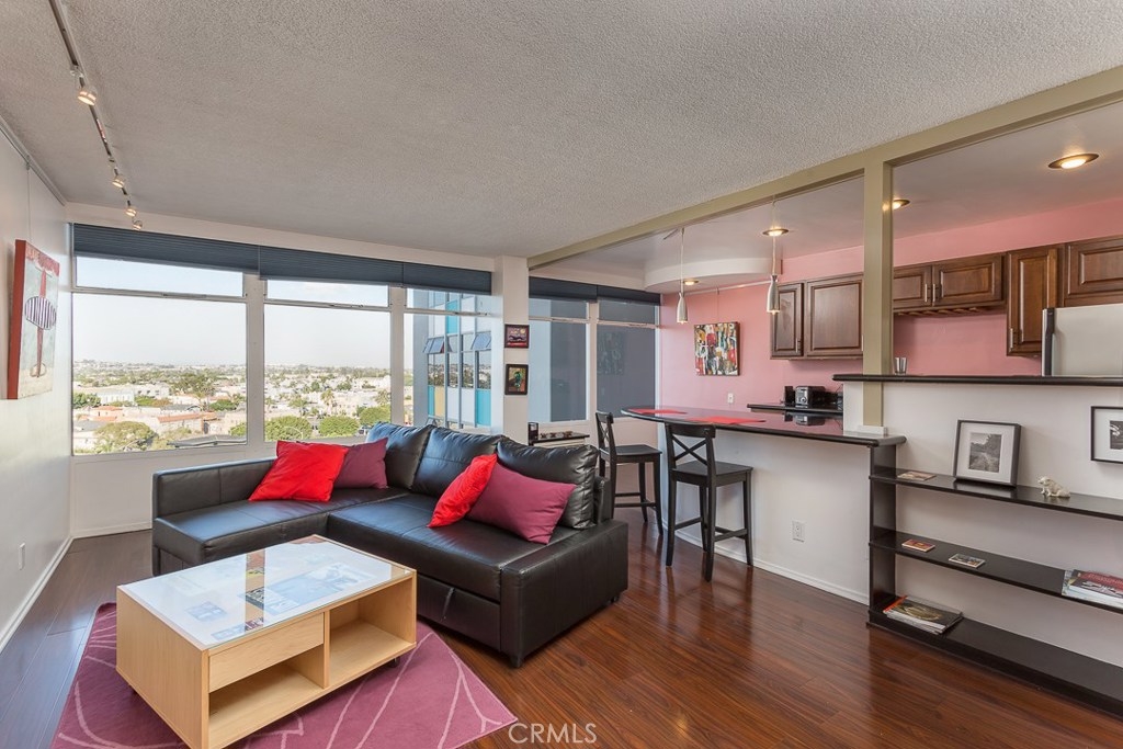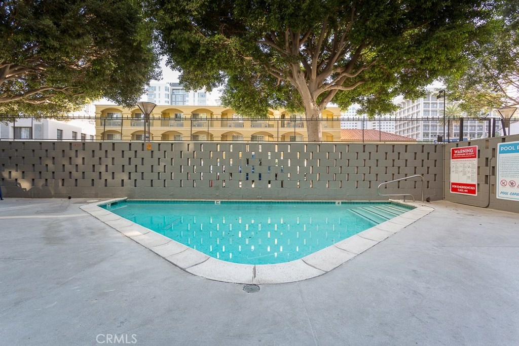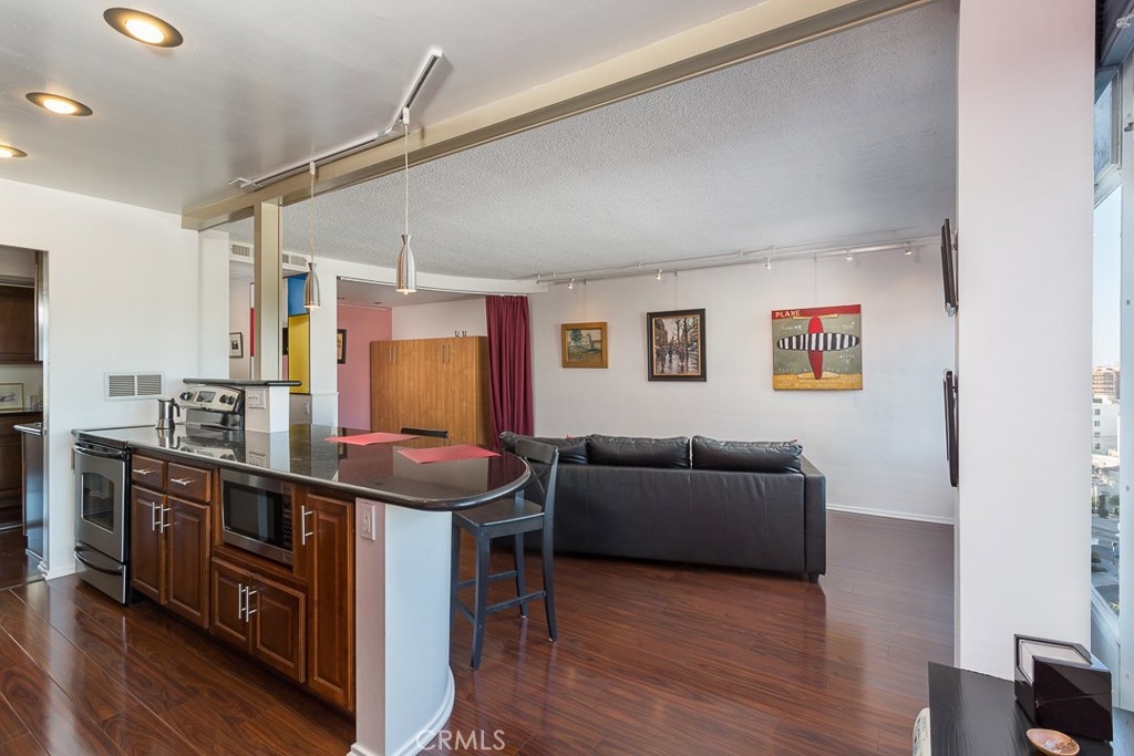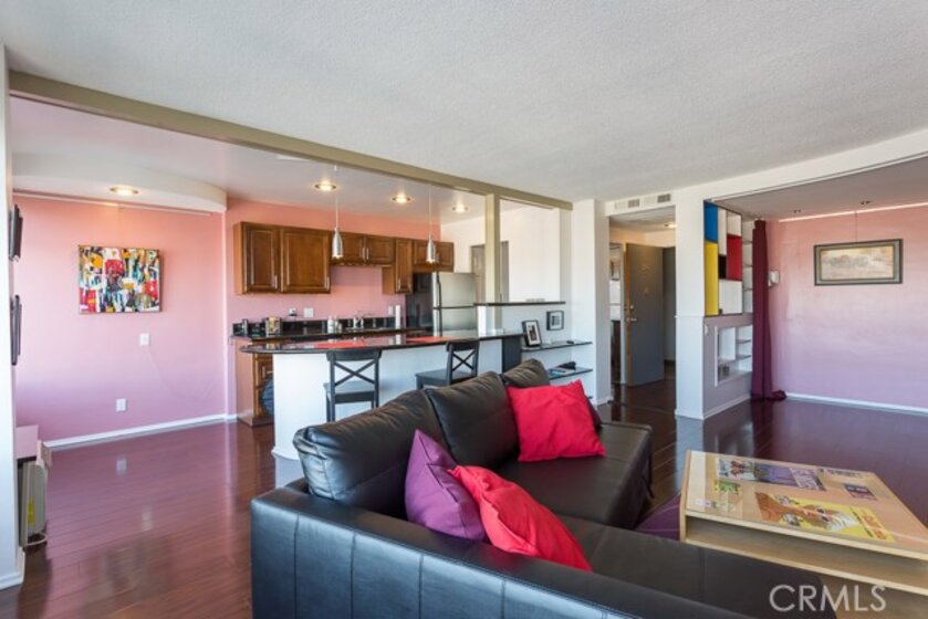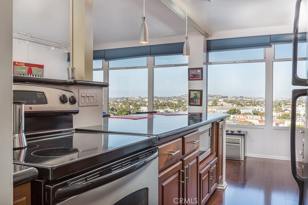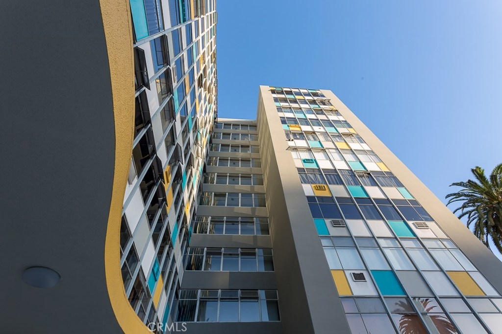 Welcome to this mid-century icon in the East Village - The Royal Palms! This high-floor studio unit features panoramic views of LA, Long Beach and Signal Hill. Laminate flooring throughout the living space, wall AC unit, updated kitchen with granite counter tops, solid wood cabinetry, and stainless-steel appliances. Nicely upgraded bathroom with tile accents and modern light fixtures. On-site parking is available on a waitlist basis. Off-site parking is available at many of the surrounding hotels and businesses from $55/month and up. One pet allowed up to 35lbs. HOA dues include onsite management, water, trash, sewer, hot water, common area maintenance, swimming pool, forced air heat, and nightly security patrol. Don't miss this opportunity!