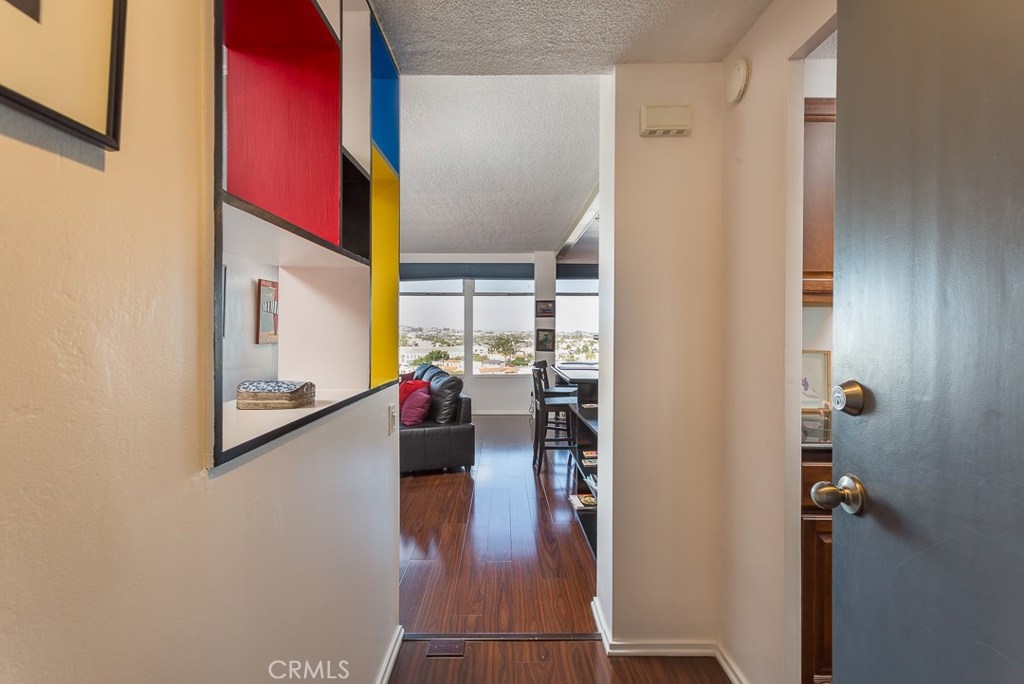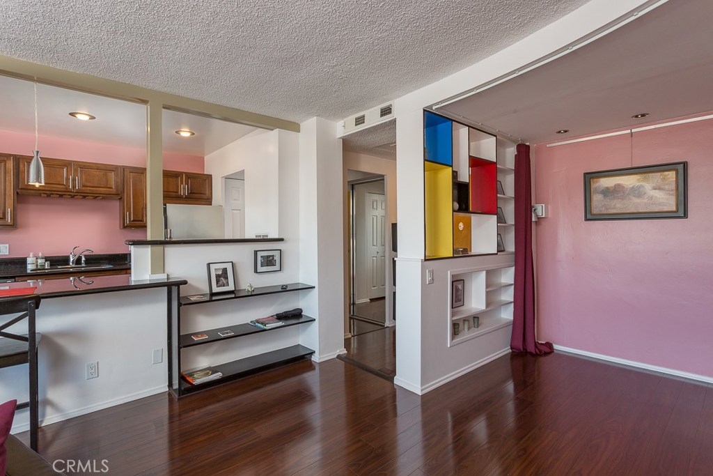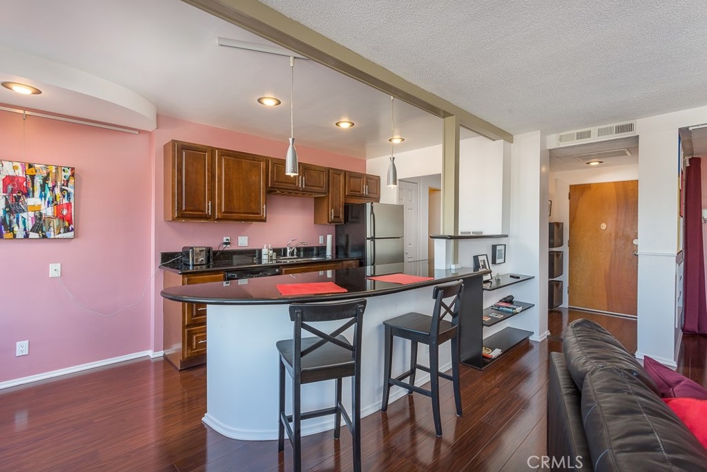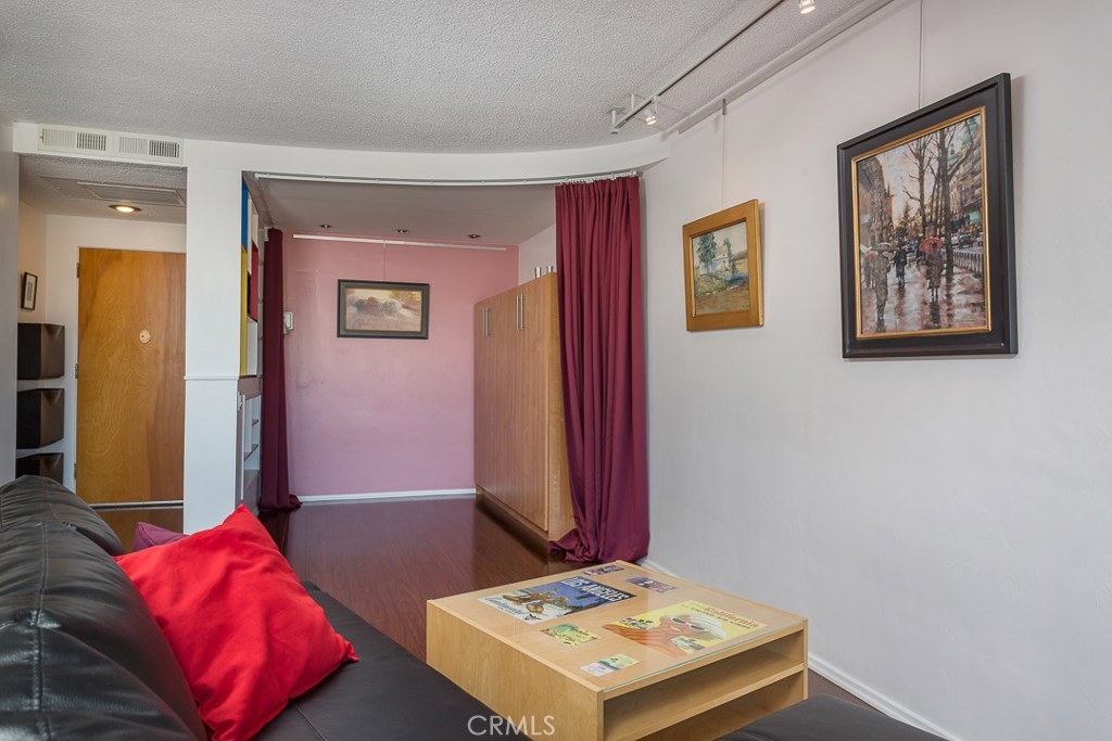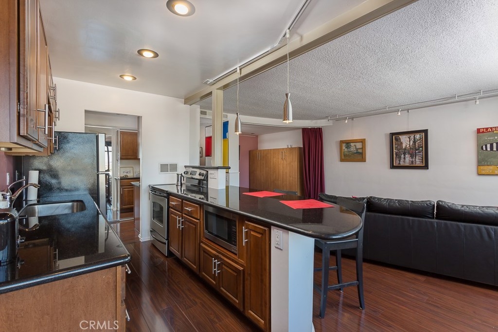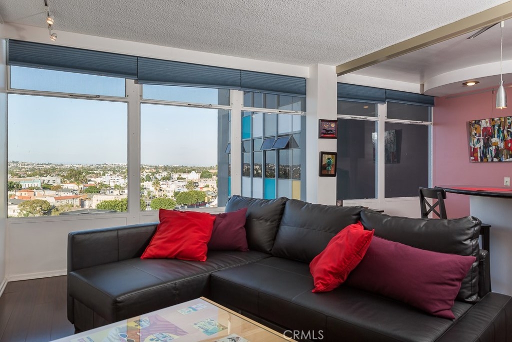 Welcome to this mid-century icon in the East Village - The Royal Palms! This high-floor studio unit features panoramic views of LA, Long Beach and Signal Hill. Laminate flooring throughout the living space, wall AC unit, updated kitchen with granite counter tops, solid wood cabinetry, and stainless-steel appliances. Nicely upgraded bathroom with tile accents and modern light fixtures. On-site parking is available on a waitlist basis. Off-site parking is available at many of the surrounding hotels and businesses from $55/month and up. One pet allowed up to 35lbs. HOA dues include onsite management, water, trash, sewer, hot water, common area maintenance, swimming pool, forced air heat, and nightly security patrol. Don't miss this opportunity!