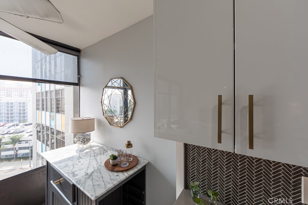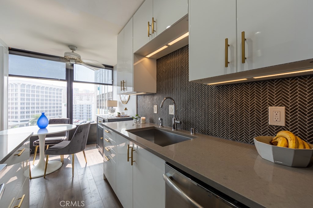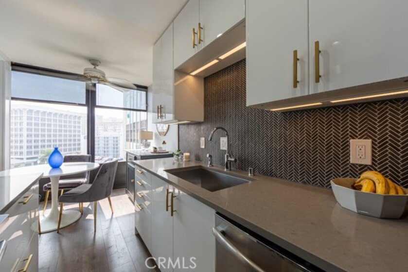 Step inside your newly upgraded living space with panoramic views to the marina and the Queen Mary! Picture-perfect during the daytime & the city lights sparkle like diamonds at night. This home has upgrades throughout and is sure to impress! The remodeled kitchen features a full suite of stainless steel GE appliances, a deep well stainless sink, a custom backsplash and beautiful white lacquer cabinetry with soft-close feature and quartz countertops. Just adjacent to your kitchen you'll find a very convenient portable washer & dryer nook. Your new bathroom has marble flooring, a deep soak tub and subway tile surround to give you a spa-like feeling. The Friedrich Wi-Fi controlled air conditioner will keep you and your guests completely comfortable. The Royal Palms is in the heart of the East Arts Village & boasts a small swimming pool, rooftop viewing deck and is pet friendly (size restrictions). Affordable association dues of $309 include water, trash, hot water, forced air heat, onsite management, 24 hour laundry, controlled access, video monitors, storage room, bike storage, maintenance and nightly security patrol. With a walk score of 97 you will find everything at your doorstep. Walk to nearby restaurants, coffee shops, theaters, cafes, art galleries, the Metro, Cider Houses, The Pike Outlets & the beach. Welcome home to 100 Atlantic Avenue, #815 - Truly a lifestyle you deserve!