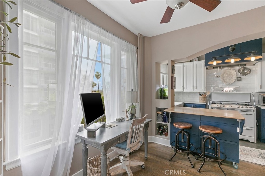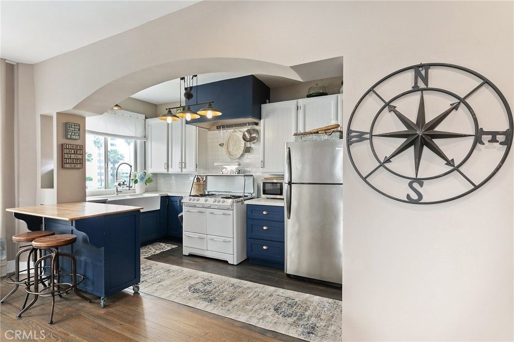 Beautiful corner unit in the Historical Sovereign in Downtown Long Beach . This spacious condo features a remodeled kitchen that includes a Custom Maple Shaker Style Cabinets with soft close drawers and doors , New hardware, Calcutta Quartz Countertop, Imported Italian Fireclay Farmhouse Sink, Commercial Grade Space Faucet and Antique O' Keefe and Merritt Stove (1948) also includes Library Ladder use as pot rack. Custom built coffee nook with Louvered Doors. The Living room has Vintage Style LED Dimmable light fixtures. Bathroom has custom tiled full shower enclosure with vintage style shower head and Vintage style sink and faucet. Hardwood floors refinished throughout the house. Walk in closet has soft close drawer, shoe storage and Vanity LED Lightning.