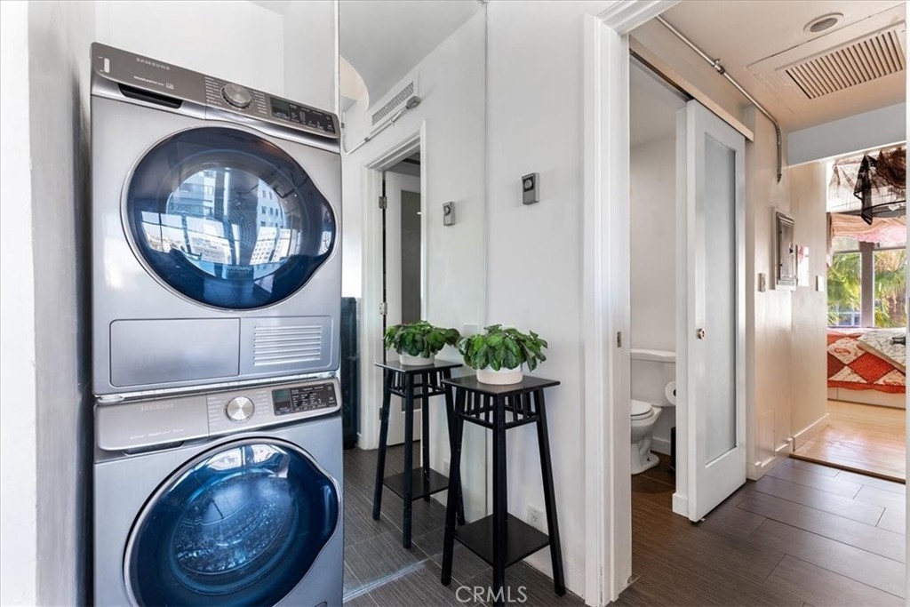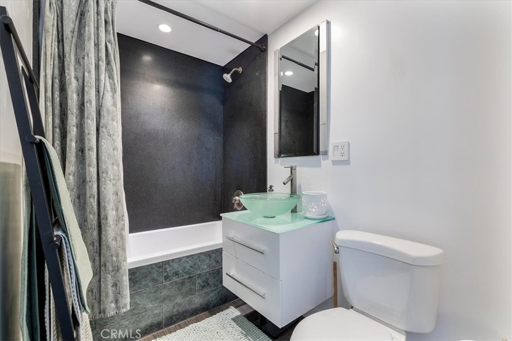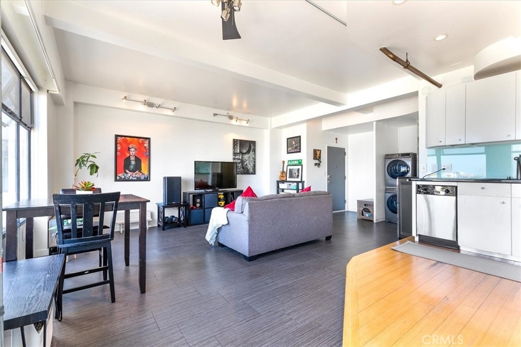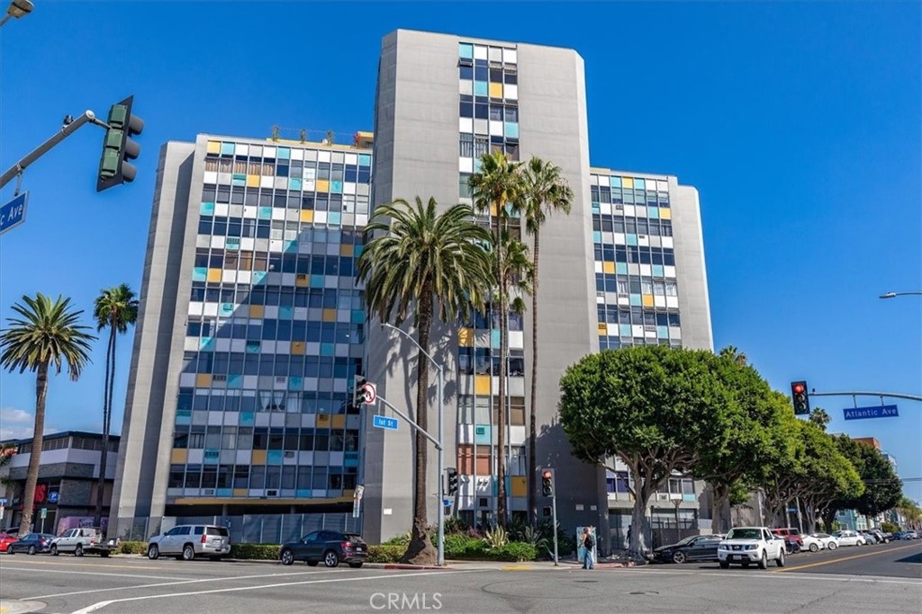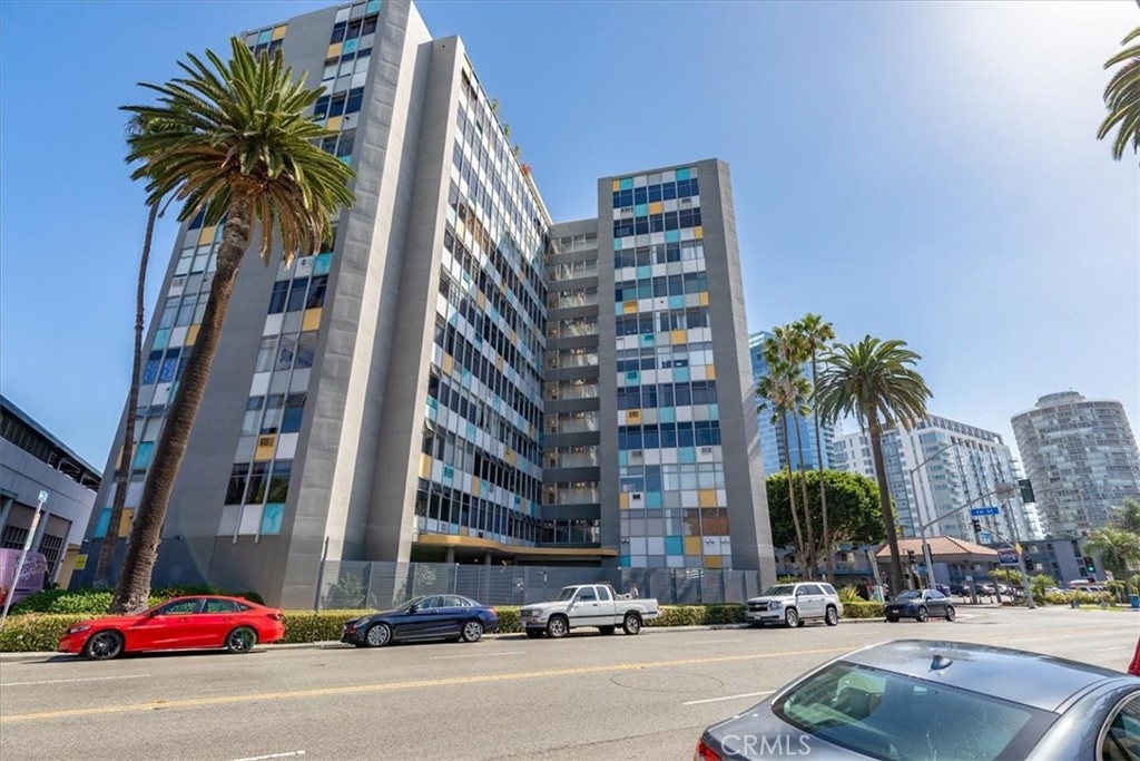 Welcome to this stylish mid-century modern condo in the heart of Downtown Long Beach! Located in the iconic Royal Palms building, this 2-bedroom, 1-bath residence offers 820 sq. ft. of thoughtfully designed living space with sweeping city views and a peek-boo view of the Queen Mary through oversized windows that flood the home with natural light. This is a end unit with only one shared wall. Seller also has an ASSUMABLE FHA loan with a 2.75% rate with approximate balance of $360K. Seller is willing to consider loan assumption. Step inside to find an open-concept floor plan featuring a modern kitchen with sleek cabinetry, granite countertops, glass backsplash, stainless steel appliances, and ample storage. RARE IN UNIT LAUNDRY! The spacious living and dining areas create the perfect space for entertaining or relaxing while enjoying the skyline views. Both bedrooms are generously sized, with the primary suite offering plenty of room for a retreat. The bathroom has been updated with a modern vanity, Full slab granite shower-tub combo, and vessel sink. This pet-friendly community includes 24 hour surveillance and an elevator with secure access required after hours, a refreshing pool, outdoor lounge areas, BBQ space, and laundry facilities. Perfectly situated on the corner of Atlantic Avenue and 1st Street, you’re just moments away from the beach, Shoreline Village, Pike Outlets, coffee shops, and award-winning restaurants. Easy access to public transportation and major freeways makes commuting a breeze. With its unbeatable location and vibrant downtown lifestyle, this condo offers the perfect blend of comfort and convenience.