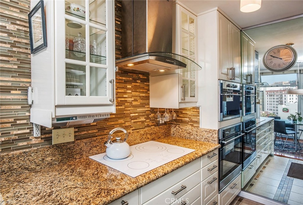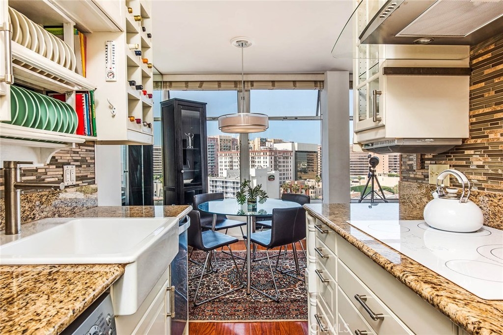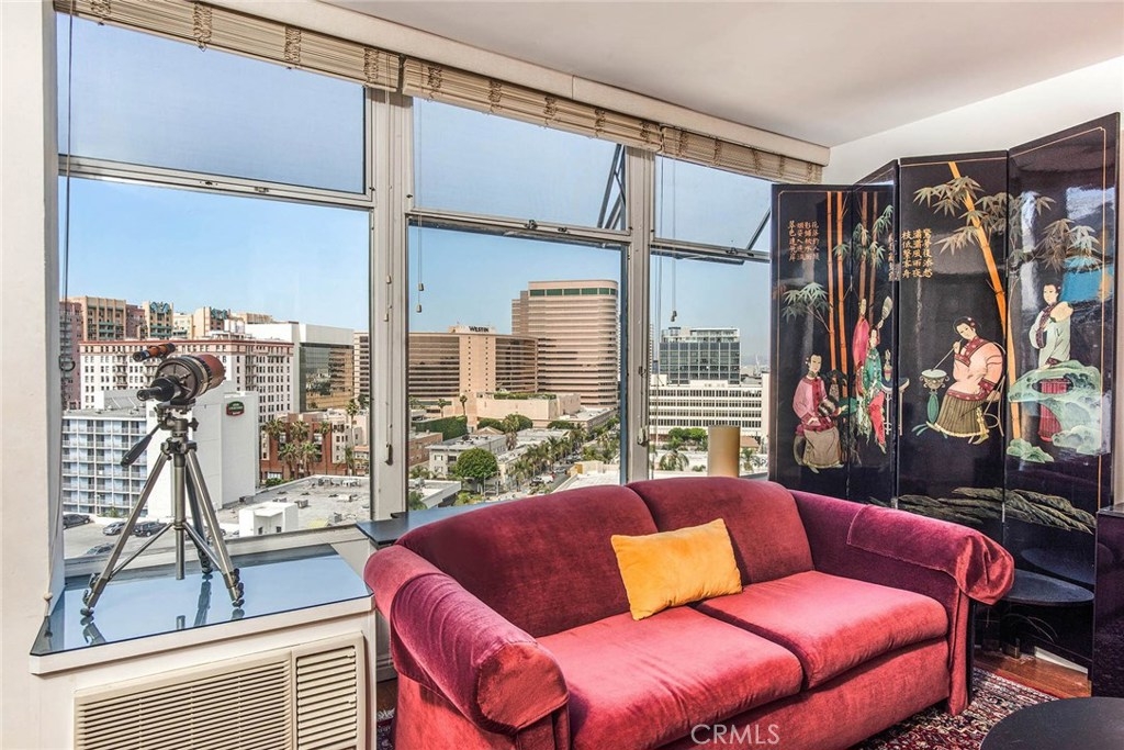 Highly upgraded, stunningly remodeled top floor one bedroom with amazing views in an iconic mid-century building located in the heart of the vibrant East Village, one of Long Beach’s most eclectic, fun and happening neighborhoods! Over $50,000 was spent on this custom high-end remodel which makes such efficient use of the space it feels double the square feet. Perfectly reconfigured, the layout boasts a good-sized bedroom, spacious living room, dining room, an office, lots of storage and an in-unit washer/dryer, a rarity in this complex. Great attention to detail and high quality finishes are throughout. There is a dual and triple zone cooktop, convection oven, built-in microwave, Bosch fridge, dishwasher, quartz counters, glass backsplash and custom soft close cabinetry in the lovely kitchen. Both the living room and dining room are framed by breathtaking views – enjoy sunsets, sit by one of the two fireplaces (there is one in the dining room and one in the living room!) and gaze at the world from above. The gorgeous bathroom has marble tile, a tumbled stone bath surround, a custom vanity and shower door, even a bidet. The bedroom fits everything you need perfectly and has double doors which you can leave open to enjoy the view. There is custom lighting throughout the home and yes, new AC! A small office completes the space. Downstairs there is lovely pool and entertainment area. All of this just steps from cafes, restaurants, galleries, shopping and nightlife. Enjoy!