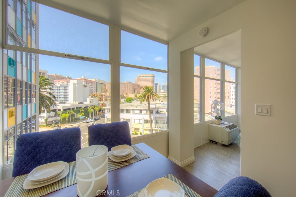 This spacious remodeled studio includes smooth ceilings, fresh paint, recessed lighting, new stainless steel refrigerator, washer/dryer, beautiful hexagon tiled bathroom floor with a shower surround of custom subway tile, new ceramic tile in kitchen and dining room as well as new laminate wood floors throughout. Air Conditioning keeps you nice and cool. From the wall-to-wall windows you'll have a commanding view of the downtown skyline and stunning city lights at night. Nearly 20 feet of closet and storage space is a fantastic added bonus! Located in the heart of the East Arts Village in downtown Long Beach where nearly everything is at your door. Enjoy the cafes, shopping, theaters, coffee shops and art galleries, public transportation, Metro, Bike share program, dining and art walks! Very low HOA dues of only $274 monthly pays for onsite management, water, trash, sewage, hot water, forced-air heat, common area maintenance, nightly security patrol, sparkling swimming pool and onsite laundry room. The Royal Palms has  approximately $1.5million in reserves and has just installed new elevators. Your pet 35 lbs or less is welcome. Parking is via a waiting list. As one owner sells, their space goes to the next owner on the list at $50 a month fee. While your name works it's way up the list, surrounding lots are outside the door and offer monthly permits from $55+ monthly depending on the lot. Welcome home to 100 Atlantic Avenue #503, truly a lifestyle you deserve!