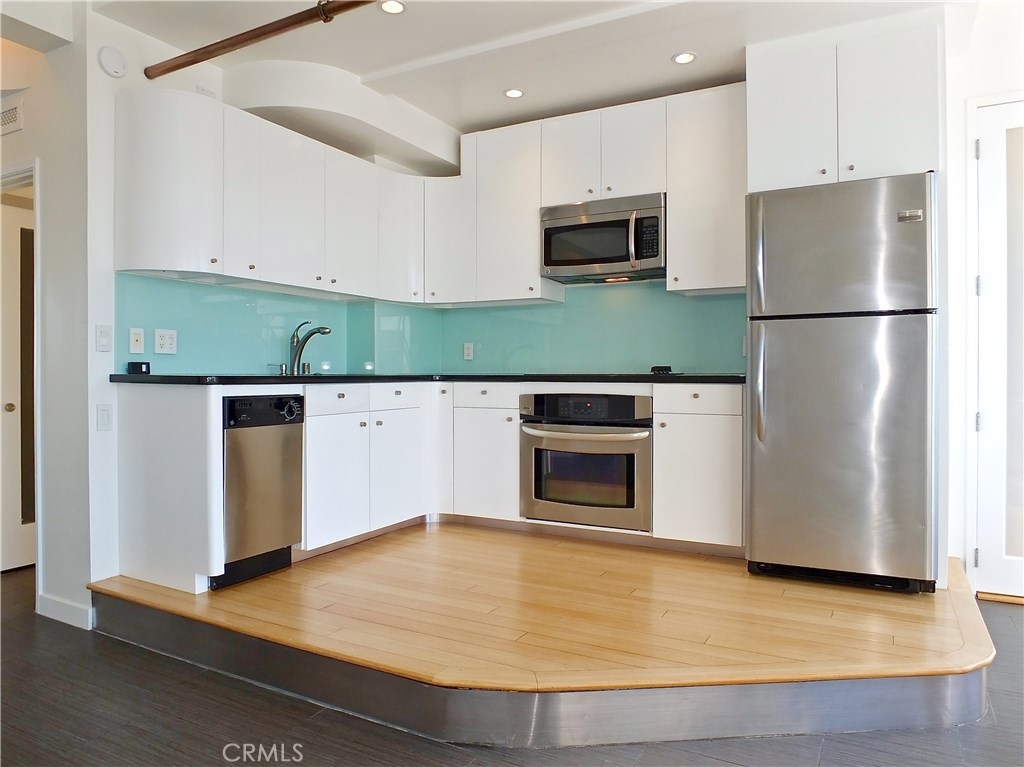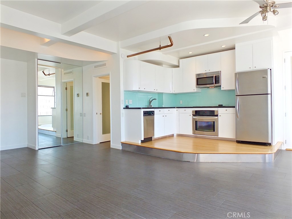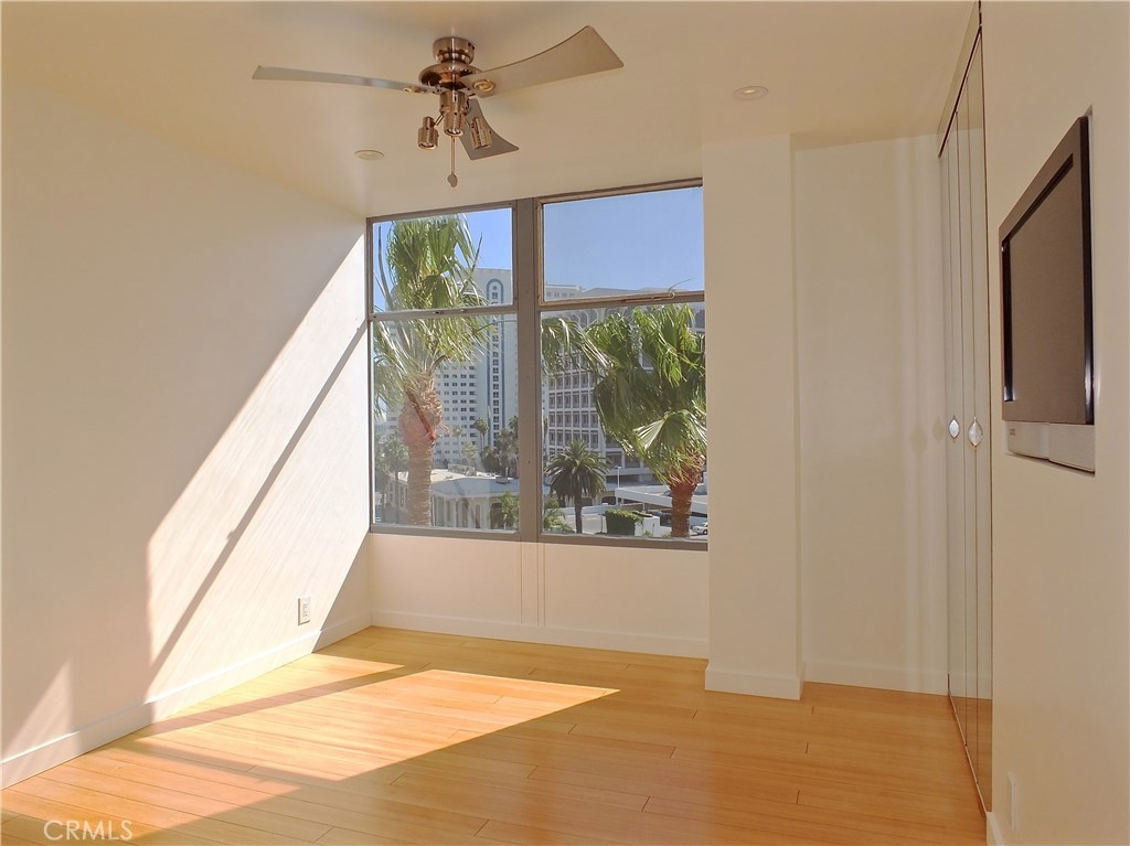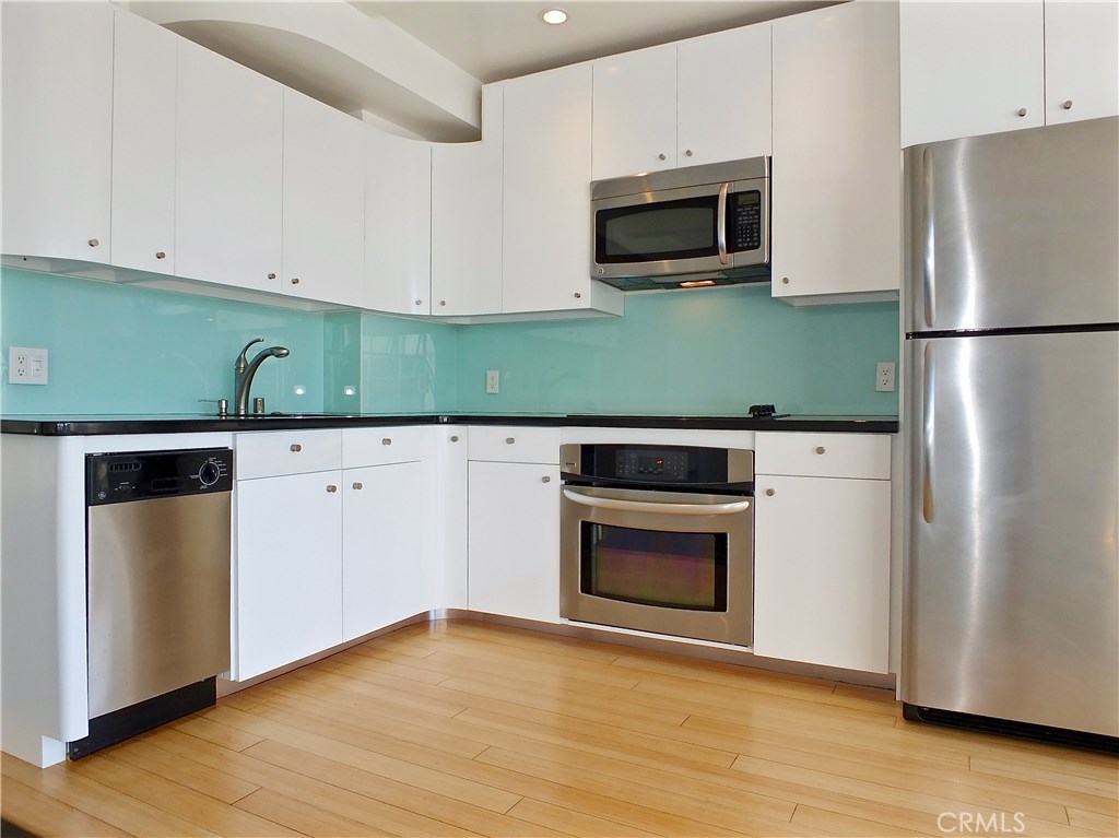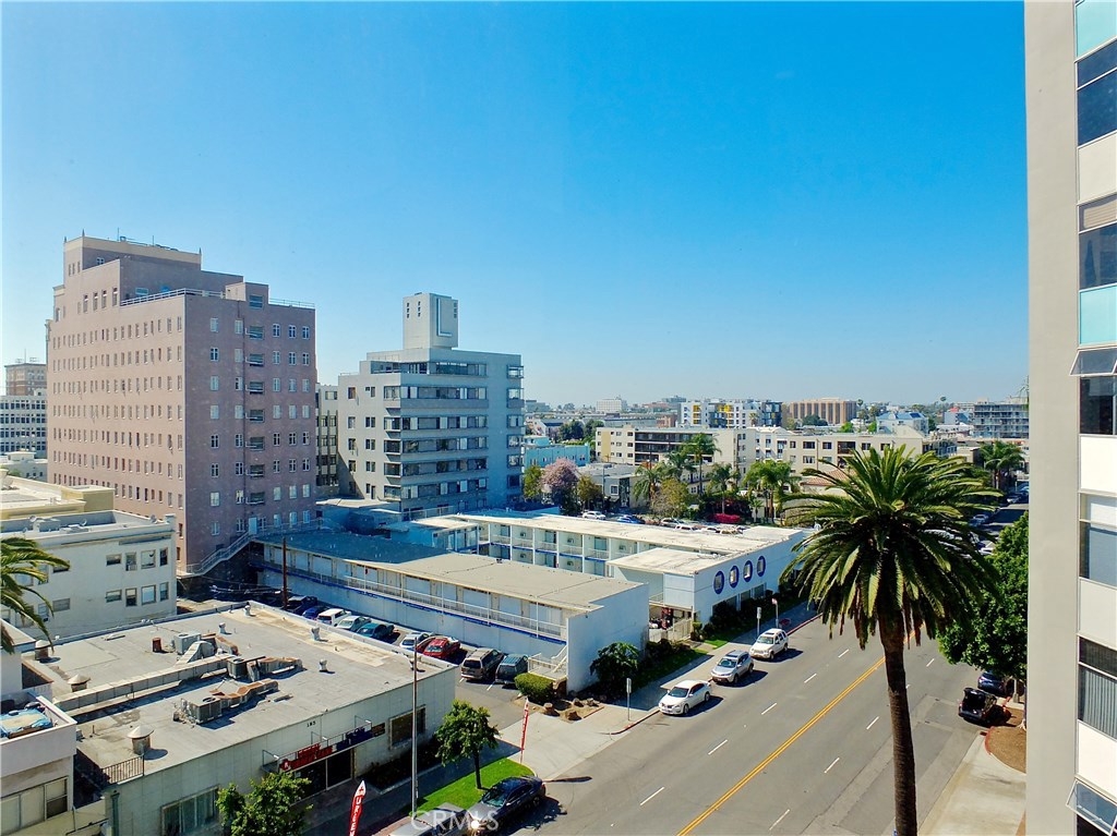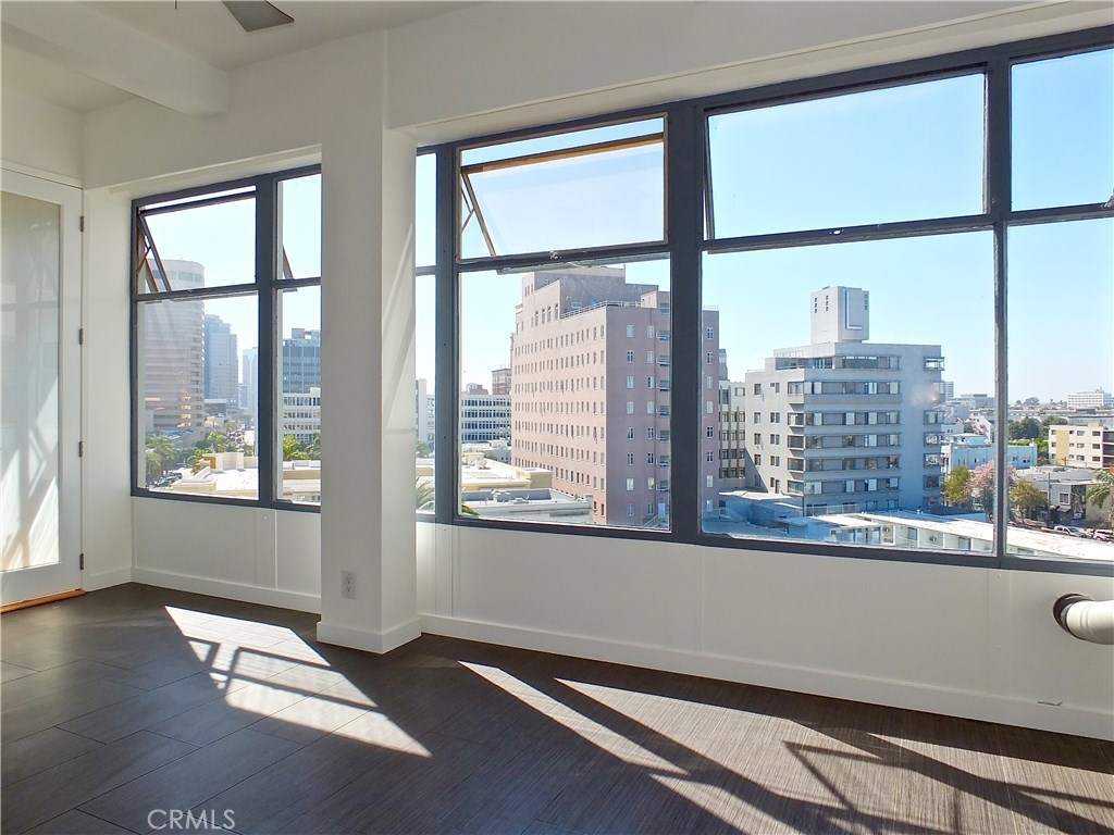 Located in the heart of the East Village Arts District of Long Beach, The Royal Palms is an 11-story building that lends a healthy mid-century look to the downtown skyline. Renovated and upgraded to reflect a modern lifestyle with an urban and European design aesthetic, this 7th floor unit, has great city views and light, with lots of huge windows and high ceilings. A corner unit with only one shared wall, high above the city streets, like an oasis in the heart of the city. Tile flooring through the living and bathroom areas and bamboo in the bedrooms. The raised kitchen platform with open walls, creates a large and inviting great room. Stainless appliances, custom cabinetry, glass backsplash and Galaxy Black granite add to the modern and sleek style of the unit. Custom cabinet in bathroom with grout-free panels of Galaxy Black granite in shower enclosure and on counter top. Walking distance to the beach, metro rail, shops, restaurants, and waterfront attractions.