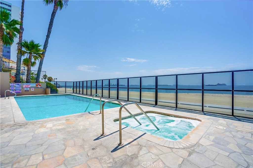 Captivating Ocean Views! Gaze at the ocean for hours from this upgraded oceanfront 15th floor condo! Work from home in your own piece of paradise or have an easy commute to Los Angeles and Orange County. This light filled home features floor to ceiling windows, laminate flooring, and central heat and air. Parking is an ease with a prime spot in the parking garage with storage cubbies. HOA fee includes high speed internet, wifi, cable TV, water, partial earthquake insurance, and 24/7 maintenance staff. Imagine sipping your favorite beverage from the sun deck after spending time in the jacuzzi or sauna. Feel gentle breezes in the heated saltwater pool that has an ocean view. Direct access to the beach and bike path, and the sunrises and sunsets are impeccable from the sandy beach or from your spacious living room. Reserve the oceanfront community room for larger gatherings and use the updated kitchen, pool table, ping pong table and gym at your convenience. Belmont Shore, Pine Street, Shoreline Village, Farmers Market, LB Museum of Art and Yoga on the Bluff are all nearby.