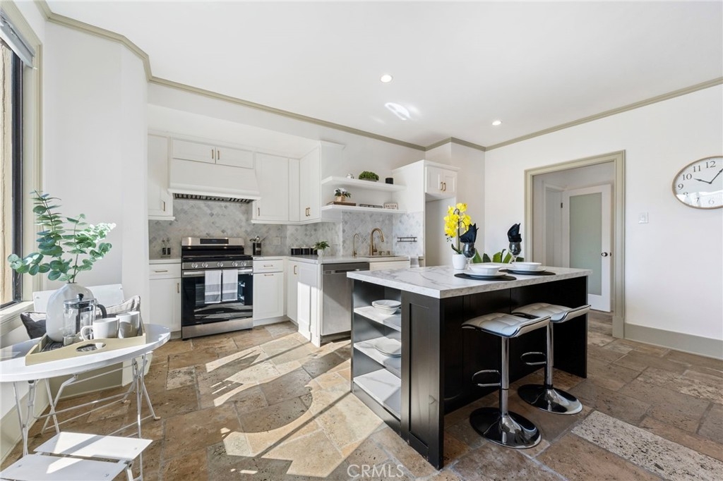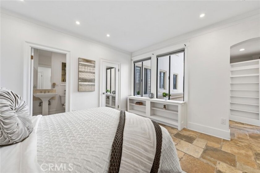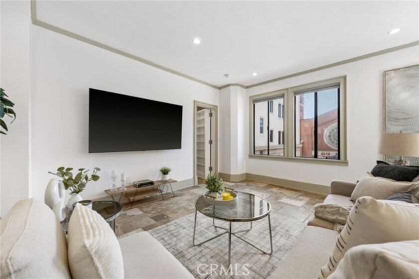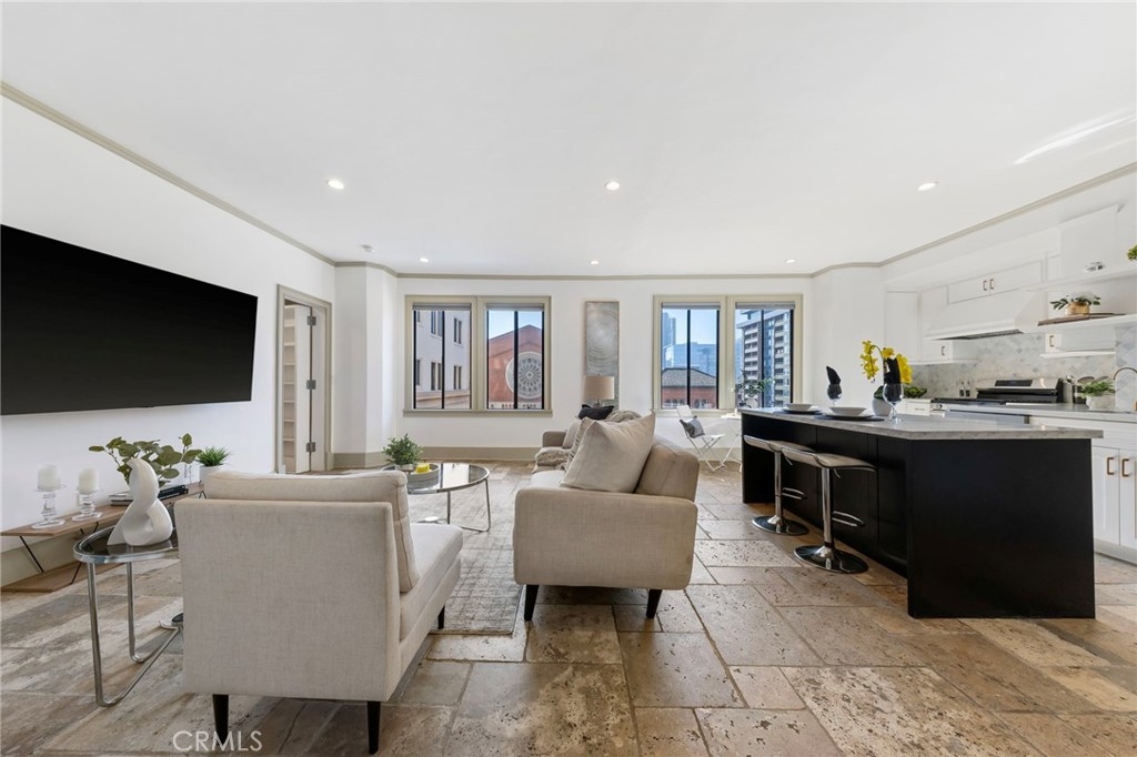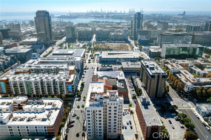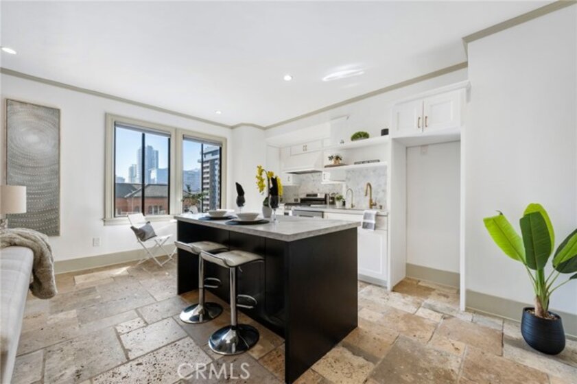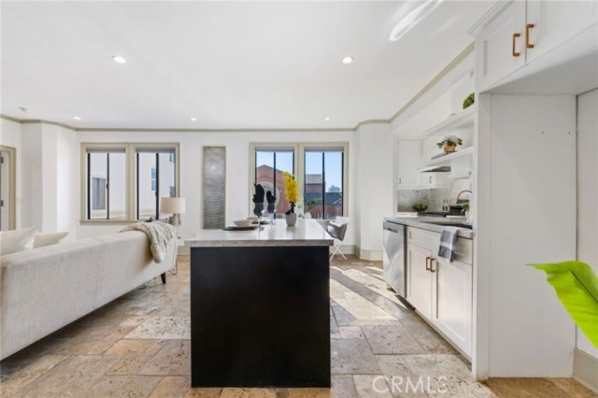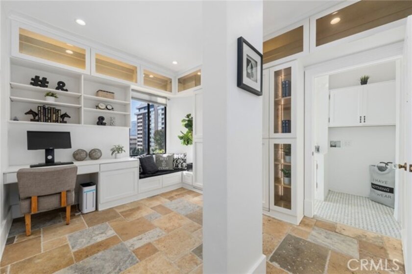 Discover a truly exceptional and unique residence in the iconic Willmore Building - a stunning, oversized unit created by merging two homes into one expansive and thoughtfully designed space. This remarkable property features an open floorplan wrapped in elegant stone floors, centered around a recently renovated kitchen with quartz countertops, a striking designer backsplash, an oversized eat-in island, and a charming brunch nook that flows effortlessly into the bright and airy living room. Large windows frame neighborhood views and fill the space with natural light. The two bedrooms sit on opposite wings for added privacy, with the primary suite tucked behind a hidden bookcase entry and offering its own full bathroom and large closet. The second bedroom, cozy yet beautifully appointed, includes custom built-ins, a window bench overlooking the city, and direct access to the in-unit laundry and a fully remodeled bathroom featuring a glass-enclosed shower, mosaic tile details, and abundant sunlight. The historic building features a lavish entry, a restaurant downstairs that offers owner discounts, a beautiful solarium, 360 rooftop terrace and dues cover all utilities (except cable/internet). All of this is just moments from Downtown Long Beach, The Pike, renowned dining, the beach bike path, the Queen Mary, and the best of coastal urban living.
