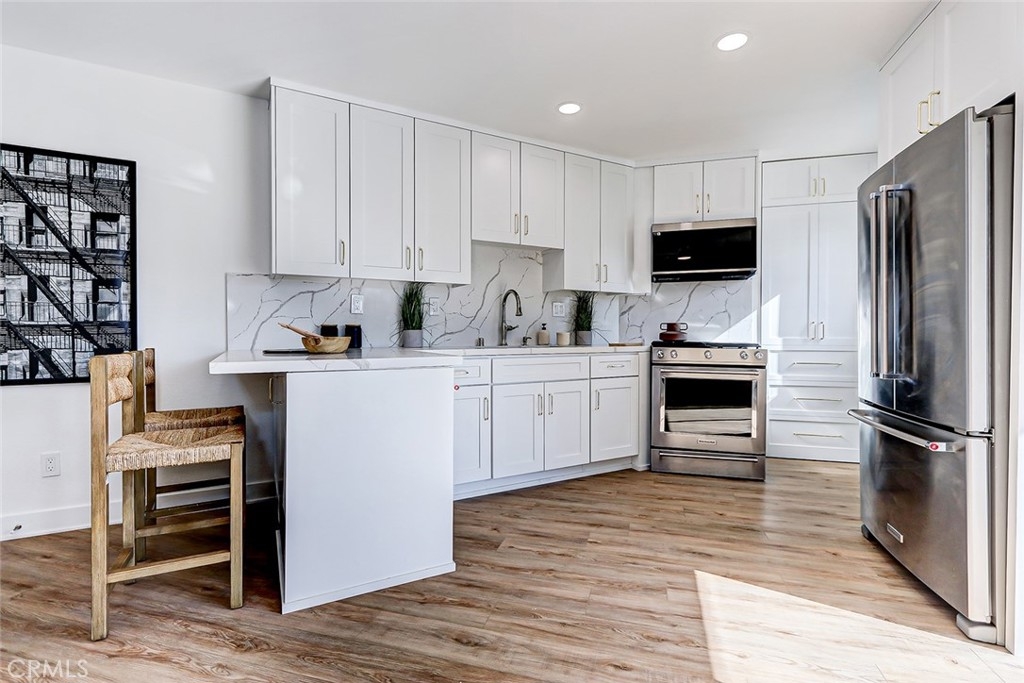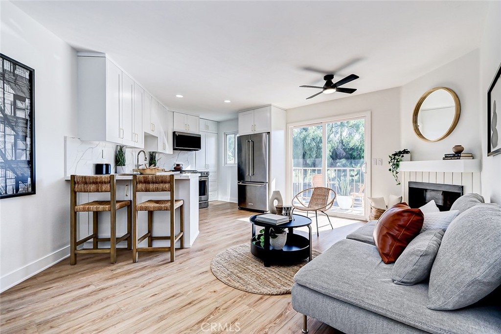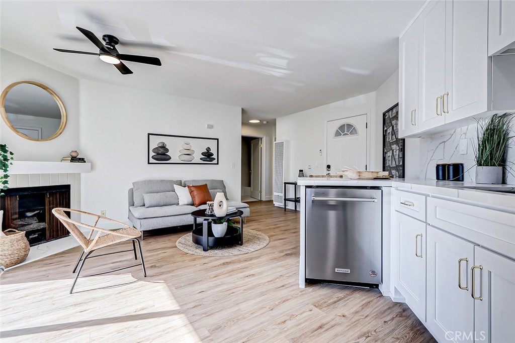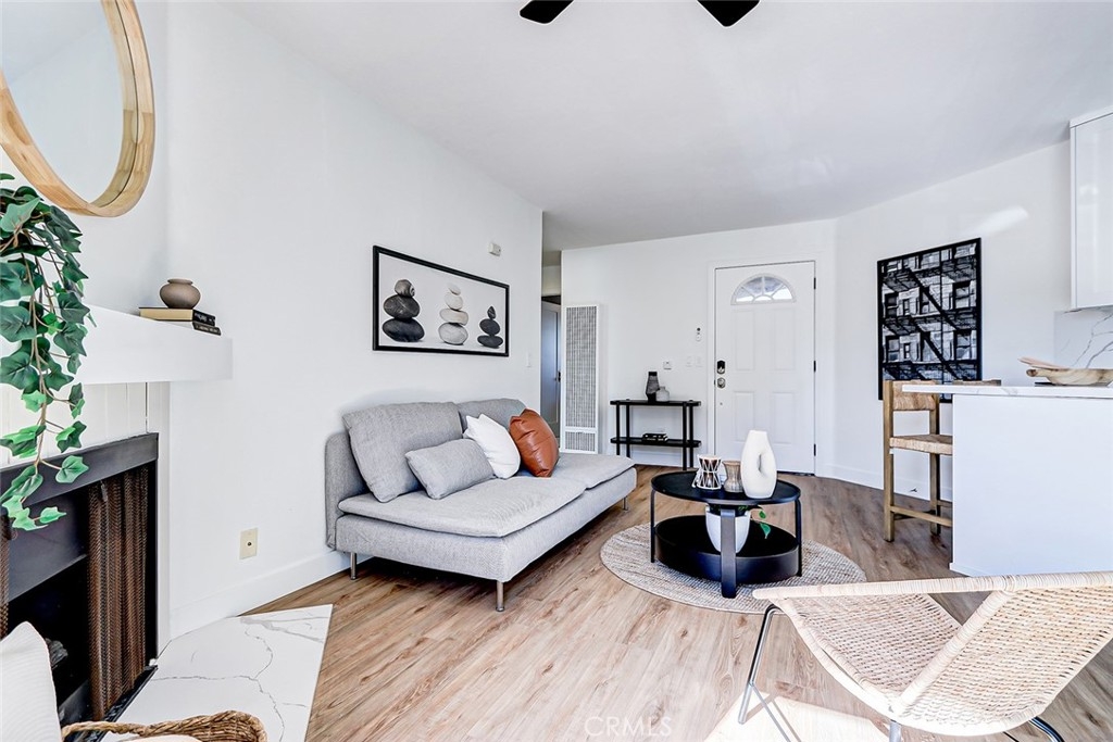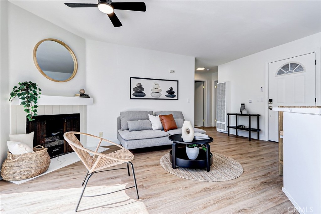 Stunningly Renovated 2-Bedroom, 1-Bath Condominium with Breathtaking Golf Course Views Step, where style and comfort seamlessly blend. The open floor plan is accentuated by brand-new engineered hardwood floors that flow throughout the main living areas, while the bedrooms are cozy with fresh, plush carpeting. The kitchen is a true showstopper, featuring sleek white cabinetry, top-of-the-line stainless steel appliances, and stunning quartz countertops—perfect for both cooking and entertaining. The spacious living room invites relaxation, with a charming fireplace creating a warm, inviting atmosphere. Step through the sliding doors to your private balcony and take in the serene, lush views of the golf course—an ideal spot for al fresco dining or simply unwinding in peace. The bathroom has been tastefully updated, offering a newly tiled shower, and polished nickel fixtures. Additional upgrades include recessed lighting, stylish new ceiling fans in every room, and fresh, neutral paint throughout, creating a bright and airy environment. For ultimate convenience, an in-unit laundry nook provides a tucked-away space for your laundry needs, and two assigned underground parking spaces are included, offering added security and ease. Located in a prime area with easy access to shopping, dining, the beach, entertainment, top-rated schools, and major freeways, this condo is truly a dream come true. Move-in ready and waiting for you—come see it today!