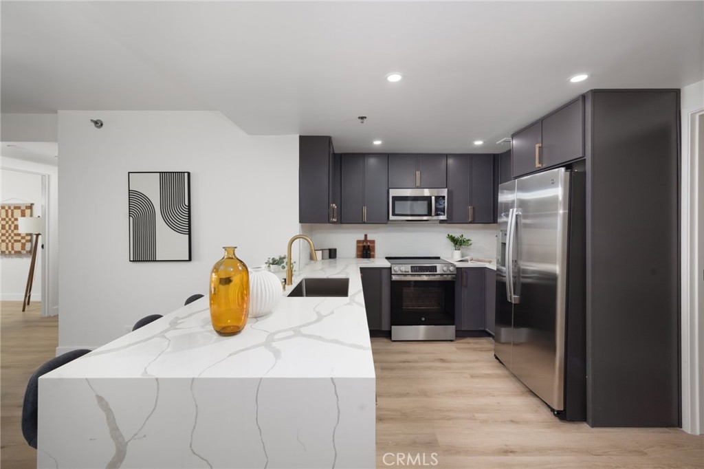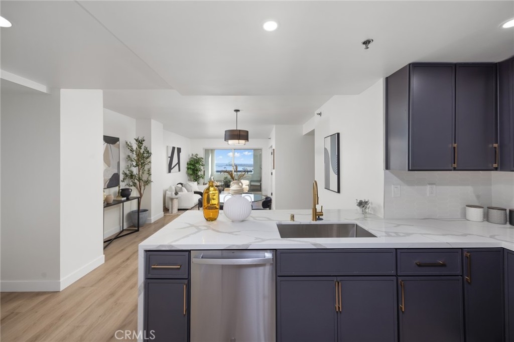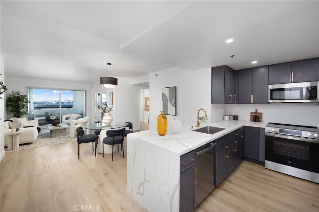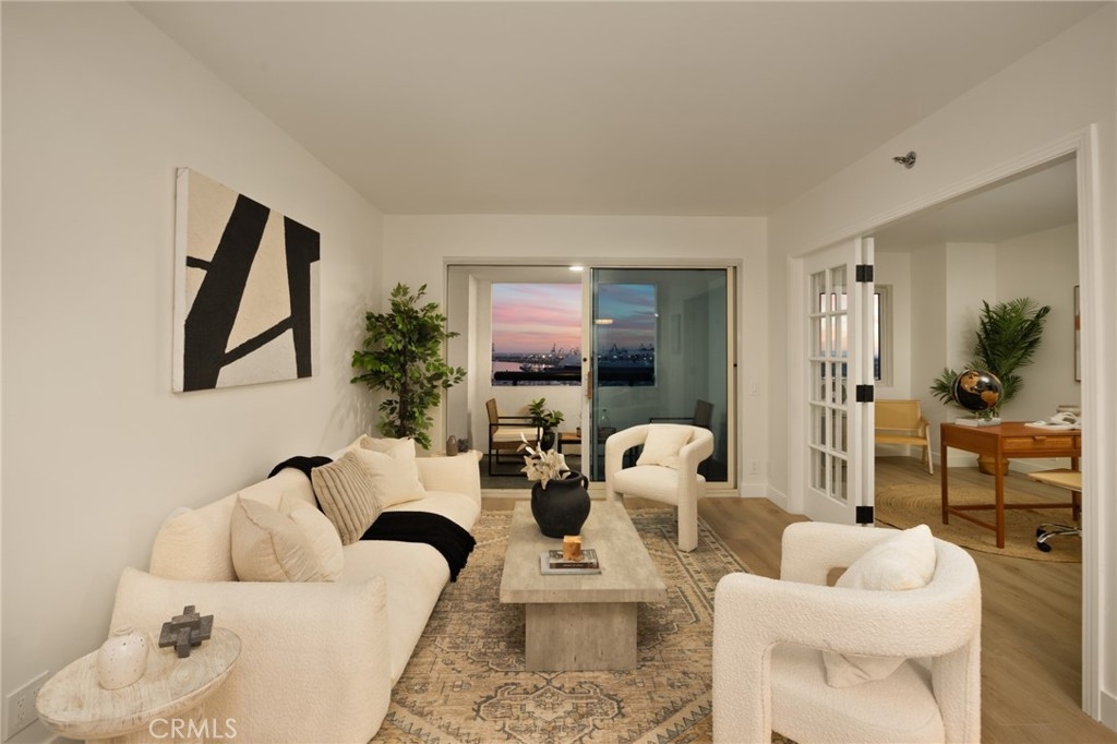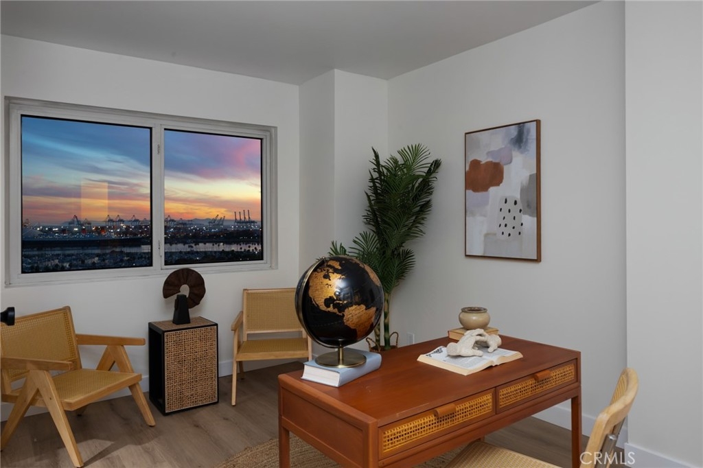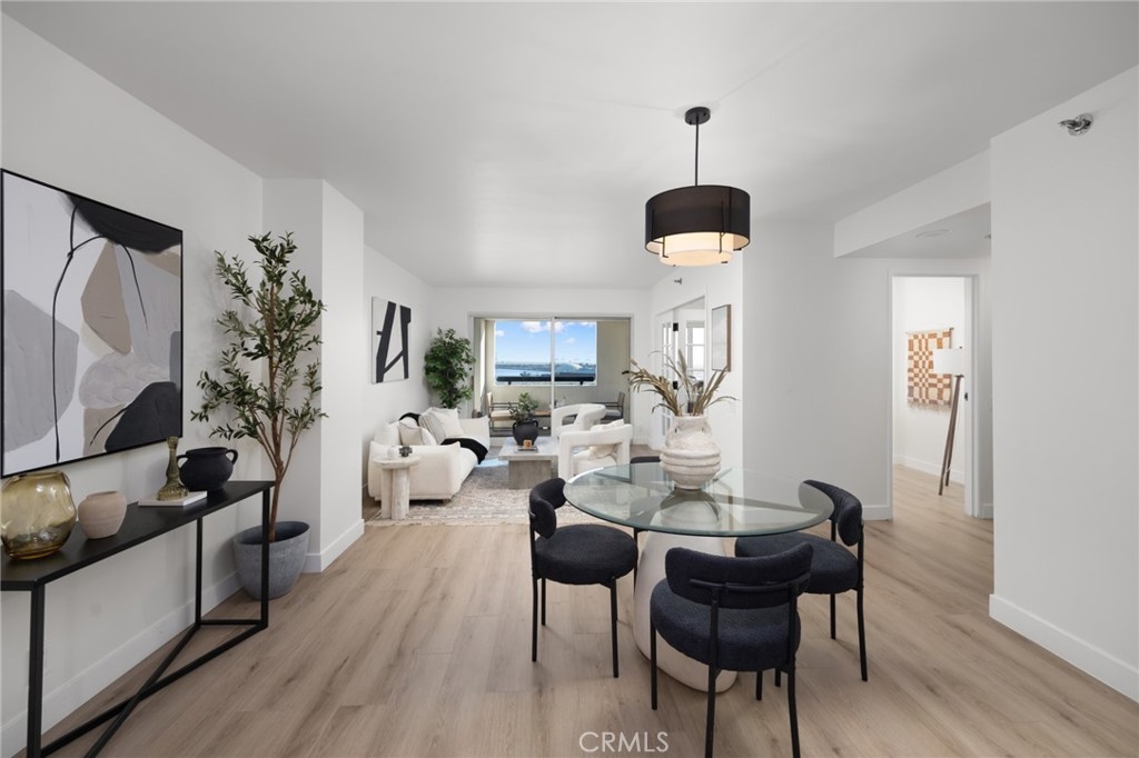(Back on market! not due to any fault of the home) Enjoy breathtaking panoramic views from this highly updated 2 bedroom 2 bath luxury condo. One of the sought after (05) units with arguably the best views in the complex. Upon entering you are greeted by a sunlit interior with crisp white tones, warm white oak colored flooring and a modern aesthetic. Whip up delectable meals in the chefs kitchen complete with new Stainless steel appliances, handsome thin border grey shaker cabinets and designer picket tile backsplash. Enjoy waking to ocean views in the spacious primary suite, featuring a large walk in closet, with highly updated bath, oversized tile walk in shower complete with premium brushed bronze hardware. The second bedroom also features ocean views with a fully updated interior. Other features include in unit washer & dryer HVAC, Rare SIDE BY SIDE PARKING (Not the traditional tandem parking spots). Harbor Place Tower is a modern 23 story building in the heart of downtown Long Beach with luxury amenities, including resort style heated pool, spa, saunas, modern fitness center, ping pong, bike storage, and 24/7 on-site security. Just walking distance to the beach, harbor, Shoreline Village, Terrace Theater, convention center, the Pike, Pine Ave restaurants, nightlife and so much more! Parking easy with 2 full sized side by side parking spaces and 80 guest parking spaces!