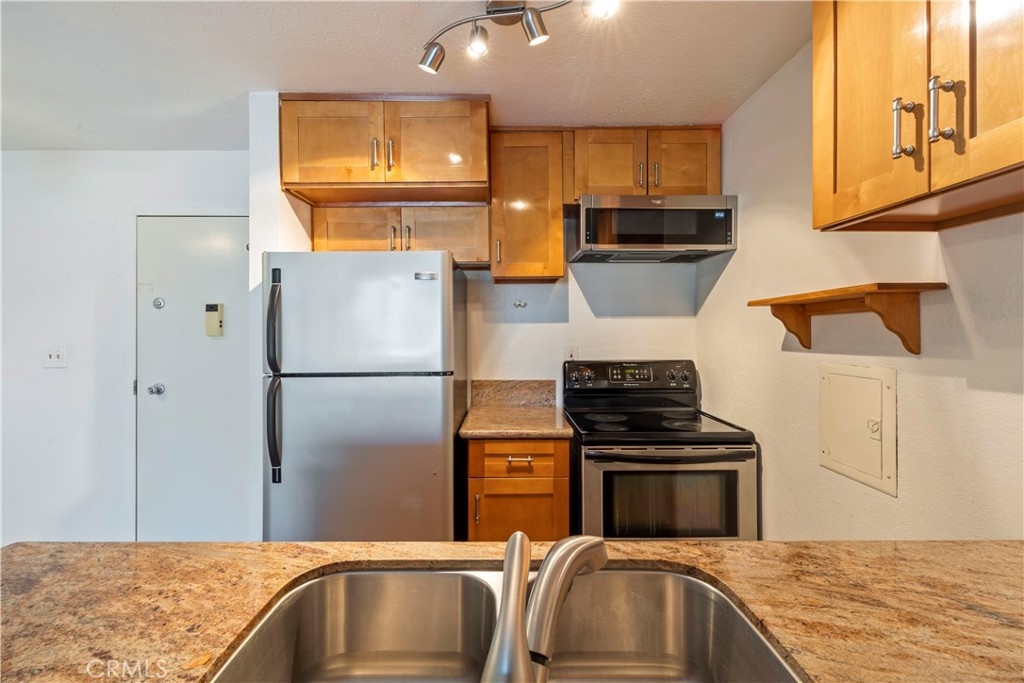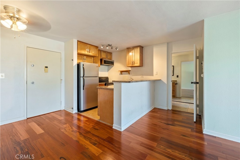 Updated ground-floor condo with hardwood floors in the living area, bedroom, and tile in the bathroom. The kitchen and bathroom feature granite countertops and stainless steel appliances. The unit has an assigned parking space and offers a quiet location at the back of the building, away from the noise of Pacific Coast Highway. Park Ocean is a well-established community in Long Beach. The complex, built in 1970, features 220 units across three stories and provides a range of amenities for residents, including a communal swimming pool, spa, fitness center, clubhouse, and barbecue area. The building is gated for security and offers on-site laundry facilities. The fantastic location near California State University, Long Beach, offers easy access to grocery stores, medical offices, and public transportation. This peaceful residential setting offers convenience and essential amenities all in one place.