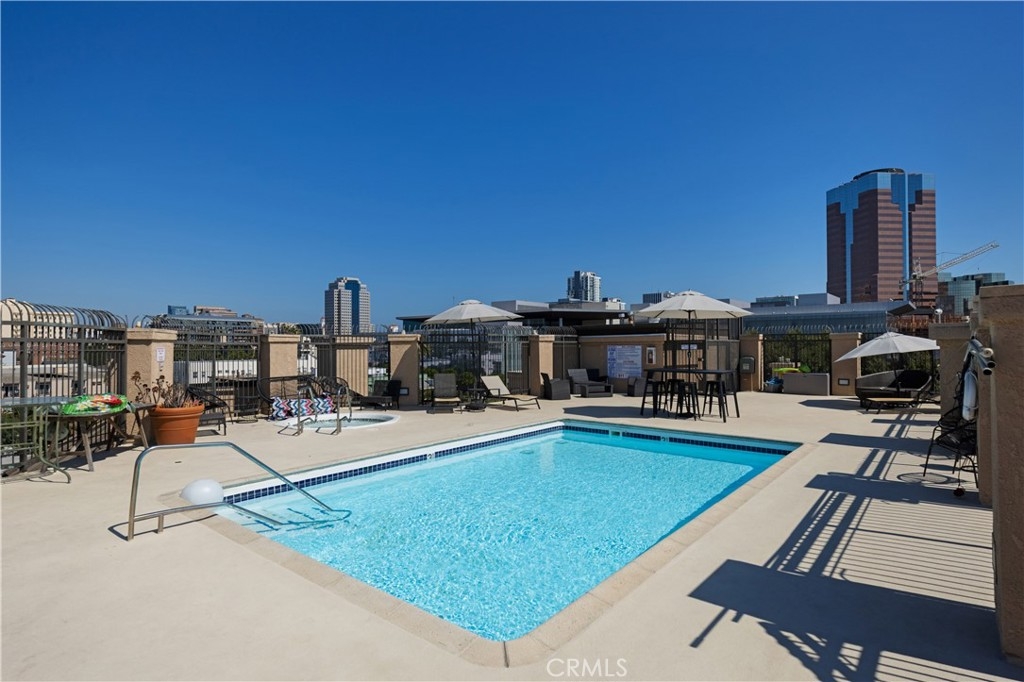 Welcome home to this top-floor two-bedroom, two-bath condo in the heart of downtown Long Beach. Unobstructed city skyline views, two private balconies, and a rooftop pool and jacuzzi deck make this feel like resort living, all within close proximity to the best downtown has to offer. The living room anchors the space with wide-plank LVP flooring, a gas fireplace framed by a wood mantel and cobalt blue tile surround, and wood-framed sliding glass doors with wood shutters that open to the first balcony and flood the space with natural light. The layout flows into a flex dining and work area anchored by a built-in wood hutch with glass upper cabinets, tray ceiling, and ceiling fan. The kitchen is fully equipped with a Thermador gas range, stainless refrigerator with water line, built-in microwave, Bosch dishwasher, garbage disposal, and water filtration system. Stone-look counters, recessed lighting, and cabinet storage round out the space. The primary suite connects directly to the second balcony through sliding glass doors flanked by a full wall of louvered wood closet panels. The en-suite bath features a tile vanity with wood cabinetry and a glass block walk-in shower. The second bedroom is generously sized with LVP floors and its own large window, walk in closet and is currently configured as a studio and office. The second bath has a white shaker vanity with brushed nickel fixtures and a tub/shower combo. In-unit laundry with a stacked LG front-load washer and dryer stays with the home. Two-car tandem parking in the secured community garage is included, with bike storage available. The rooftop pool and jacuzzi deck delivers sweeping downtown skyline views, lounge seating, and shade umbrellas throughout. HOA dues cover water, trash, sewer, pool, jacuzzi, security, elevators, janitorial, and master insurance. Up to one dog, one cat, or comparable domestic pet permitted. The restaurants, galleries, and energy of downtown Long Beach are right outside your door, with the waterfront just beyond.