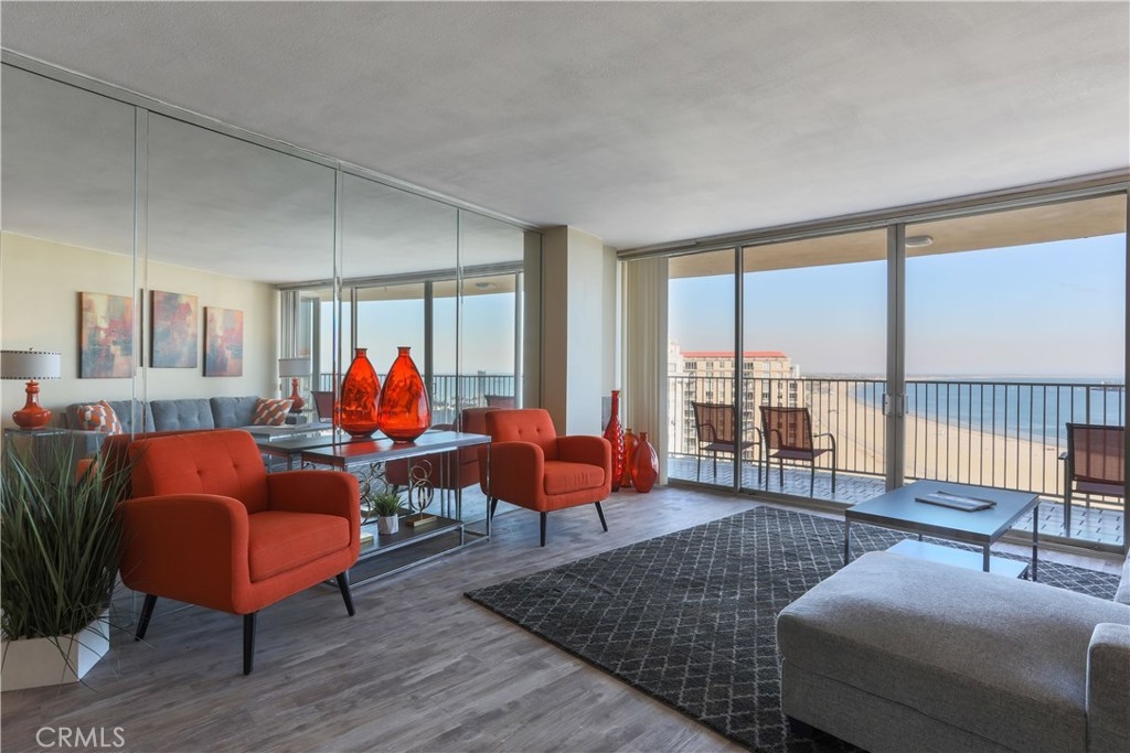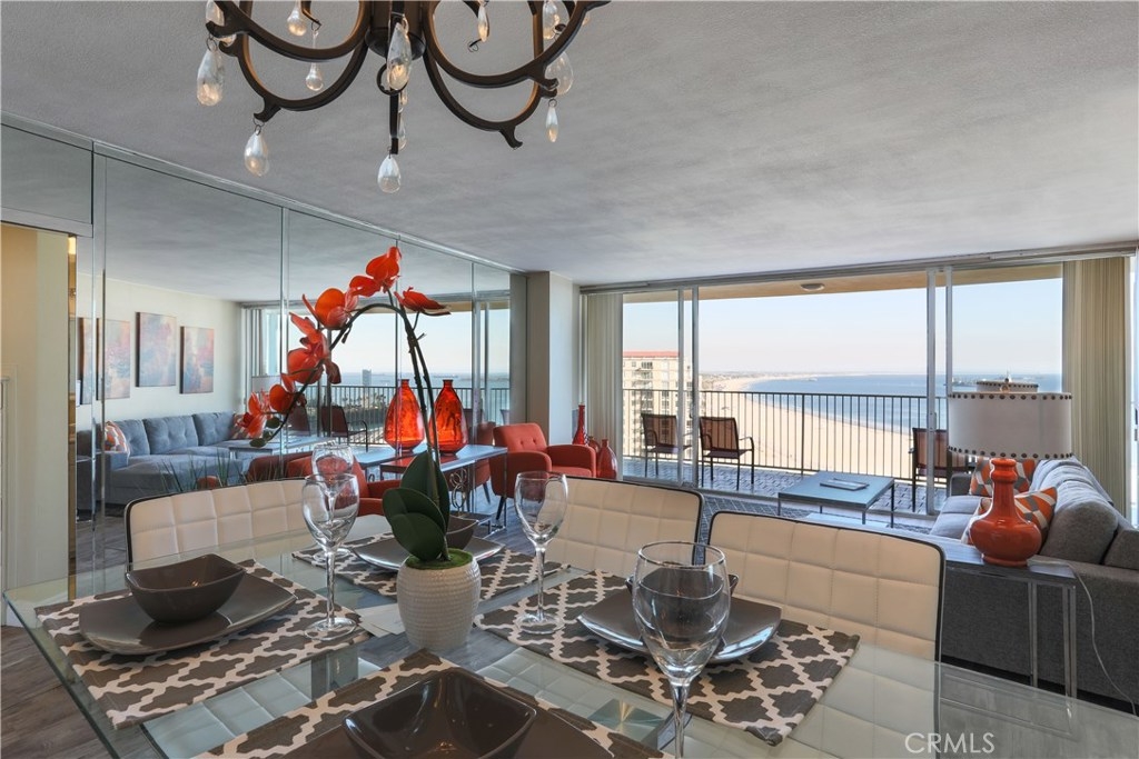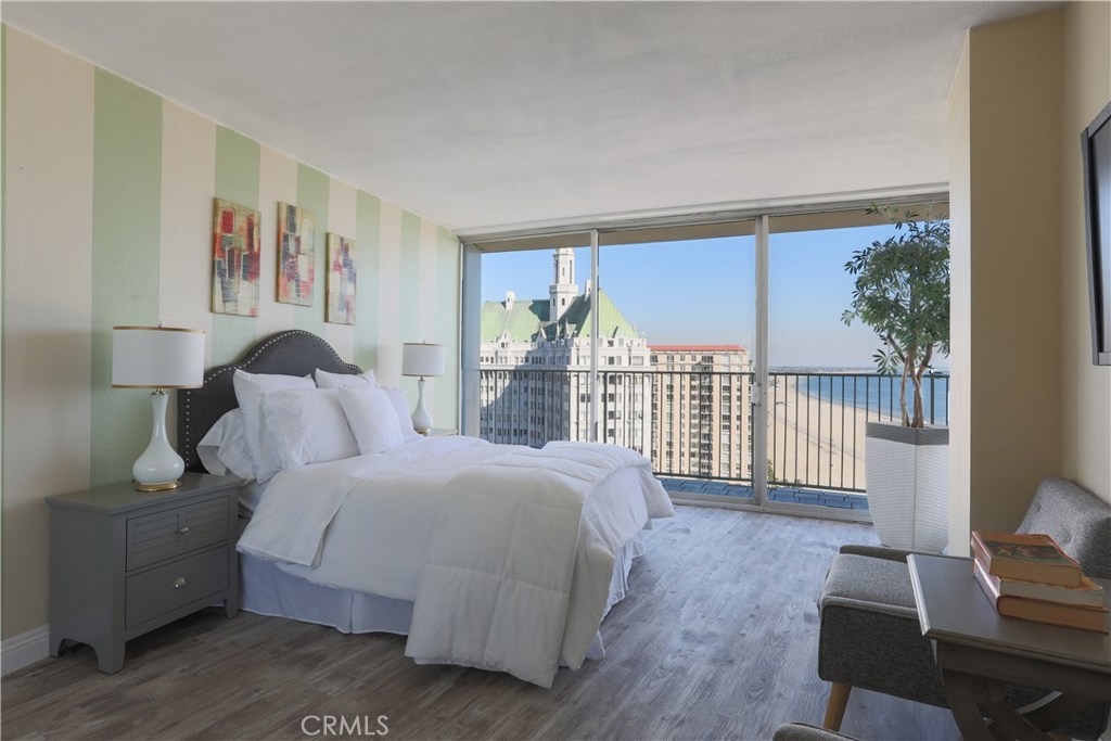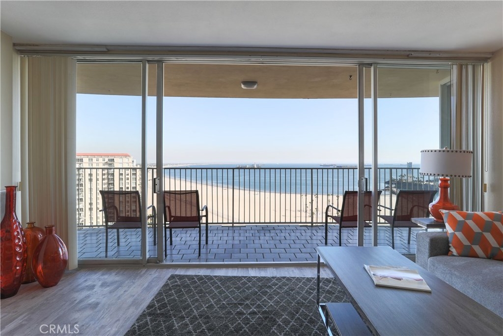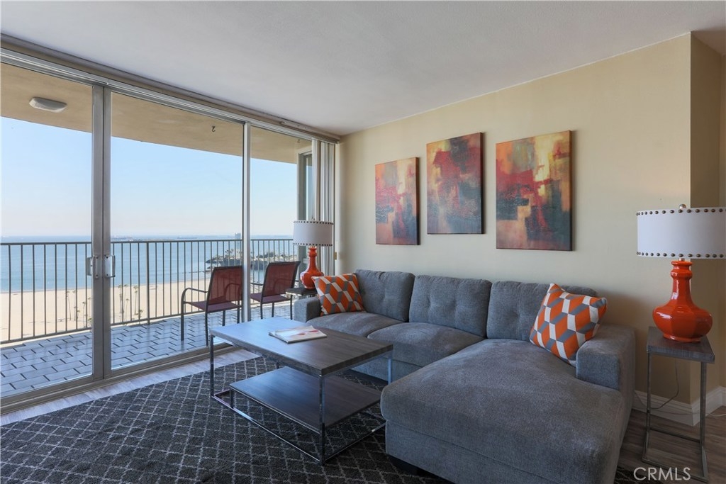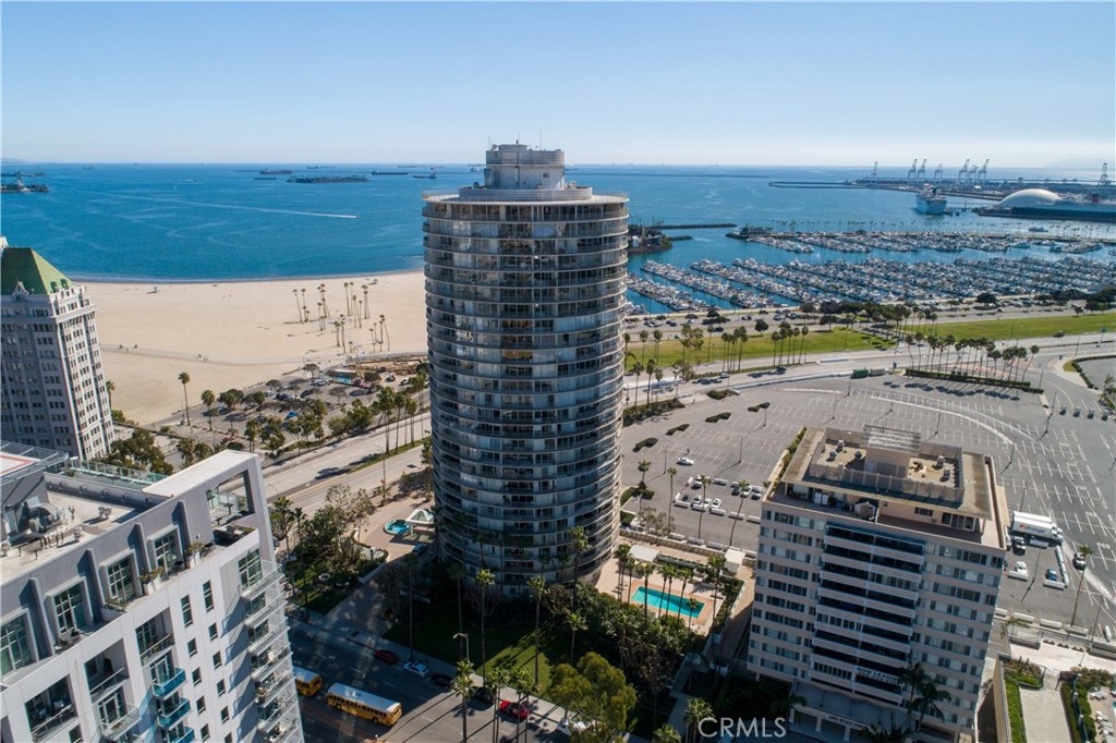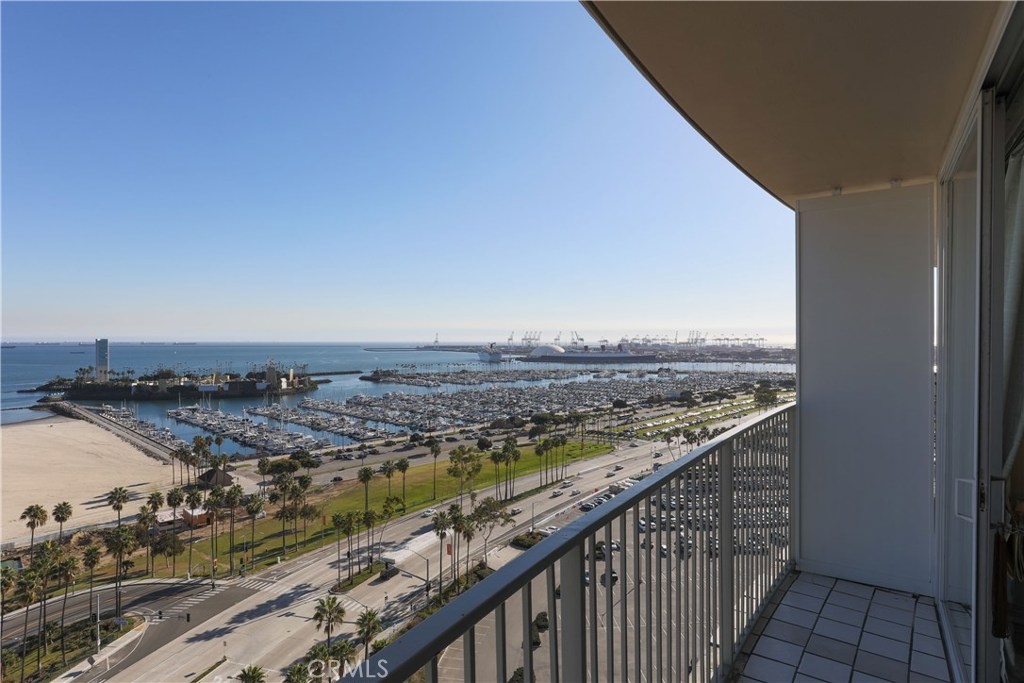 Unobstructed ocean views visible from nearly every spot in this 2 bedroom, 2 bath condo in the iconic International Tower. This home has a bright and open floor plan with fresh paint and brand new laminate floors throughout. Floor to ceiling glass sliding doors in the living room and both bedroom suites give access to the large balcony that wraps around the full width of the unit. The master bedroom features a walk-in closet, updated vanity and a shower/tub combo in the bathroom. The guest bedroom is currently used as an office with a murphy bed, cabinets, and desk all built in. Additional storage and mirrored closets line the hall leading to the guest bathroom. The International Tower features all the modern luxury amenities: 24/7 security and concierge, beautiful pool & spa, outdoor BBQ area, large fitness center, community room with full kitchen and a conference center all on the meticulously maintained grounds. Stackable laundry in the unit and two dedicated parking spots in the controlled access garage. Close to the best dining, shopping and entertainment that Downtown Long Beach has to offer!